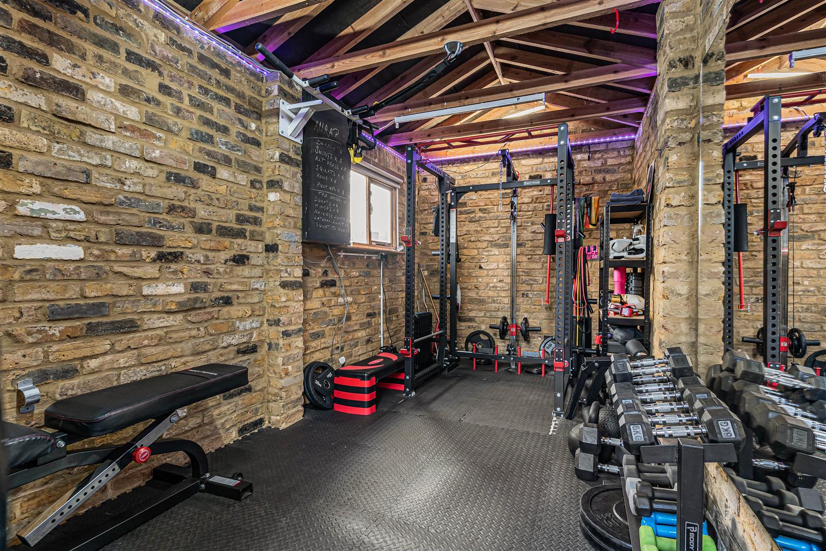 Outside, the rear garden provides a private space to relax and entertain. A terrace extends from the rear of the house, leading onto a lawned area. At the rear of the garden, the garage has been converted into a home gym, with gated access beyond providing off-street parking.