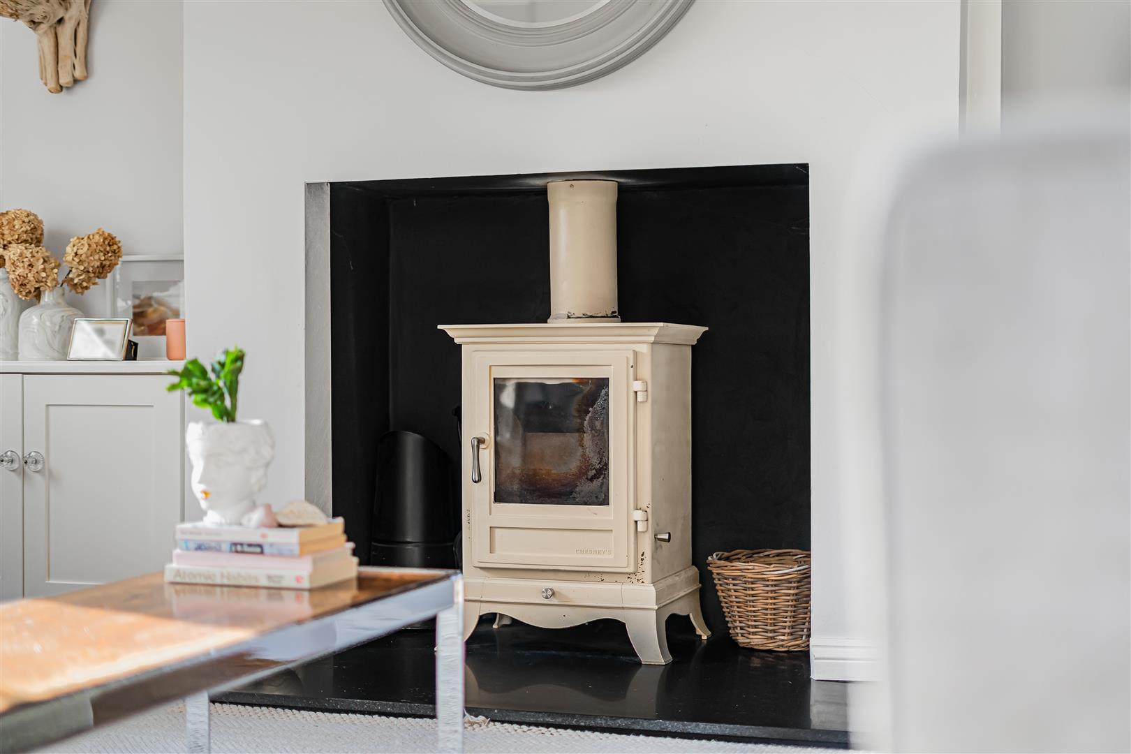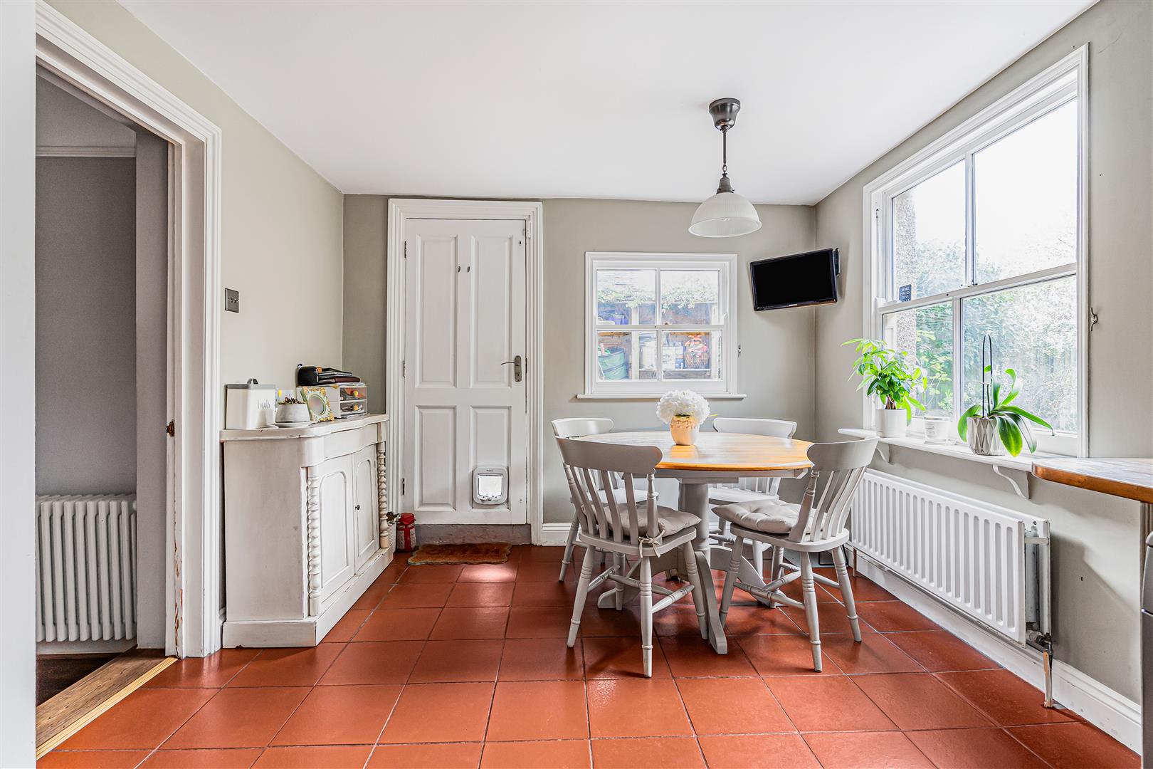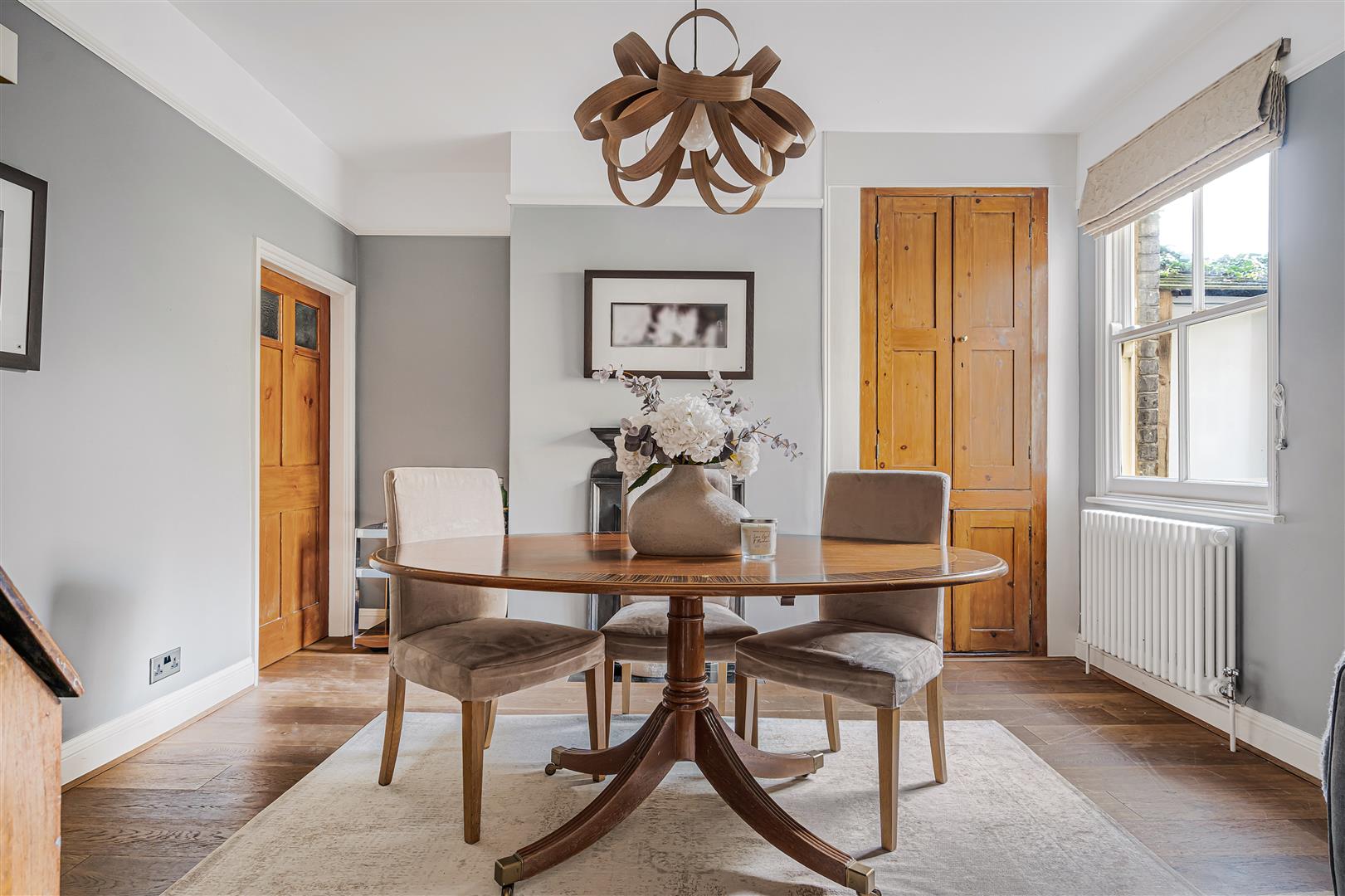 At the front of the property is a beautifully proportioned dual-aspect living room, filled with natural light and centred around a log burner. Built-in cabinetry to the chimney breast recesses and wooden flooring add both character and practicality.Behind, the dining room enjoys views across the garden and features a charming cast iron fireplace, continuing the warm and characterful feel.