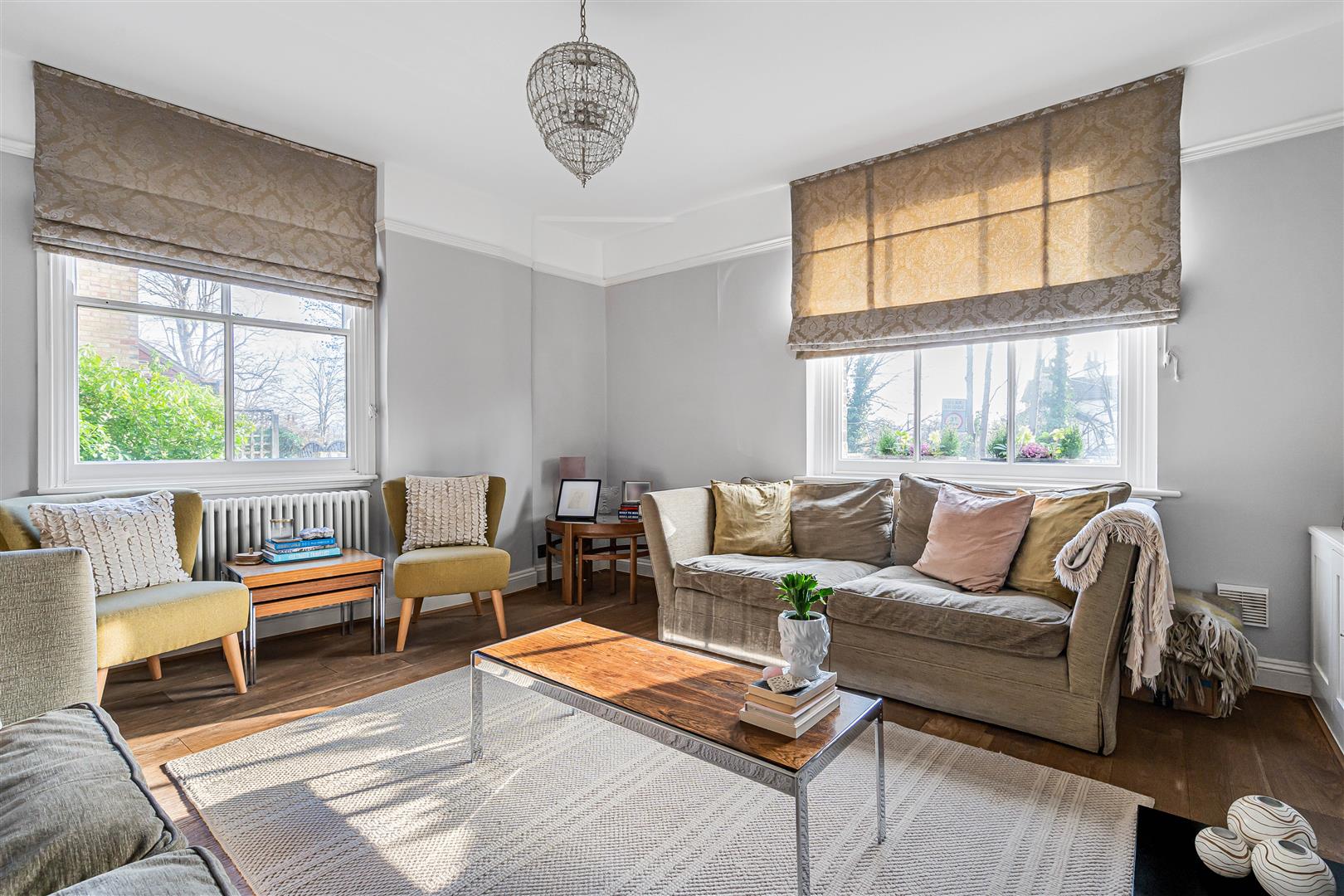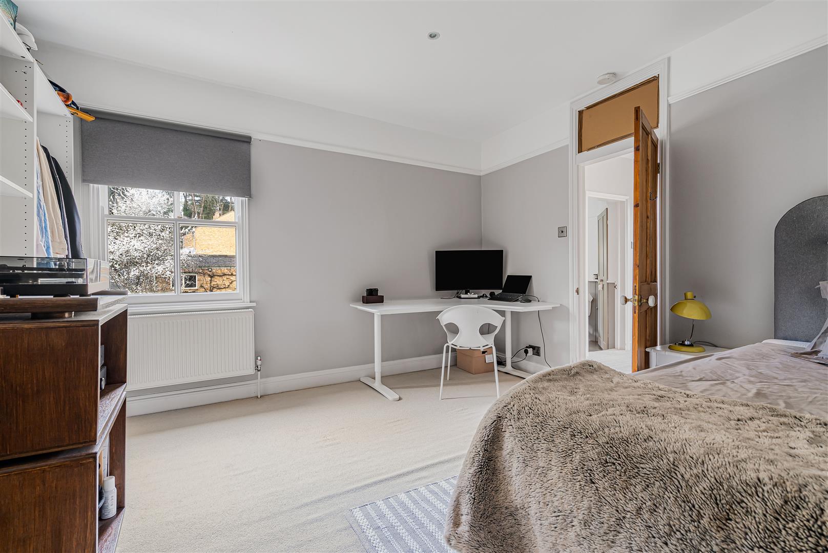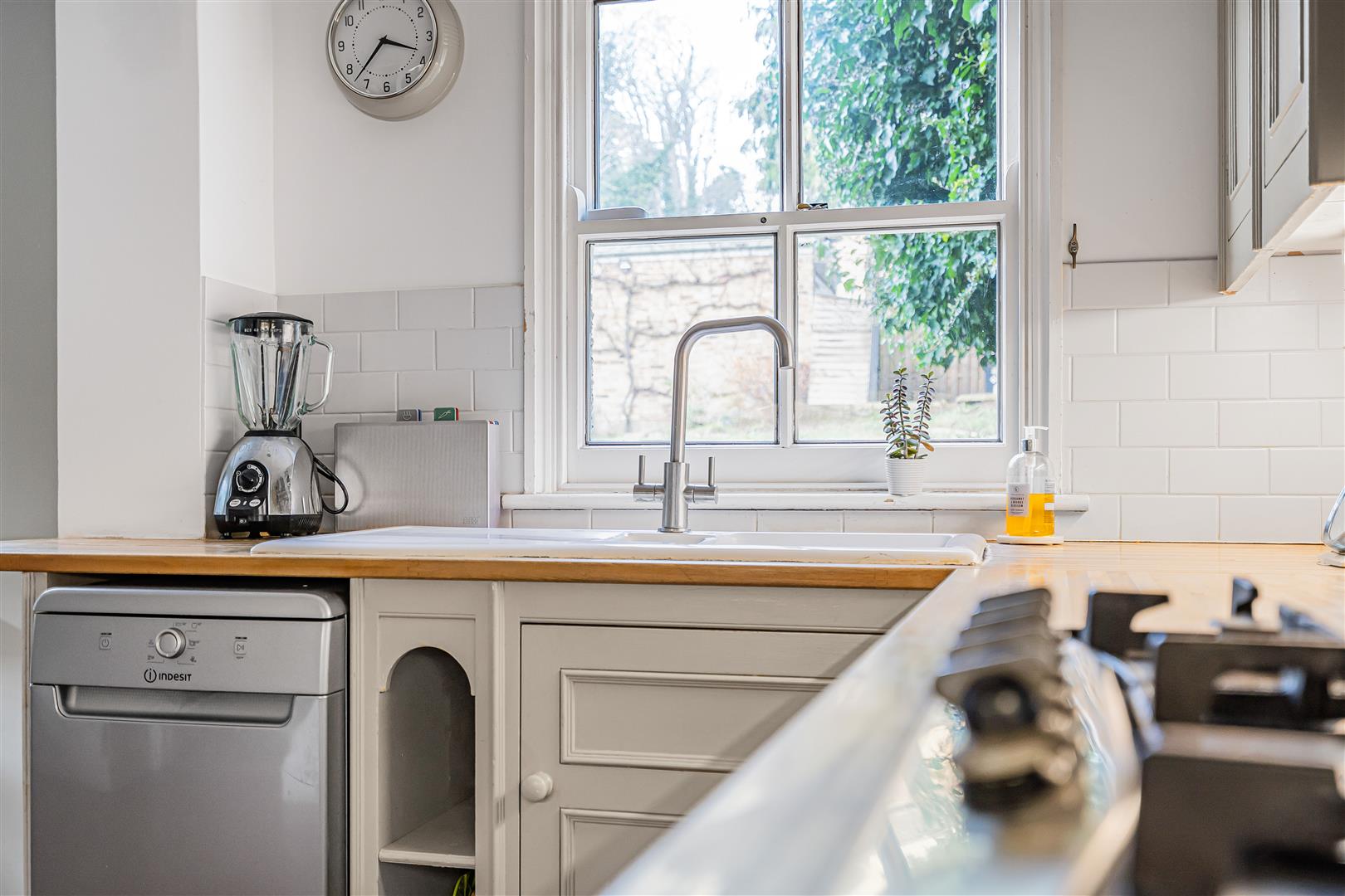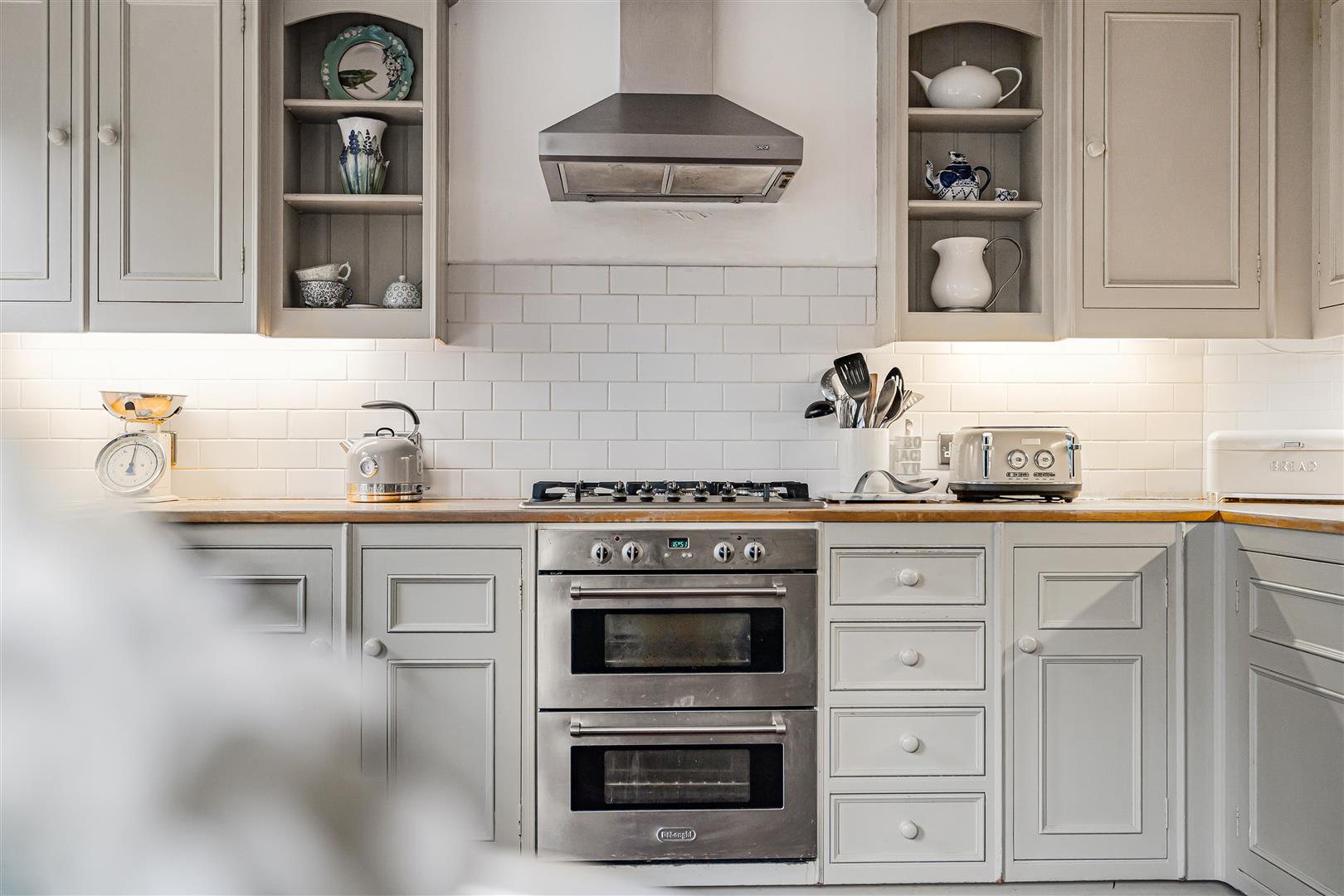 At the front of the property is a beautifully proportioned dual-aspect living room, filled with natural light and centred around a log burner. Built-in cabinetry to the chimney breast recesses and wooden flooring add both character and practicality.Behind, the dining room enjoys views across the garden and features a charming cast iron fireplace, continuing the warm and characterful feel.