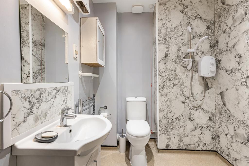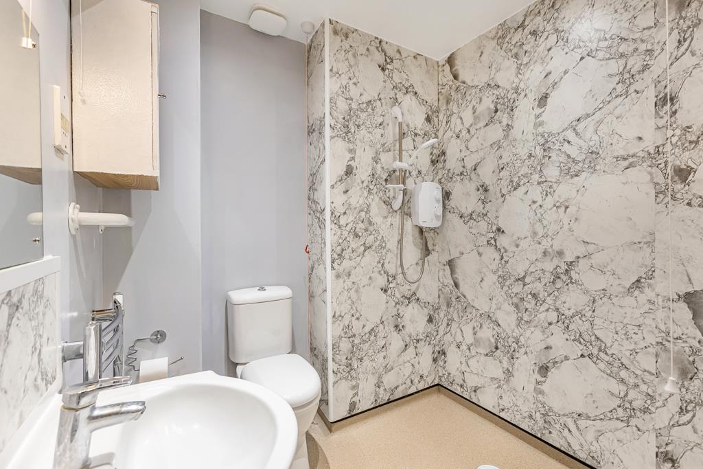 The bathroom has been modernised to make it into a sealed wet room, to include a shower, wash hand basin, WC, and heated chrome towel rail.