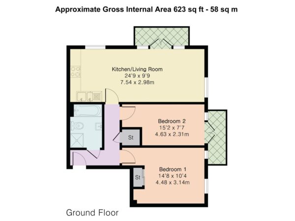 The property offers bright, well balanced accommodation throughout, centred around a spacious open plan living, kitchen and dining area with French doors opening onto the first terrace, which in turn leads to the communal gardens beyond. This creates a wonderful extension of the living space and a secure, peaceful setting to sit and relax.The principal bedroom provides ample space for wardrobes and furnishings, while the second bedroom benefits from French doors opening onto a further private sun terrace, making it an ideal guest room, home office or additional sitting space. A modern bathroom and generous entrance hall complete the internal layout.