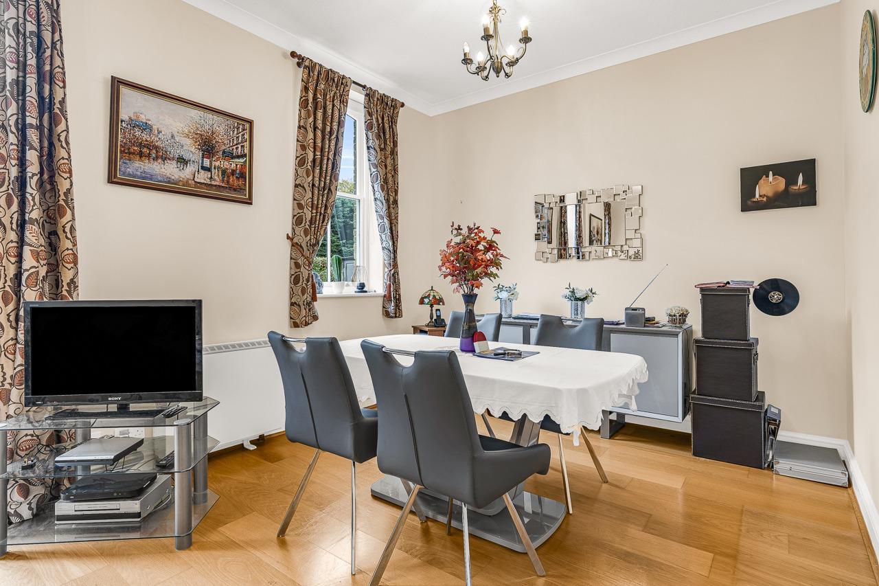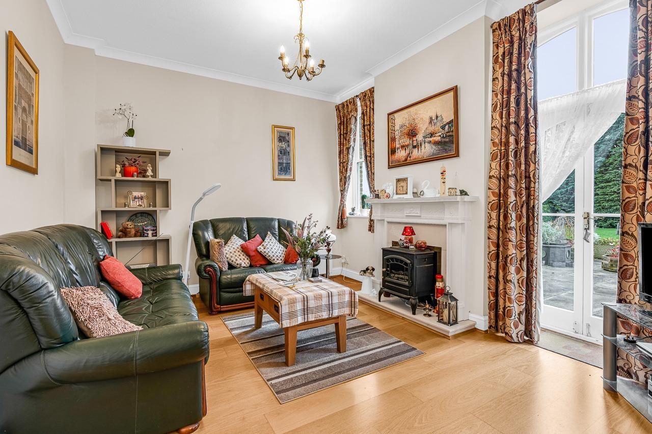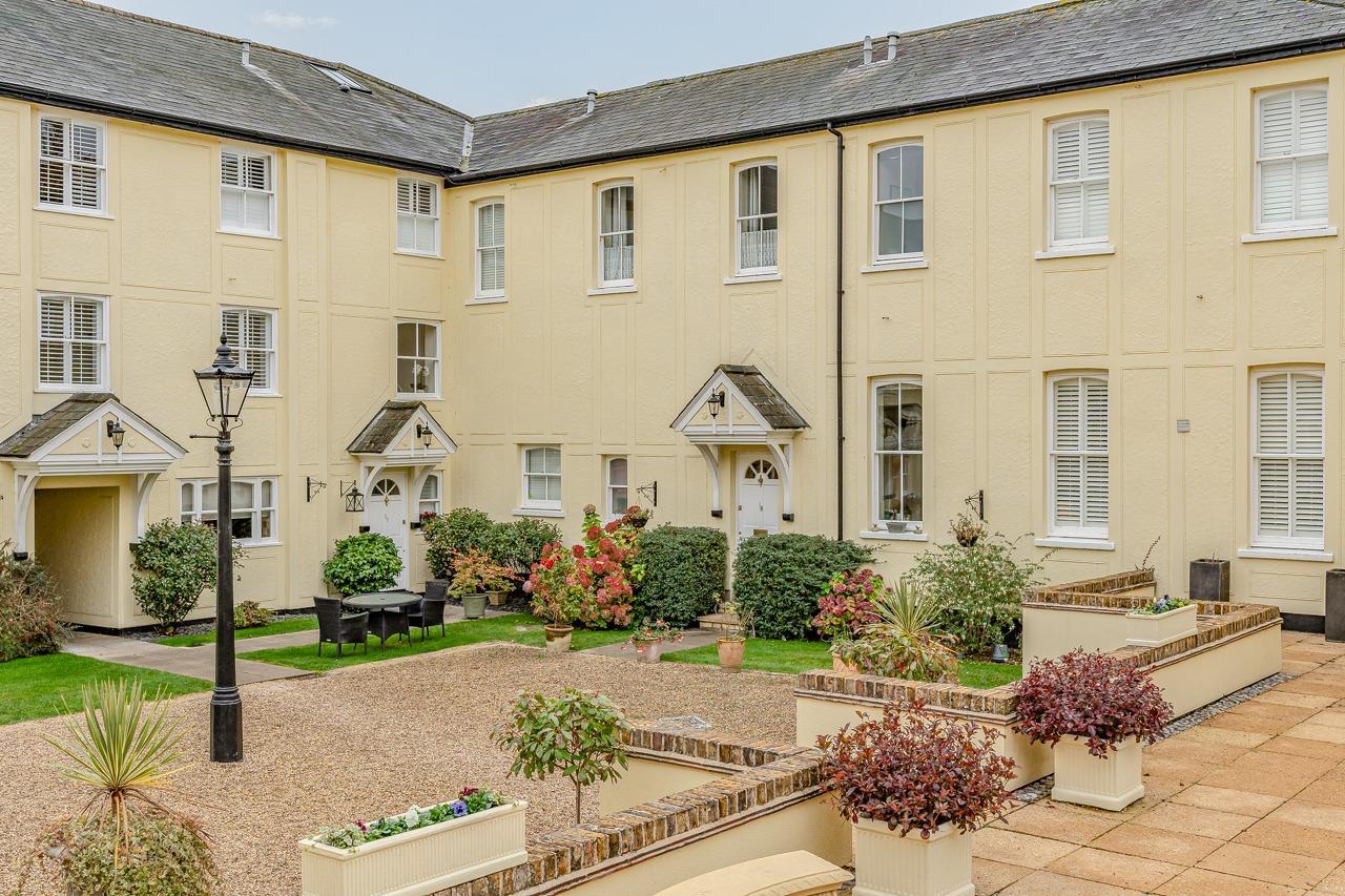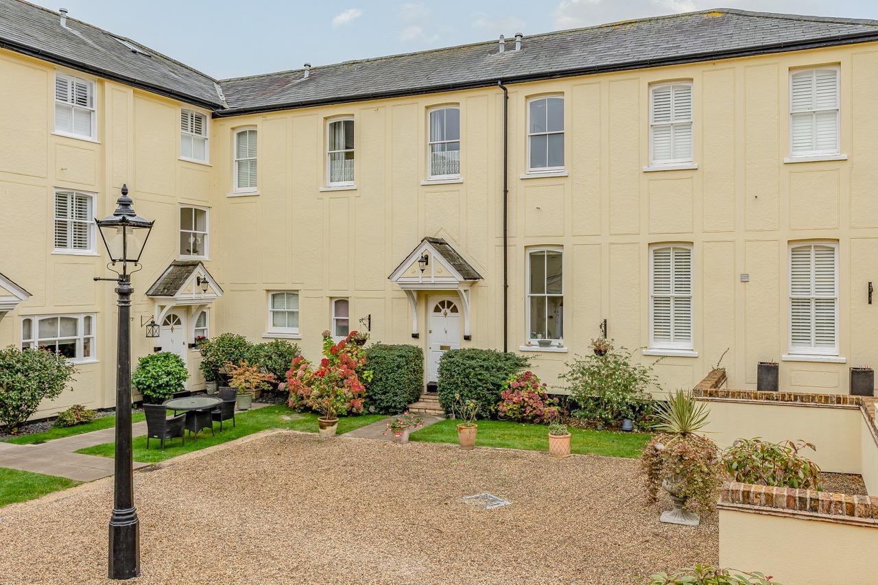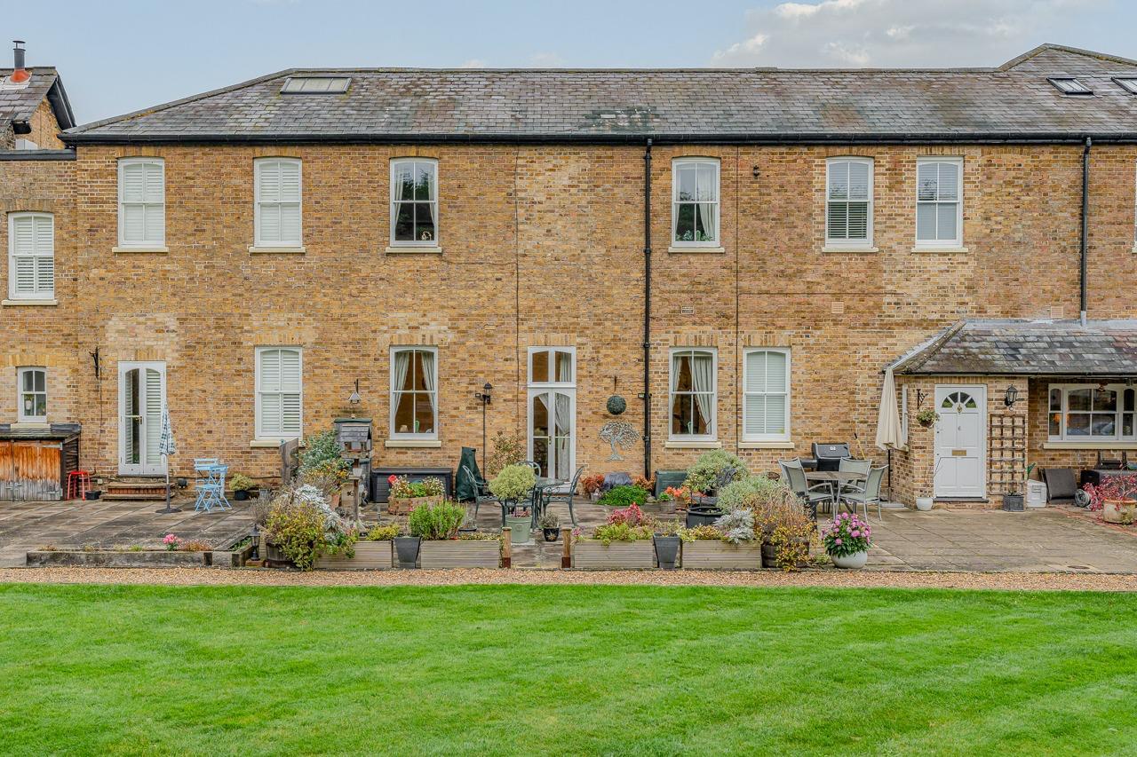 This elegant home blends period character with modern comfort, offering direct garden access, beautiful decorative details, and abundant natural light through dual-aspect sash windows and French doors.A sweeping driveway leads to the central courtyard, enhancing the property’s picturesque setting. The south-facing communal garden at the rear provides a peaceful retreat. Inside, the hallway leads to a cloakroom WC, while the bright lounge/dining room overlooks the gardens. The front-facing kitchen features fitted cupboards, worktops, and appliance spaces.