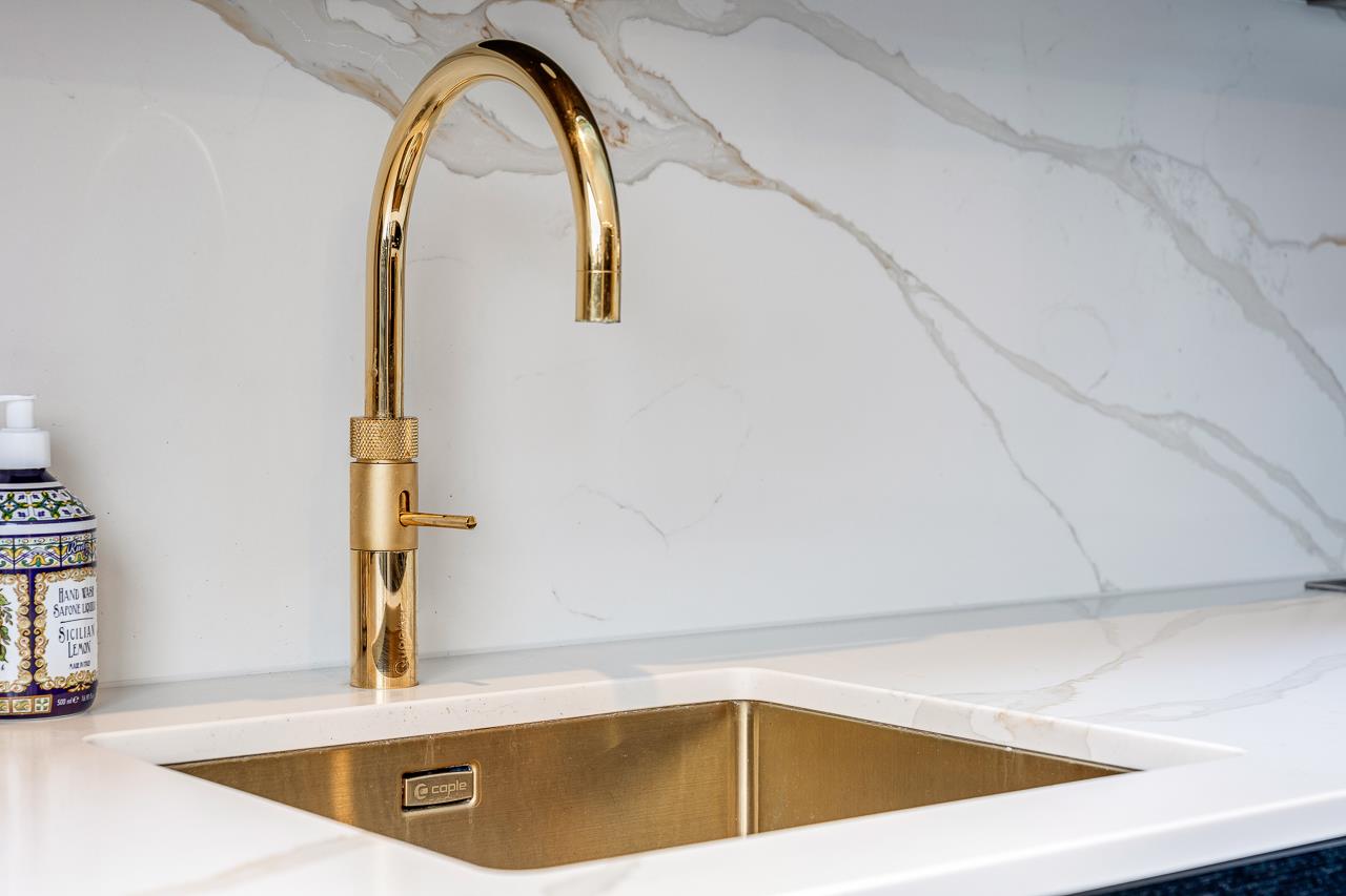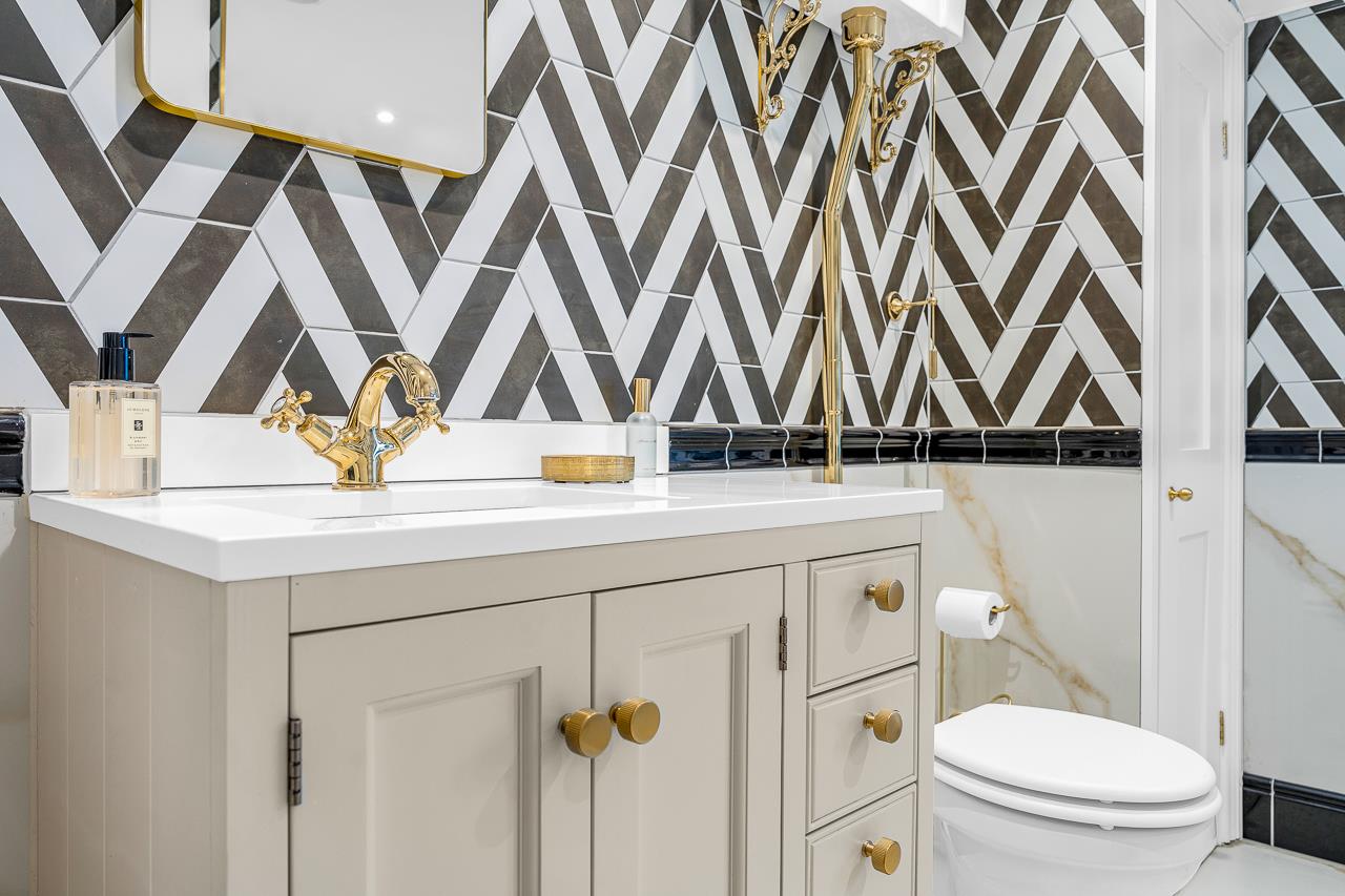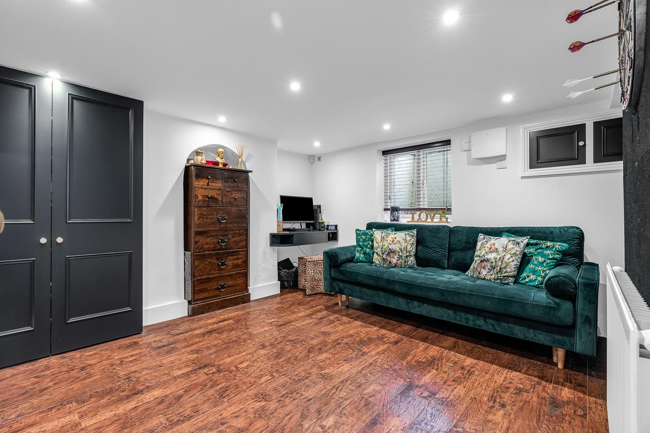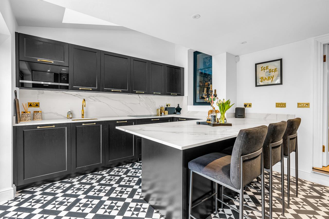 To the rear, the kitchen is the clear centrepiece of the home. Recently extended and upgraded, it combines bespoke cabinetry, quartz worktops with breakfast bar, integrated appliances and period-style flooring. A skylight floods the space with natural light, while Crittall-style doors open directly onto the garden – perfect for both everyday living and entertaining.