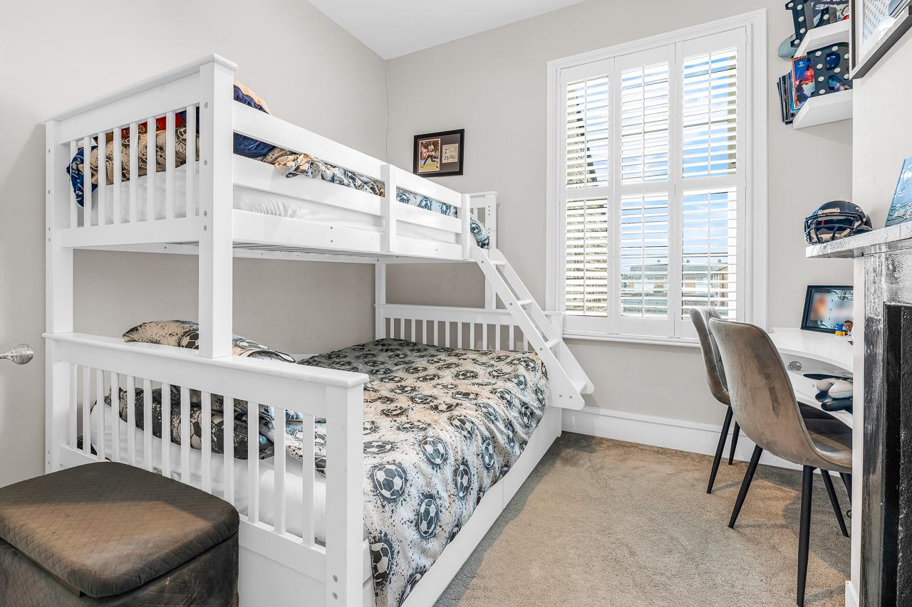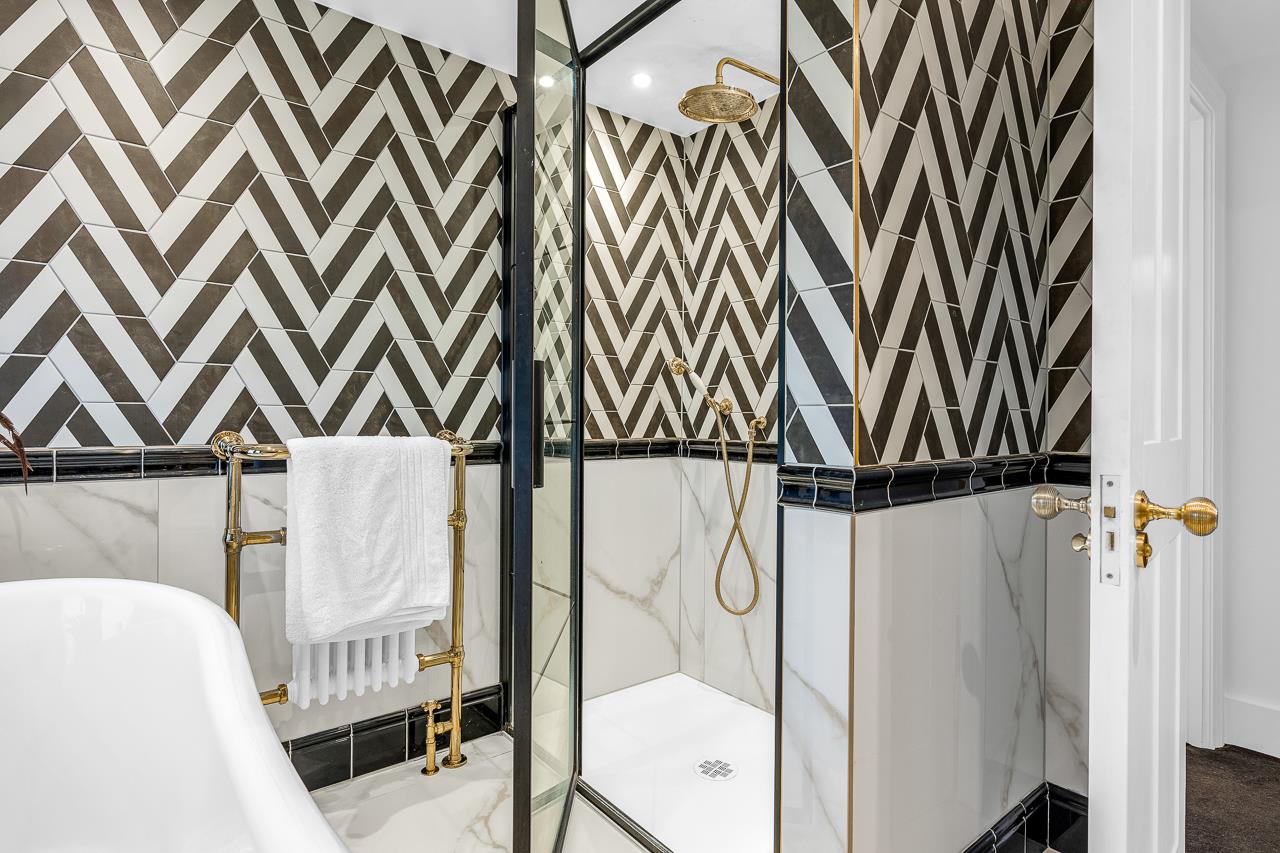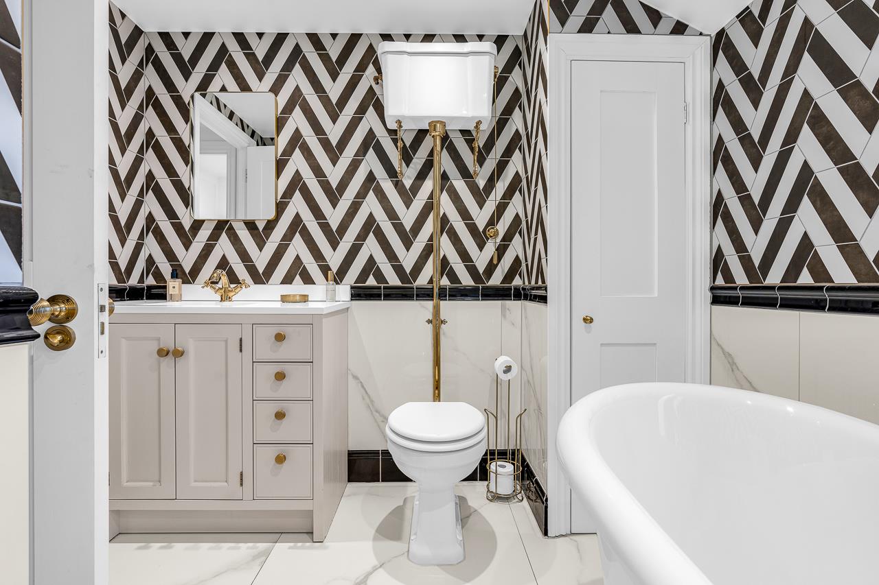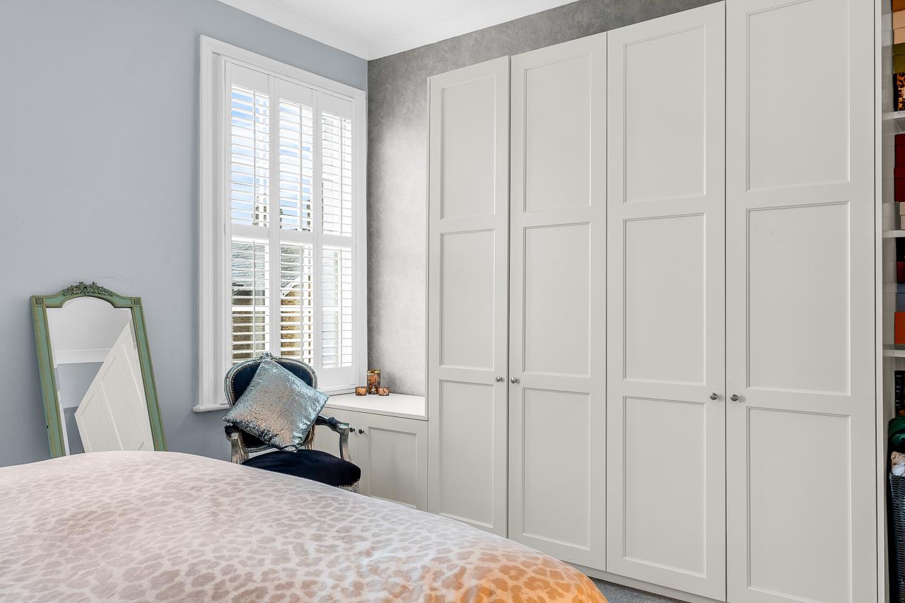 The first floor hosts a superb principal bedroom with bespoke fitted wardrobes, twin sash windows and shutters. Bedroom two is a generous double with a cast iron fireplace, built-in desk and shuttered sash window. The family bathroom is a standout, featuring a walk-in shower, freestanding roll-top bath, statement tiling, vanity unit and Victorian-style fittings, with a separate WC completing the floor.