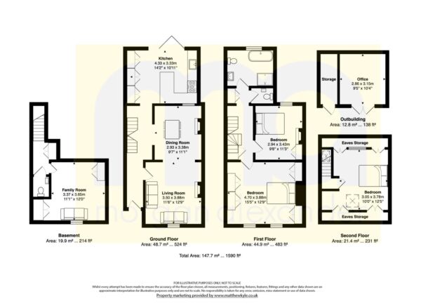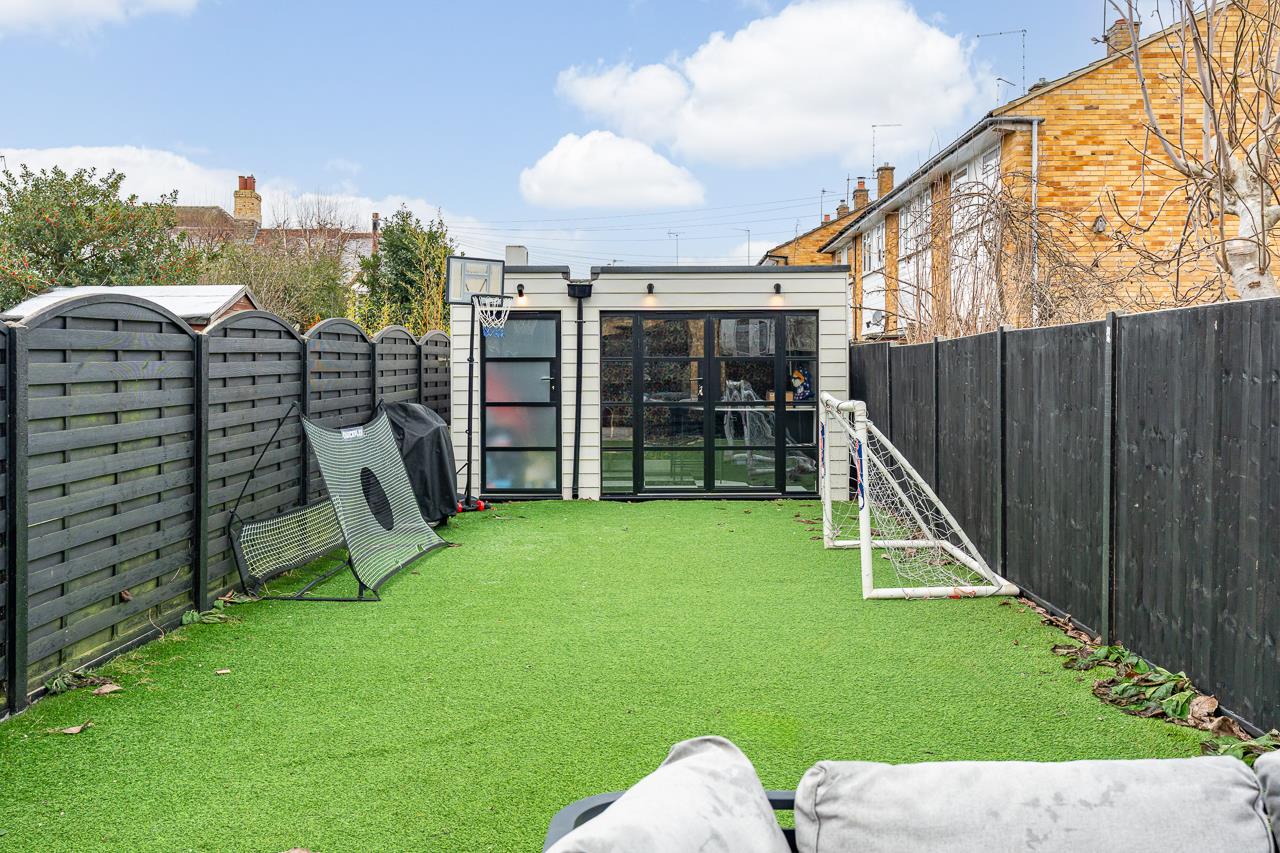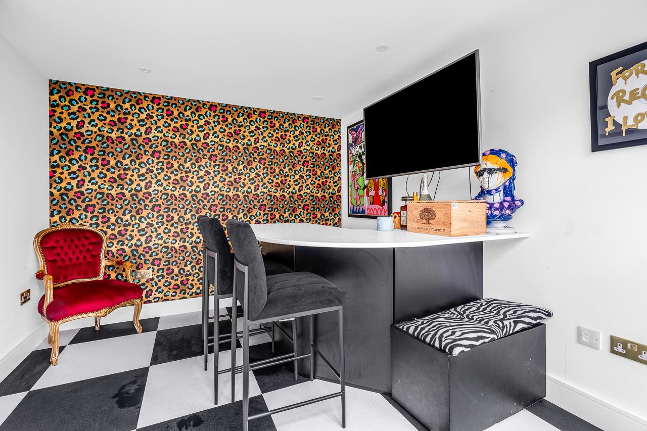 Outside, the rear garden is ideal for family use and outdoor dining, with patio seating, artificial lawn and a substantial outbuilding currently used as a bar, equally suitable as a home office or gym, with additional storage.