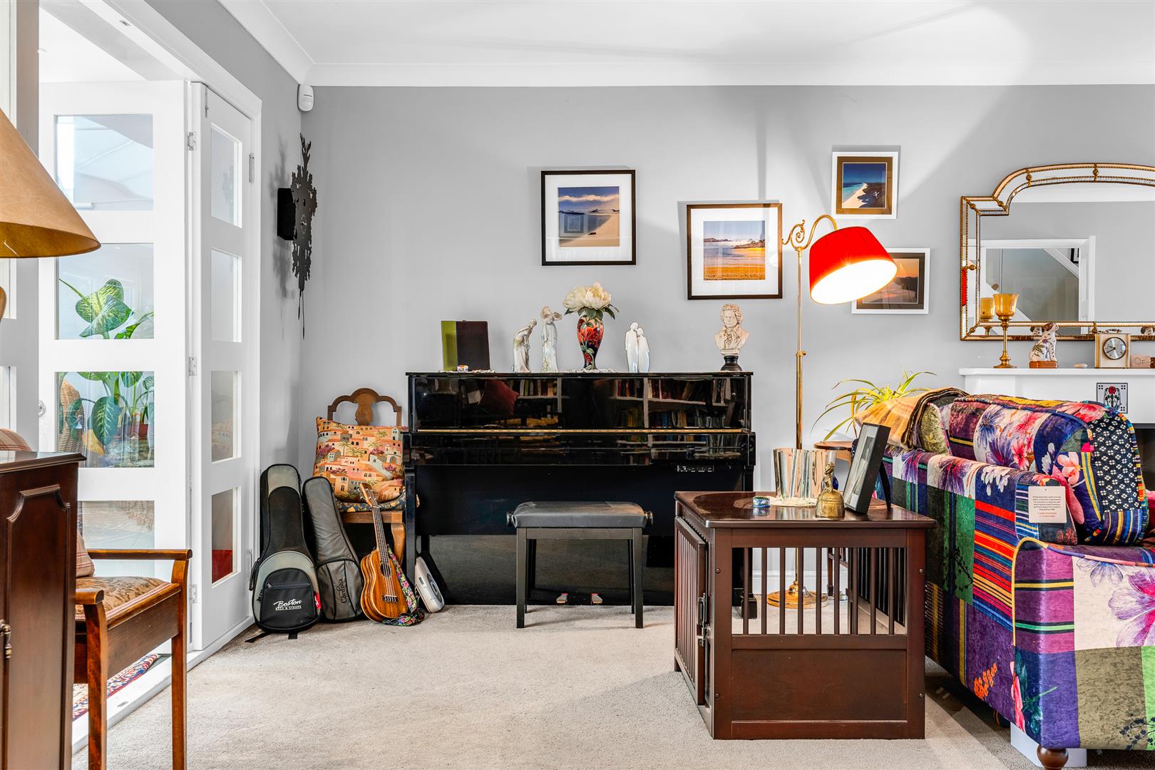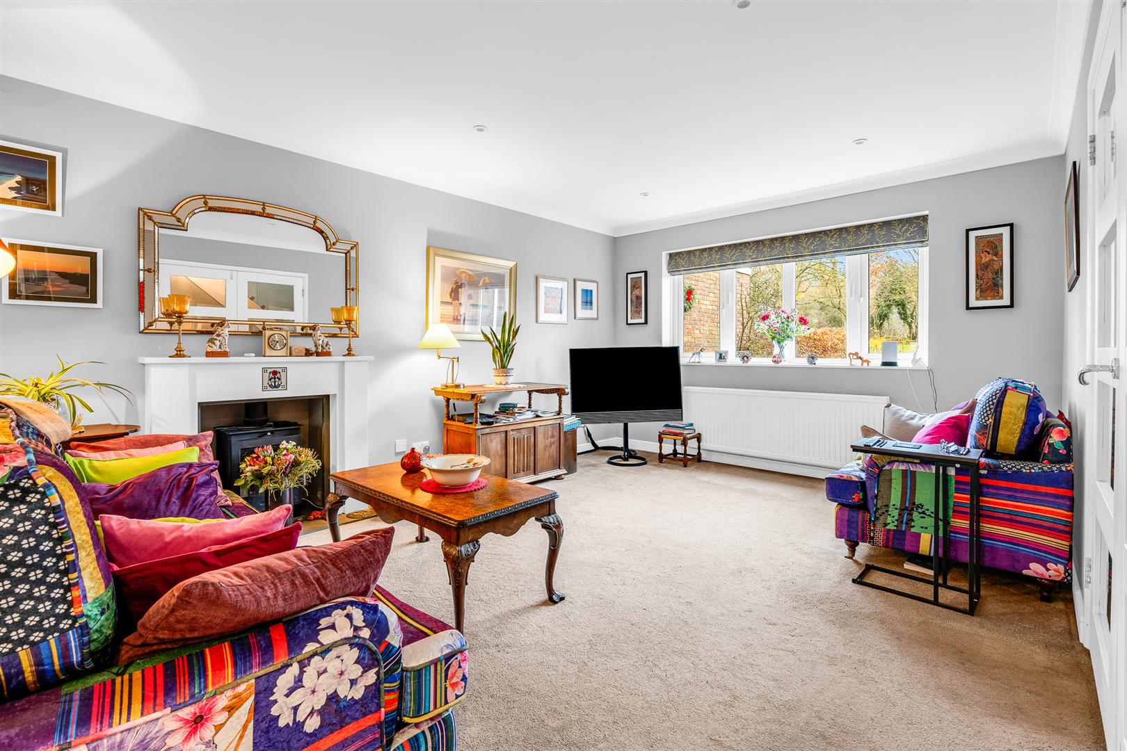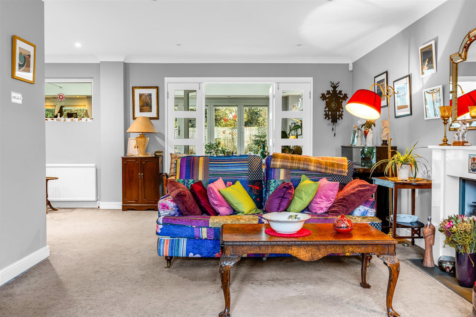 The living room is a generous, welcoming space with views to the front, featuring an open fireplace and double doors that lead back to the entrance hall.