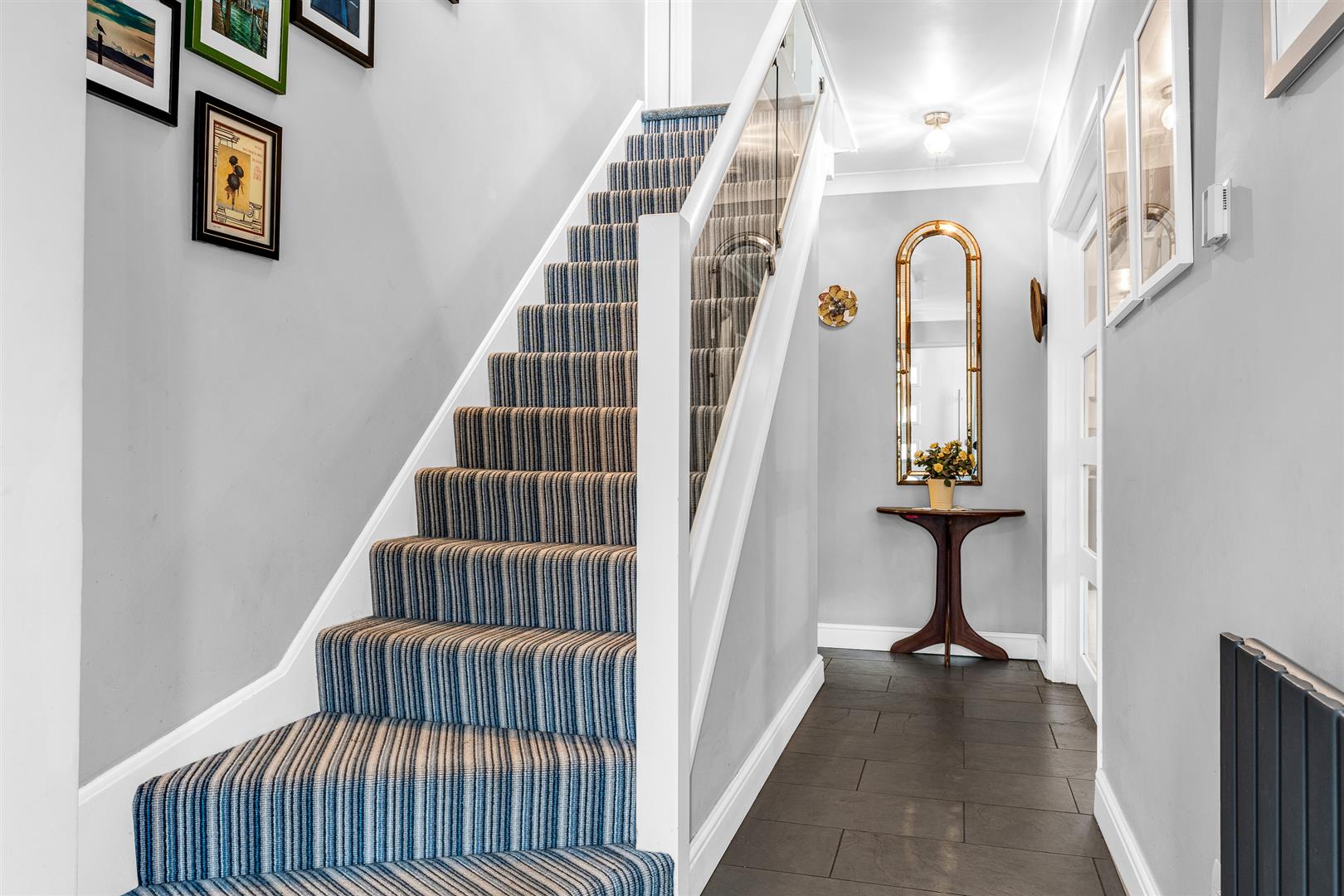 The property enjoys a wide frontage, and on arrival the front door opens into a generous entrance hall featuring Brazilian slate flooring with underfloor heating, a ground-floor cloakroom/WC, and a staircase rising to the first-floor landing.