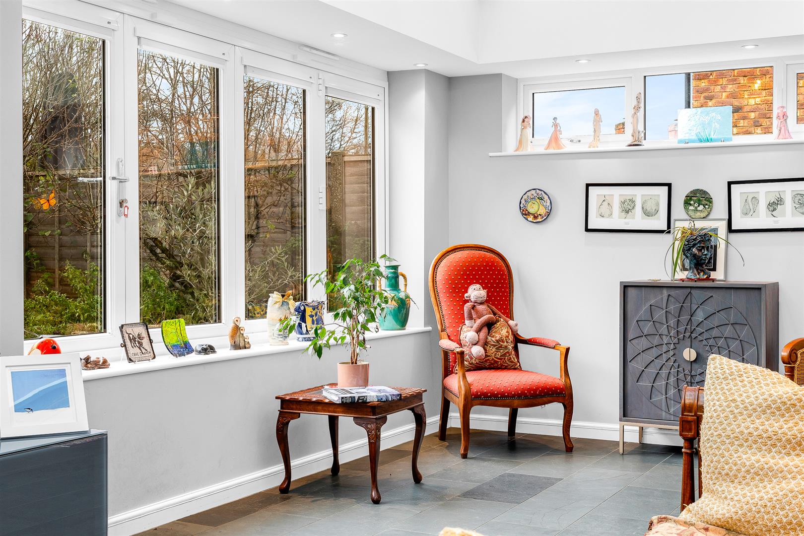 The principal ground-floor living space is an impressive, spacious family room with bi-folding doors and windows opening onto the rear garden. Highlights of this room include Brazilian slate flooring with underfloor heating, a UV smart-glass roof with electric opening windows and blinds, and fitted manual blinds to the bi-folds. This room flows seamlessly into the kitchen and also benefits from oak bi-folding doors leading through to the living room.