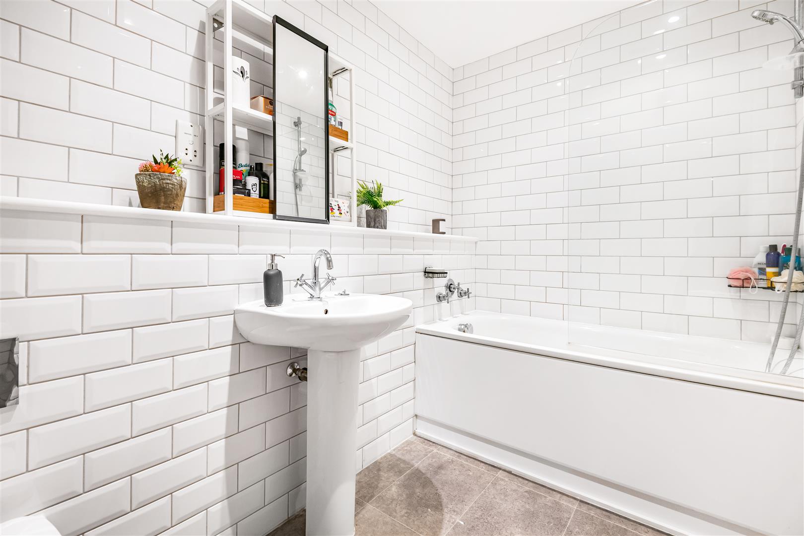 The bathroom is finished in a clean white suite, well-sized and functional, with a shower over the bath. Simple, modern, and in line with expectations.