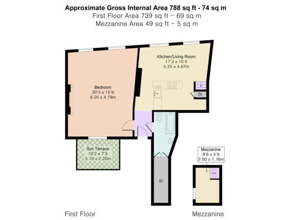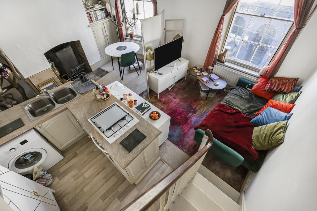 The accommodation is accessed via its own private street level entrance, leading into a welcoming hallway. The main living space is open plan, incorporating a kitchen/living room that enjoys an abundance of natural light and elevated views across Parliament Square, providing a vibrant and ever-changing outlook. The bedroom is generously proportioned, also benefiting from the same attractive views, while a well-appointed bathroom and useful storage cupboards add to the practicality of the home. A mezzanine level offers additional flexible space, ideal for storage or occasional use.