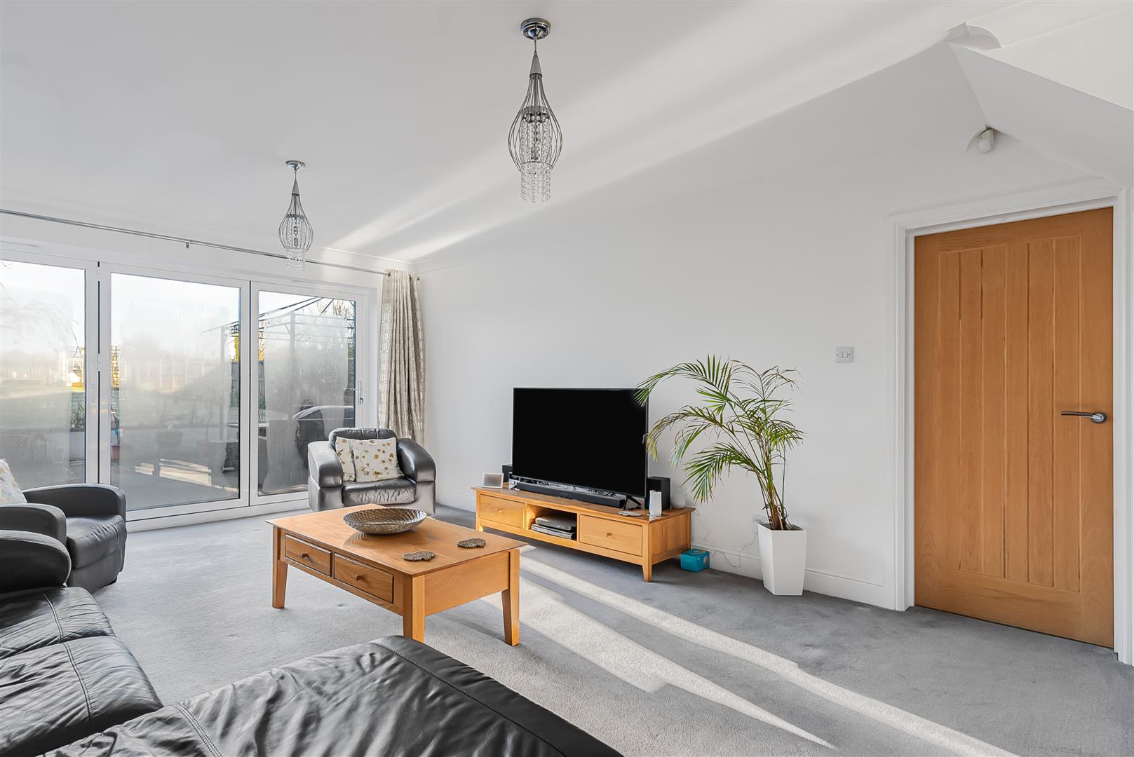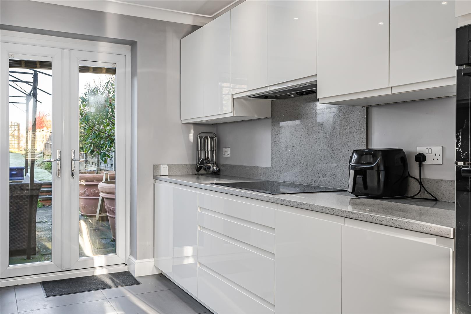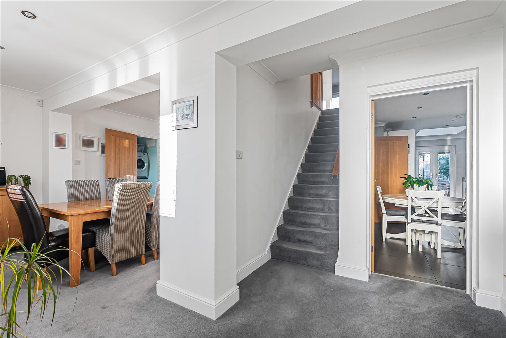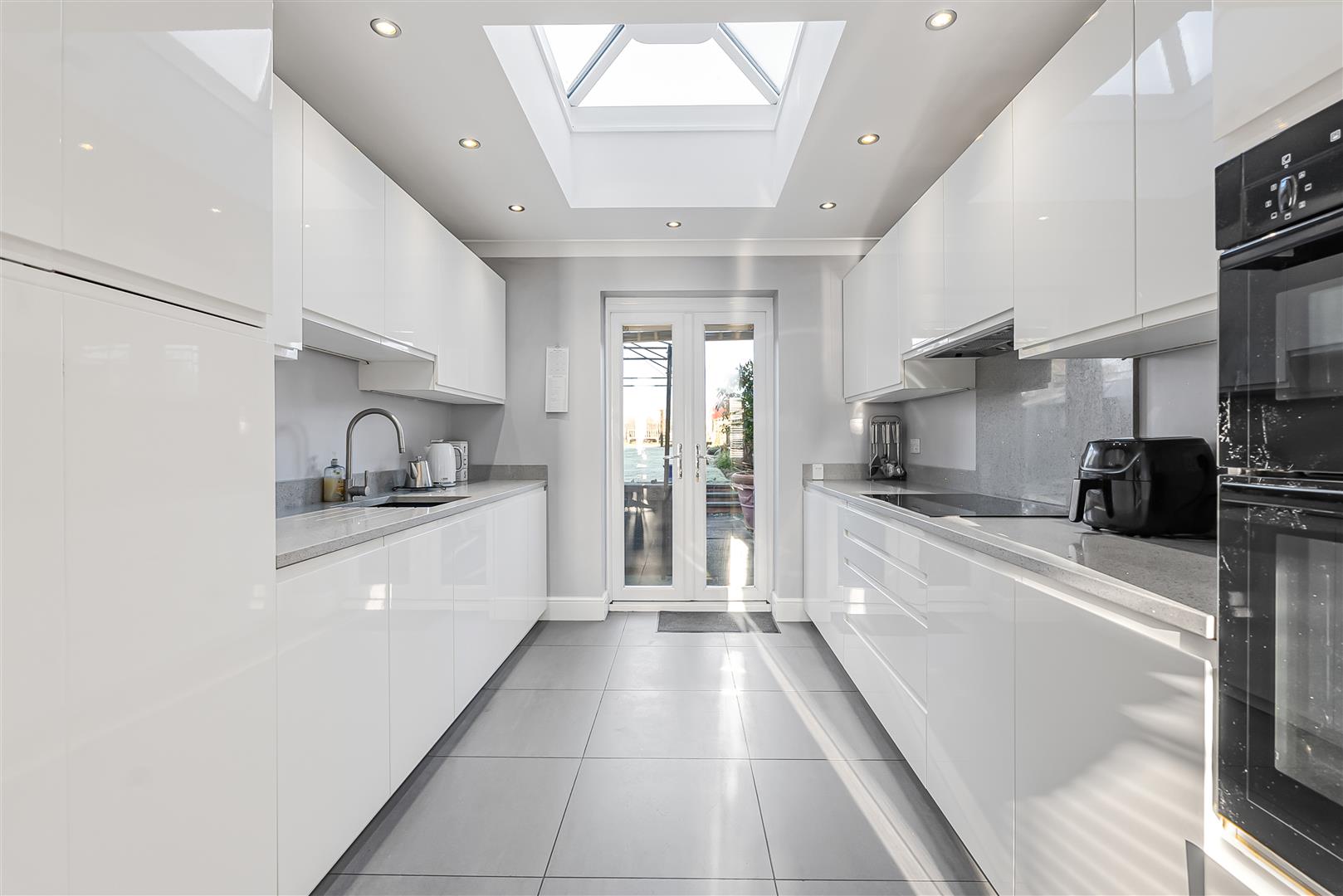 The accommodation begins with a welcoming entrance hall. At the heart of the home is the bespoke kitchen, well equipped with integrated appliances, a skylight providing excellent natural light and French doors opening onto the rear garden. There is ample space for a dining table, making this a true everyday living area.