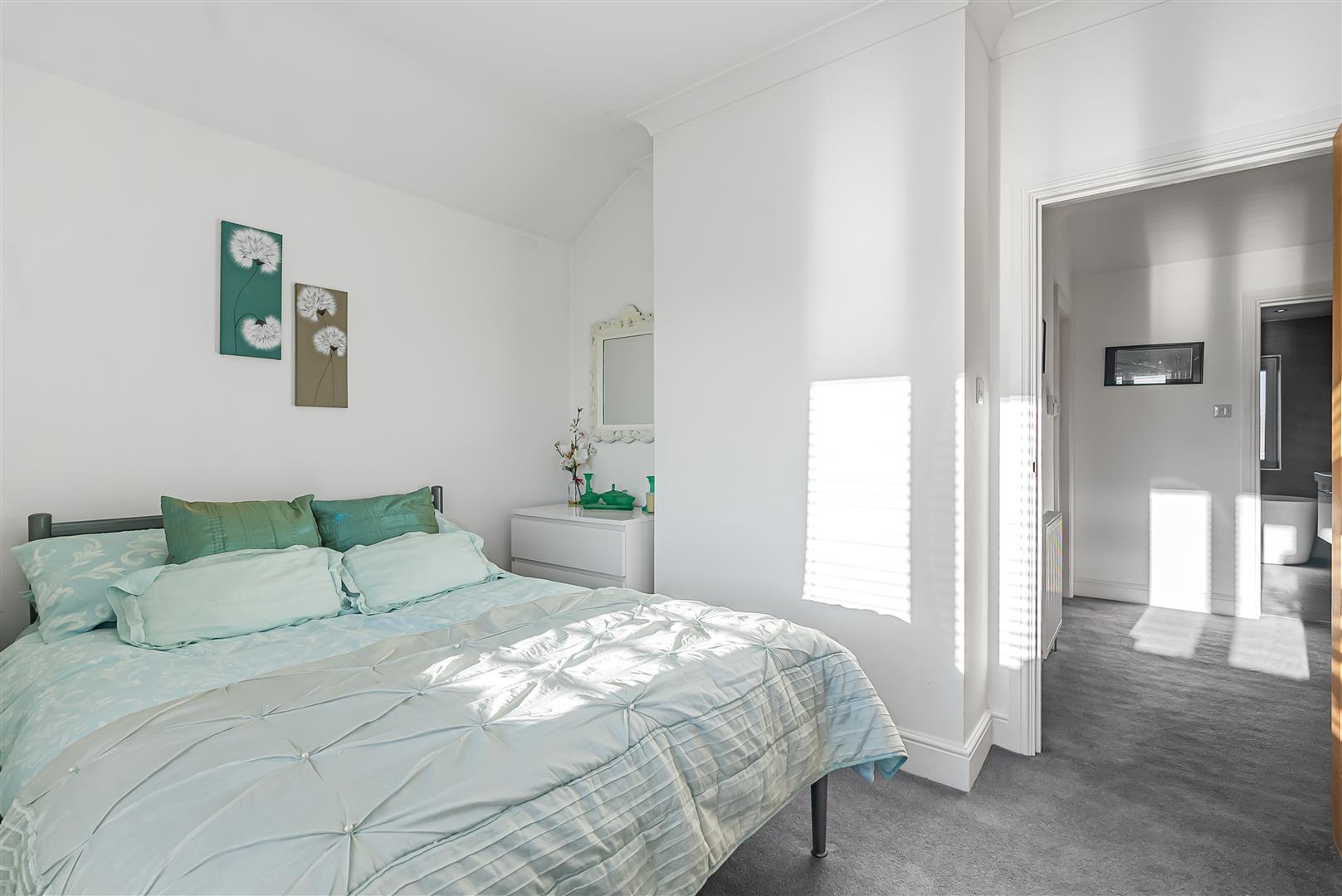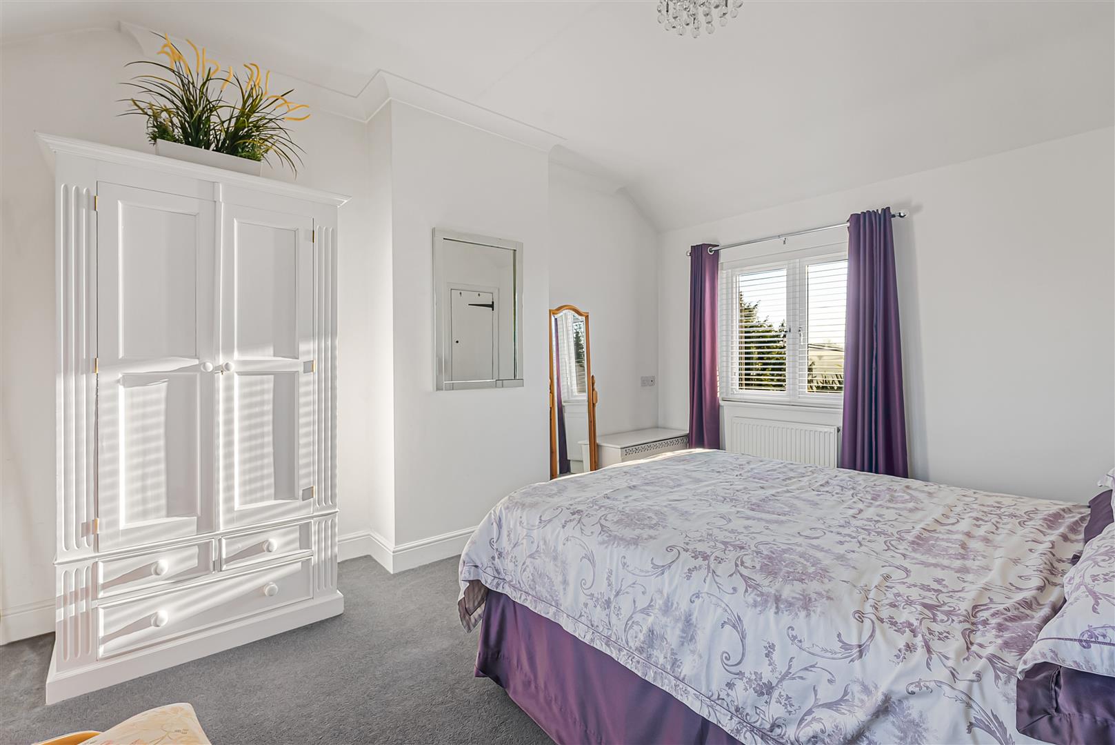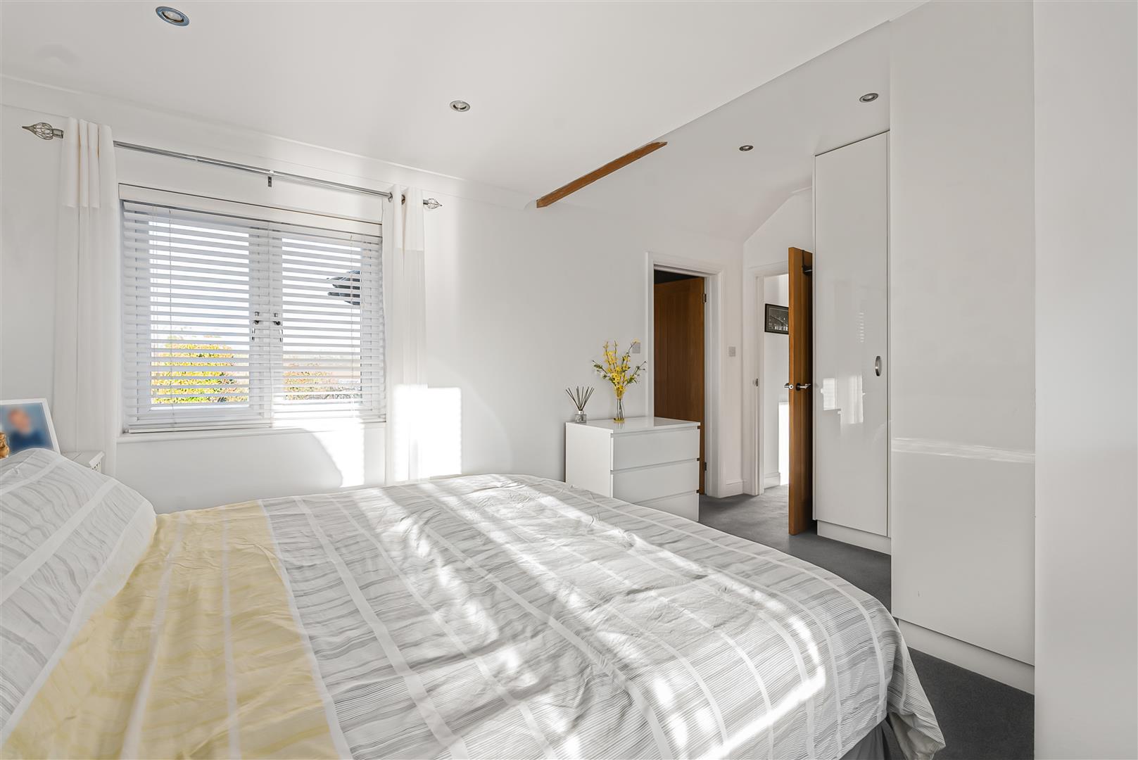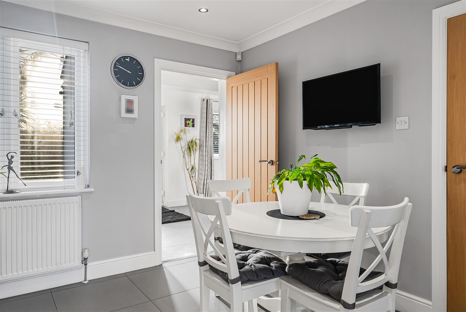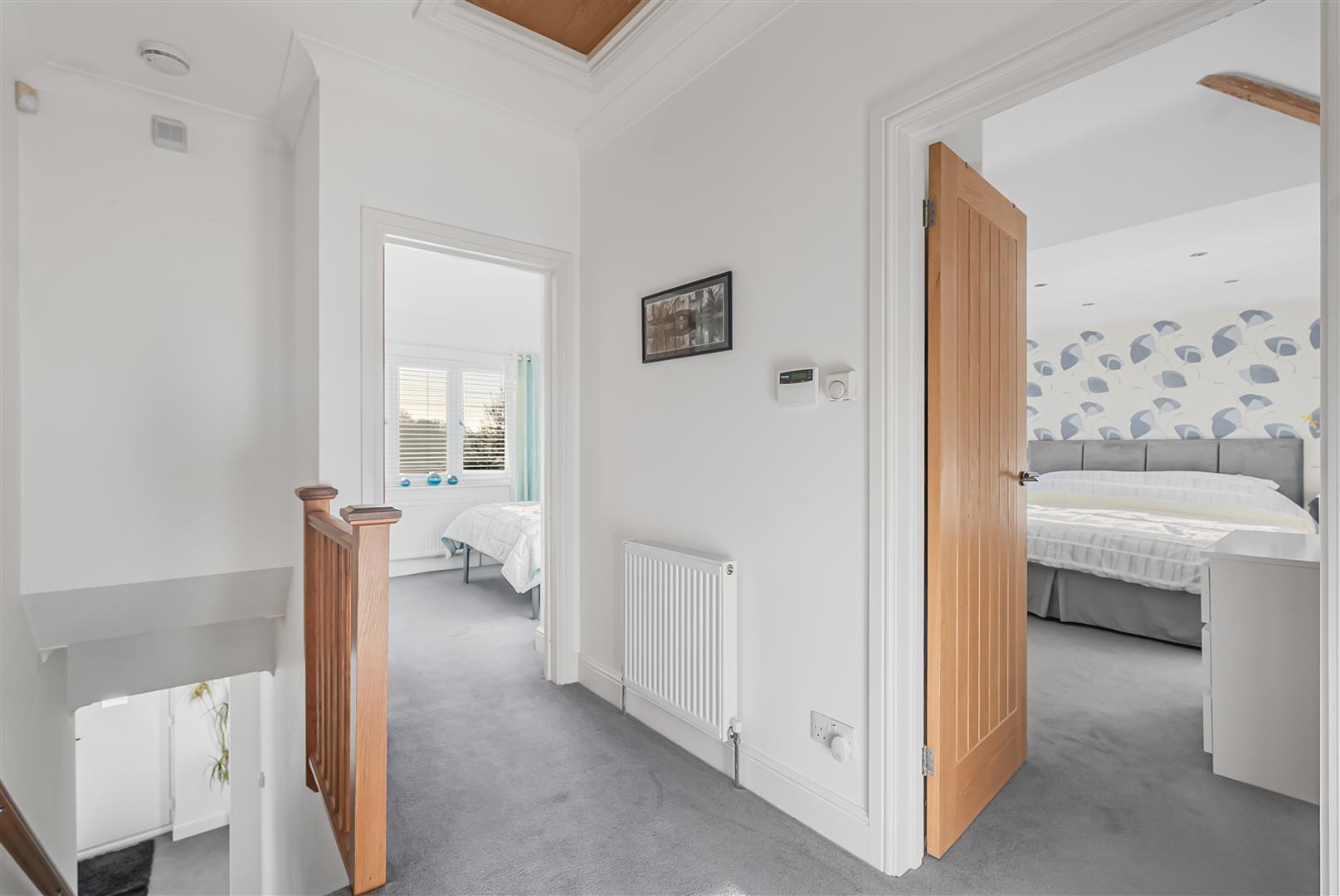 To the first floor, the main bedroom features fitted wardrobes and a stylish en suite shower room. Two further well-proportioned bedrooms are served by a modern family bathroom.