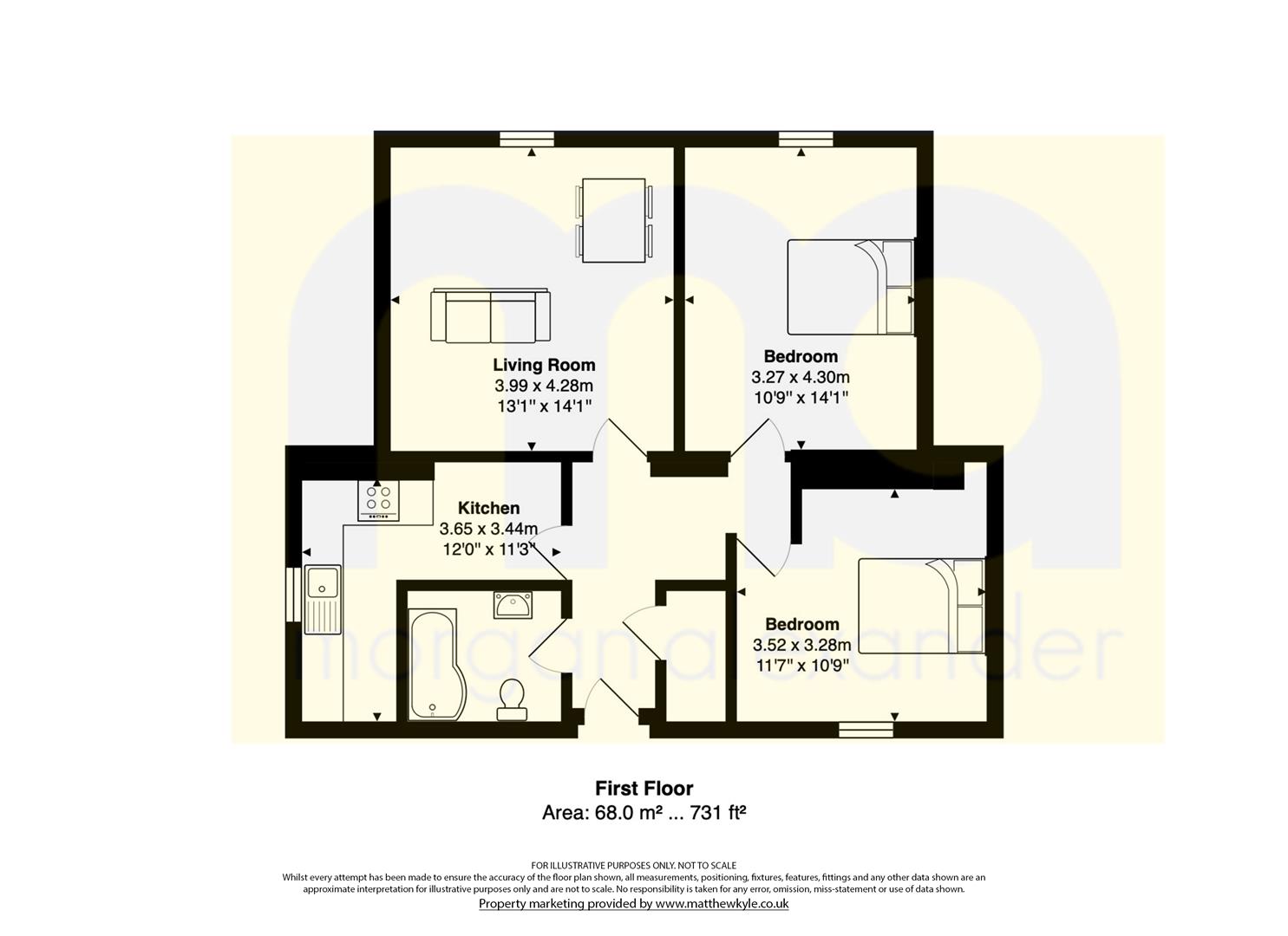 The property opens into a welcoming entrance hall, leading through to a generous living room with plenty of space for both seating and a dining table – a real advantage at this price point. The fitted kitchen is separate, enjoys a window for natural light and offers good storage and worktop space.