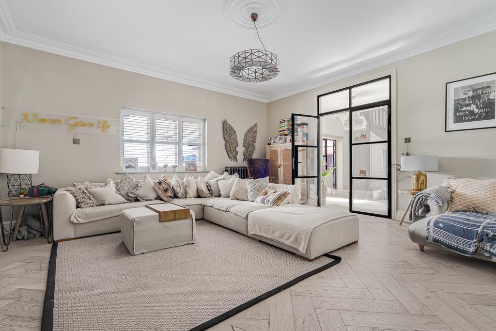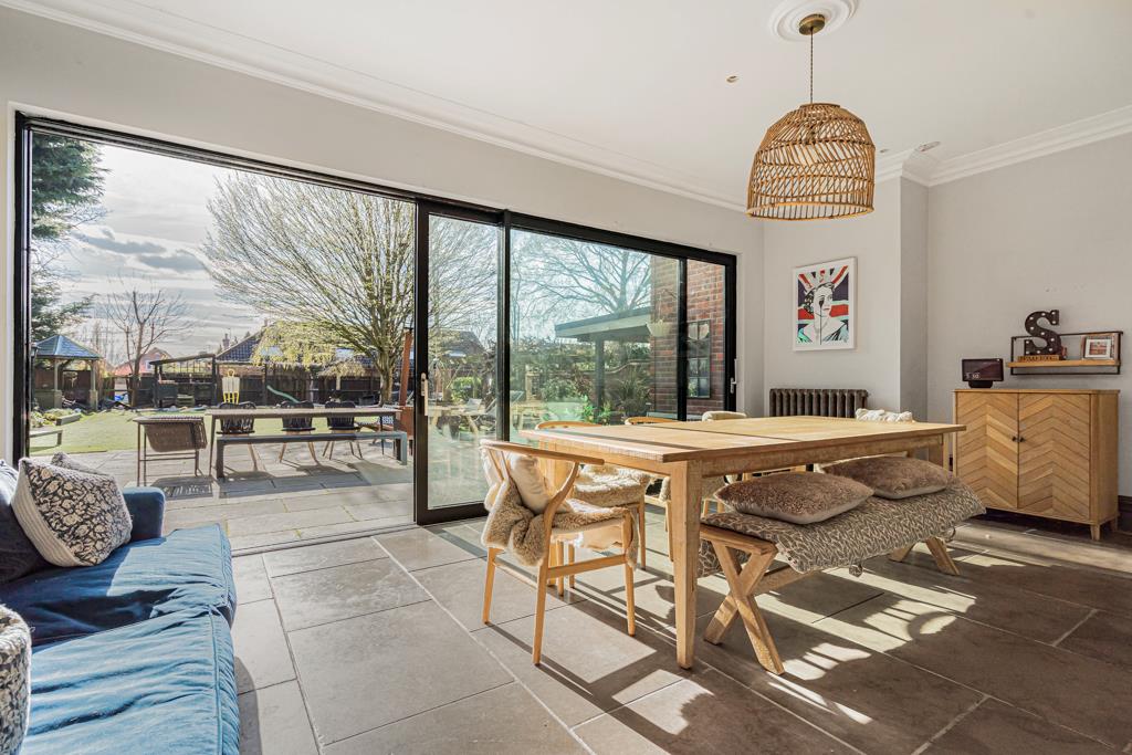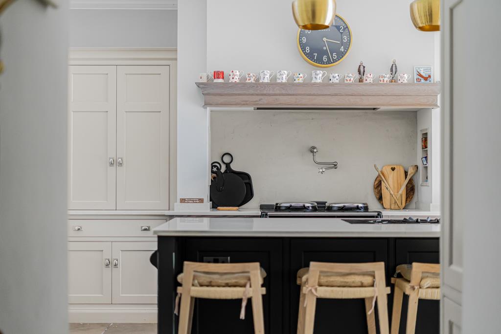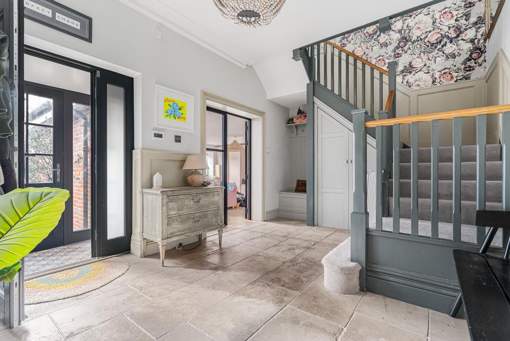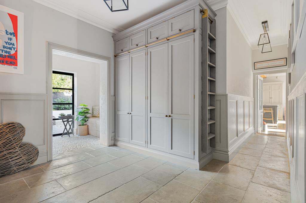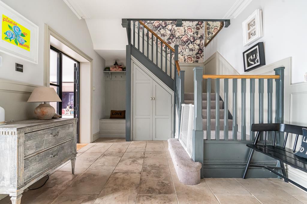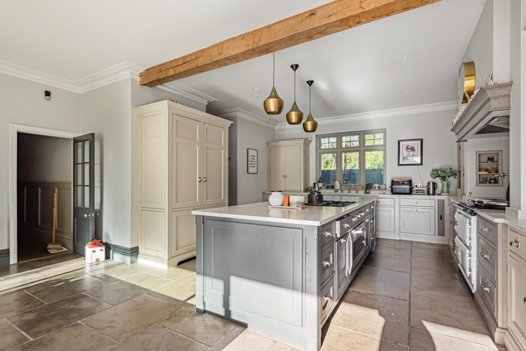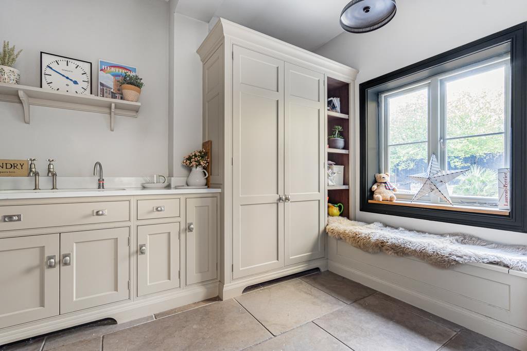 At the centre of the home is a superb kitchen, dining and living space. A large island, bespoke cabinetry, range cooker and ample storage create a highly functional yet sociable environment. Wide glazed doors open directly onto the terrace, bringing in natural light and connecting seamlessly to the garden. A pantry, utility and cloakroom/WC sit just off the kitchen.