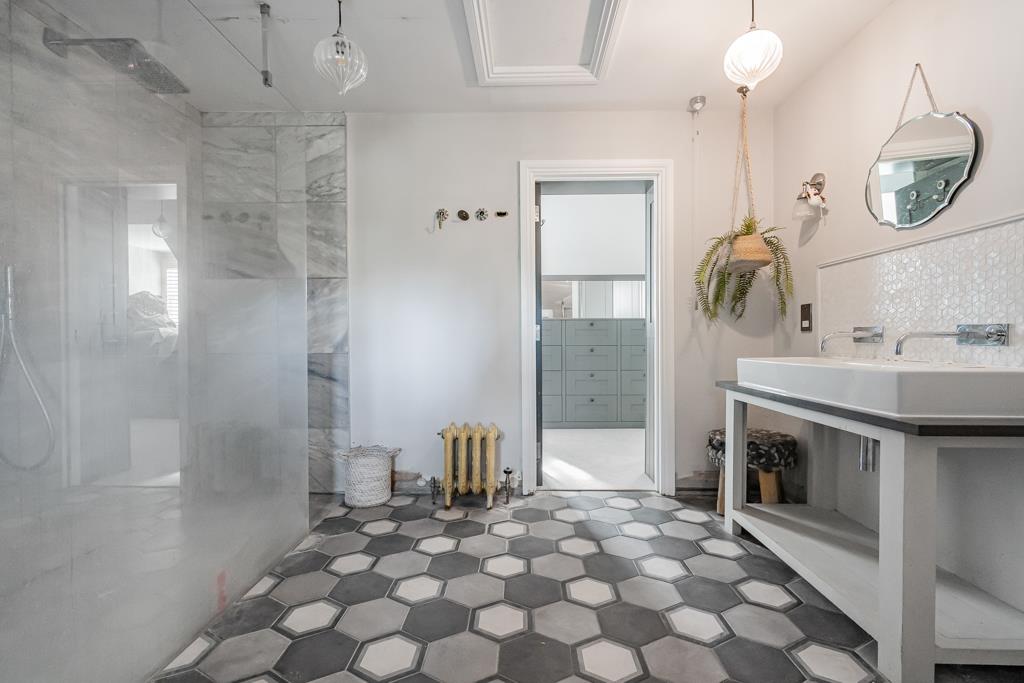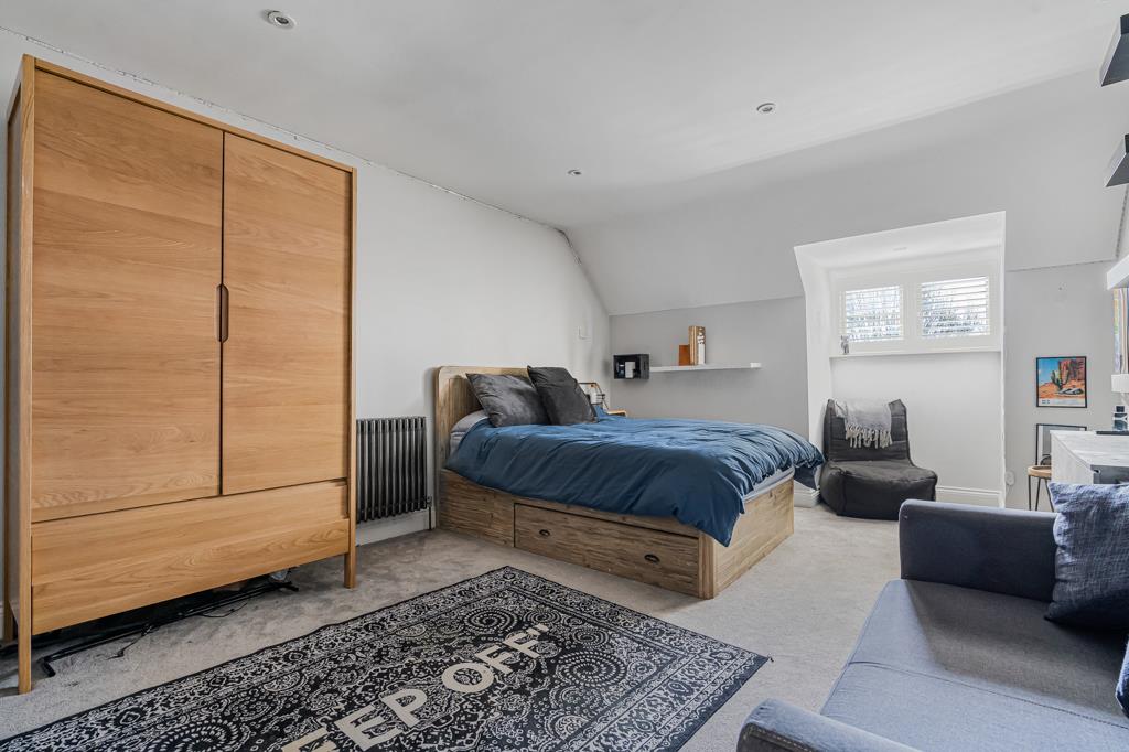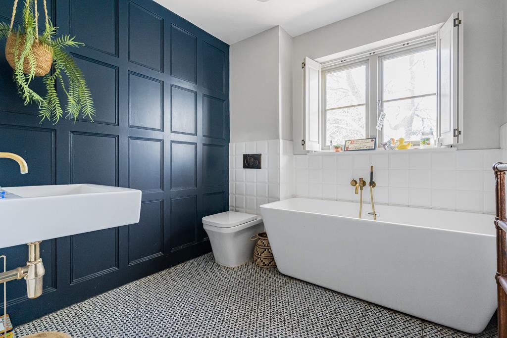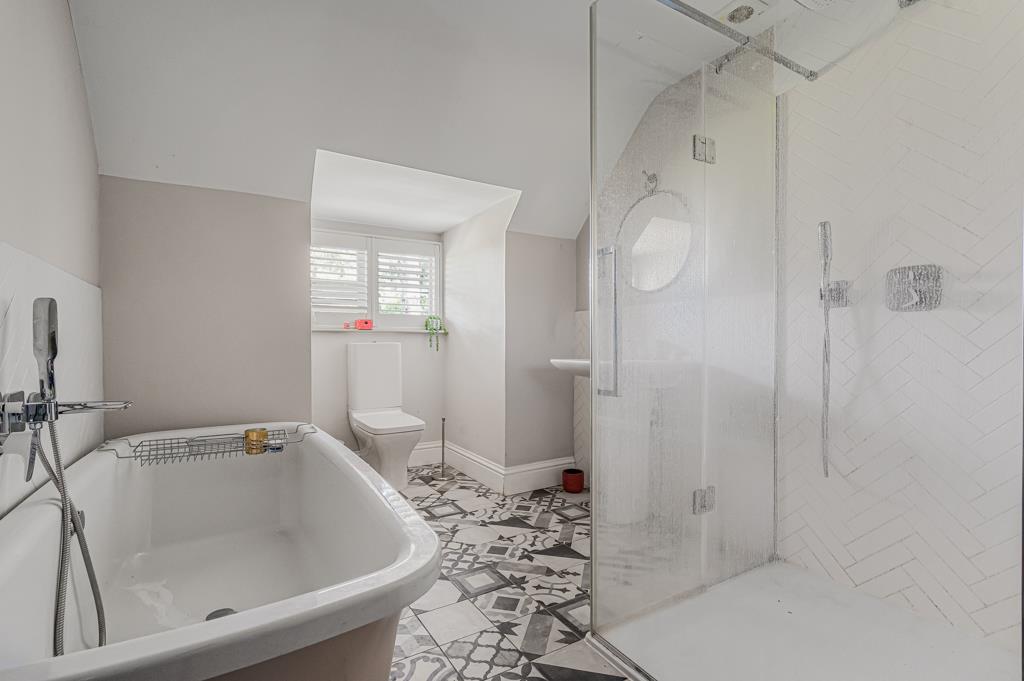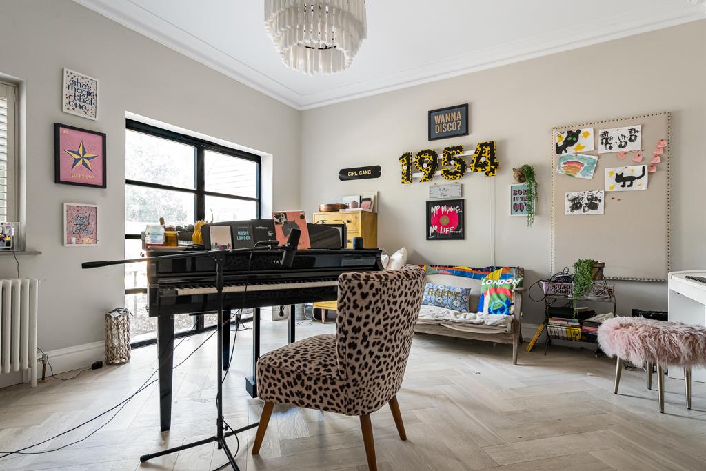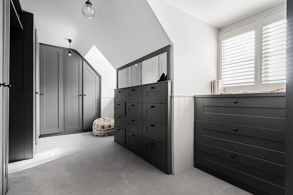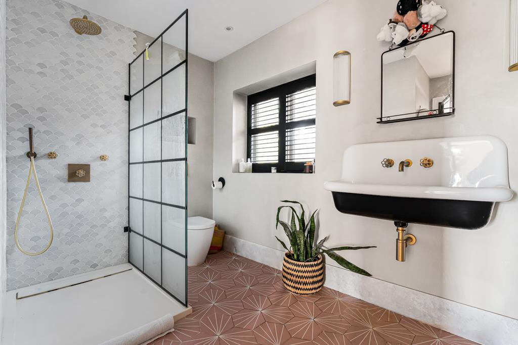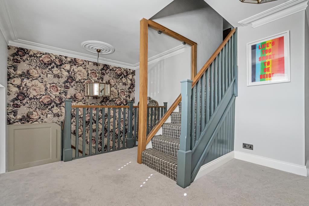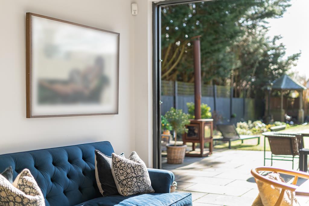 At the centre of the home is a superb kitchen, dining and living space. A large island, bespoke cabinetry, range cooker and ample storage create a highly functional yet sociable environment. Wide glazed doors open directly onto the terrace, bringing in natural light and connecting seamlessly to the garden. A pantry, utility and cloakroom/WC sit just off the kitchen.
