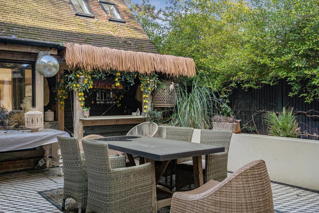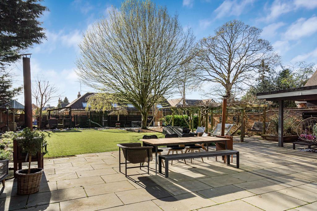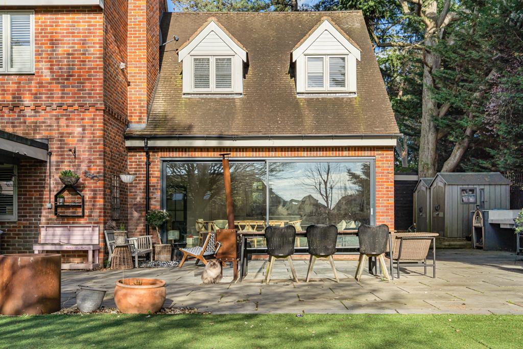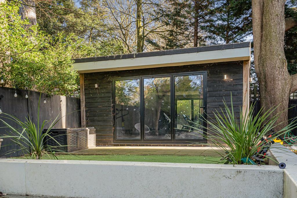 Outside, the rear garden is private and established, with a large terrace perfect for entertaining. A detached outbuilding, currently used as a gym, adds further versatility. To the front, a gated driveway provides ample parking and privacy.