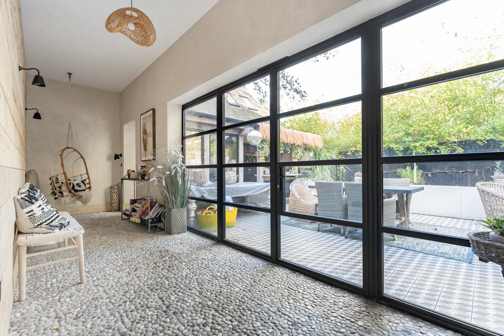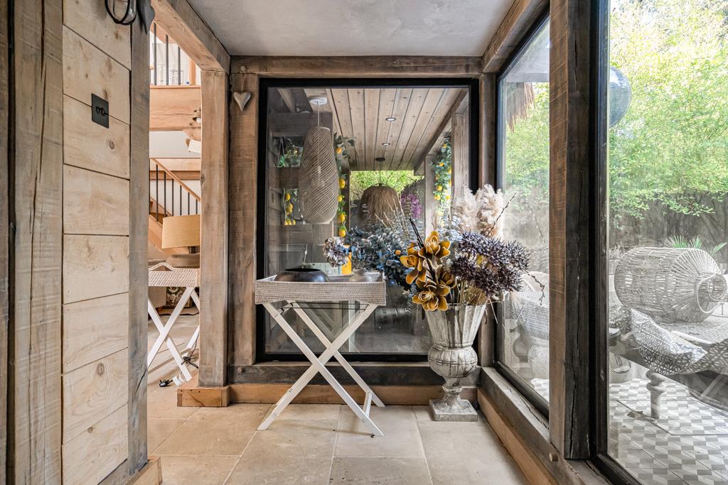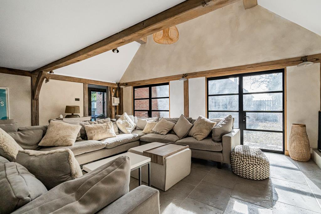 A standout feature is the barn-style family room, linked to the house via a glass walkway and boot room. Ideal for relaxing or entertaining, it includes a WC/shower room, mezzanine level and French doors to two private courtyard gardens.