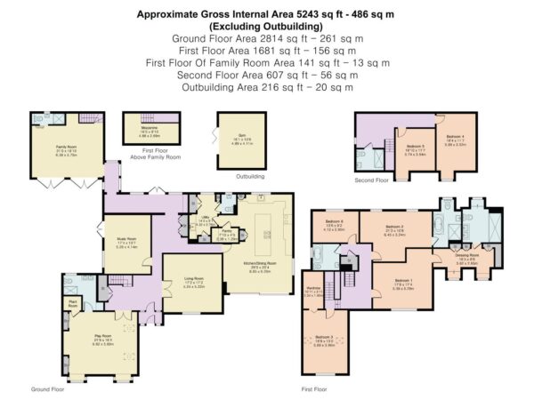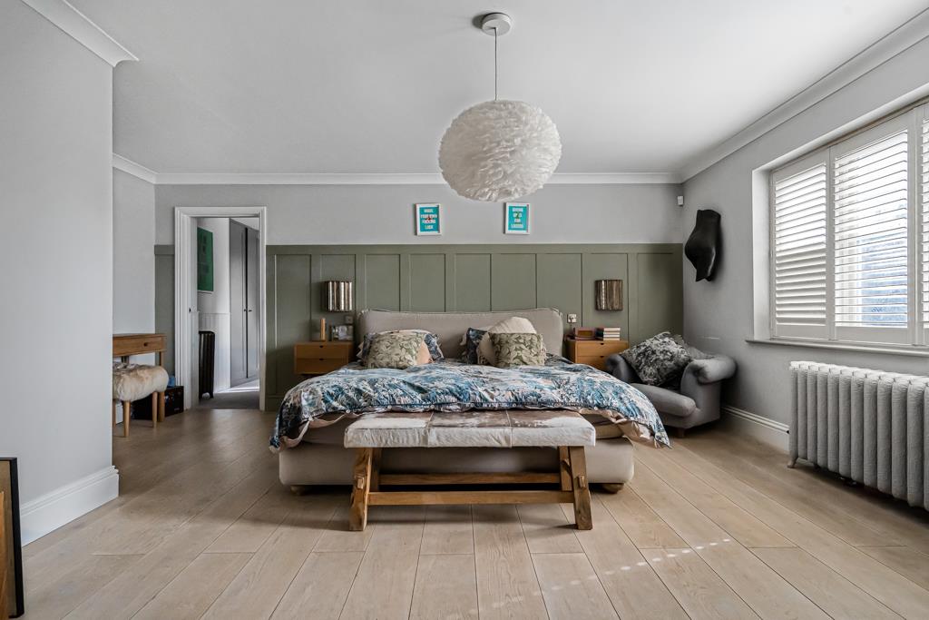 Upstairs, six well-proportioned bedrooms are arranged over two floors. The principal suite includes a dressing area and en suite, with additional bath and shower rooms supporting the remaining bedrooms, making the home well suited to larger families.