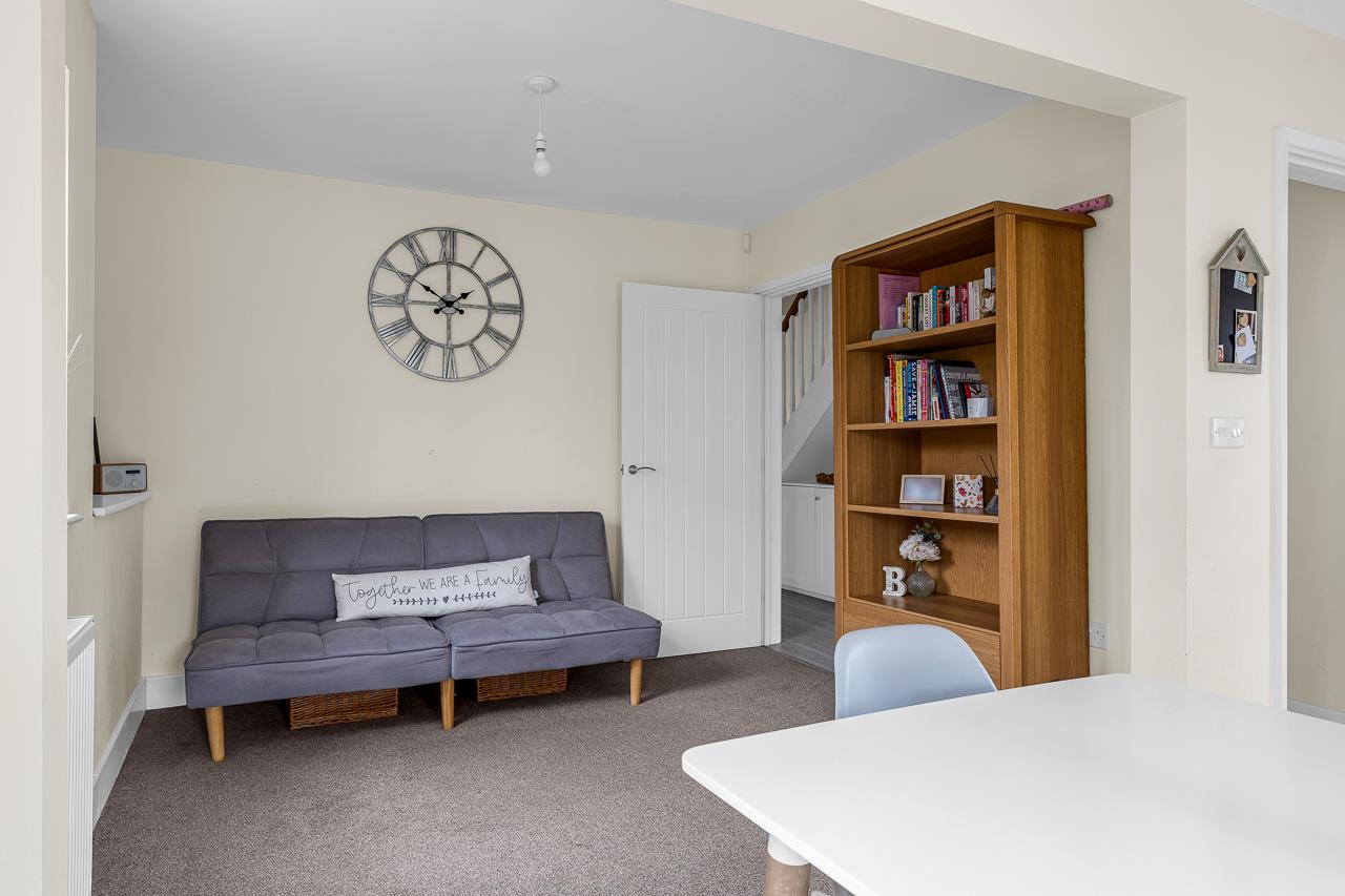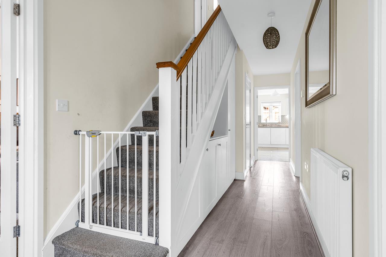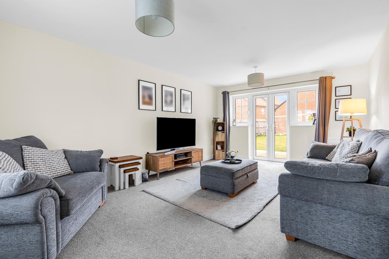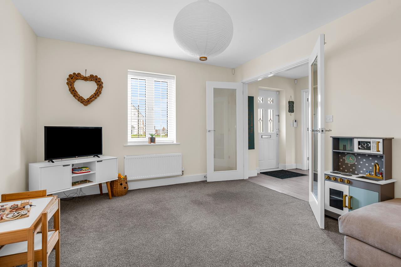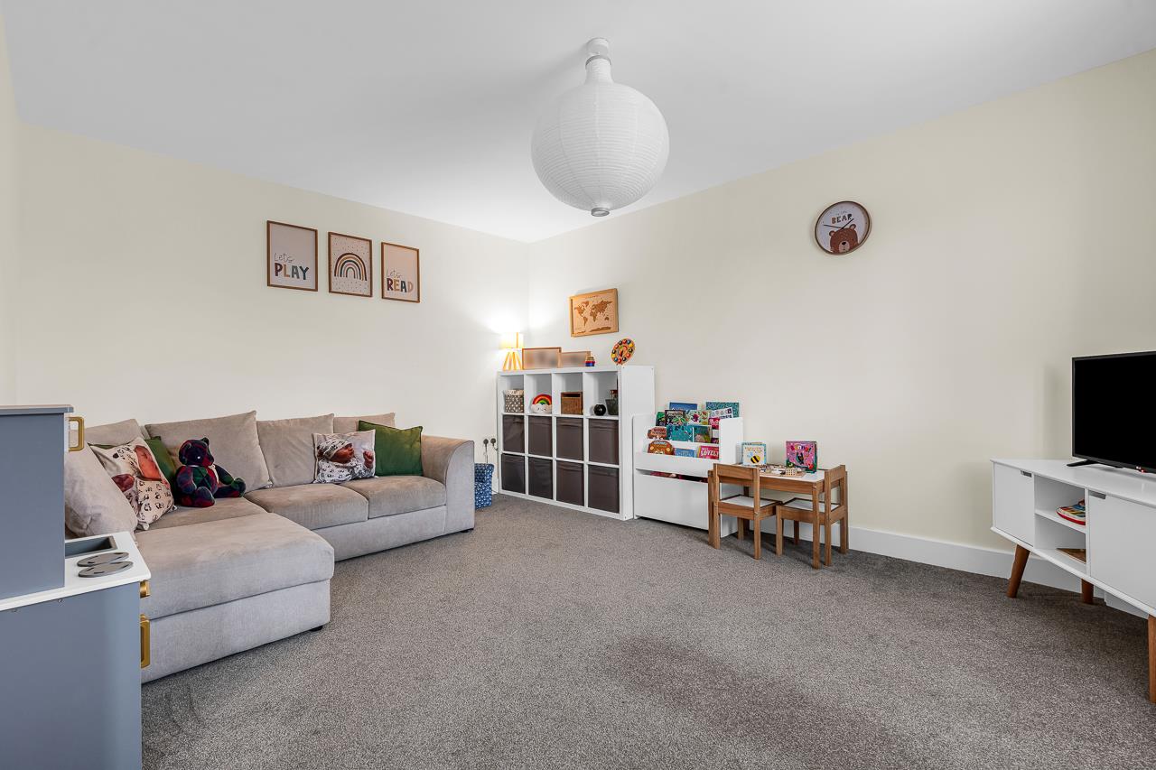 The ground floor accommodation comprises a welcoming entrance hall with fitted understairs storage and cloakroom/WC. To the front of the home is a dual-aspect living room with French doors opening onto the rear garden, creating an ideal space for entertaining. There is also a versatile family/playroom with views to the front, perfect for a home office or children’s play space.