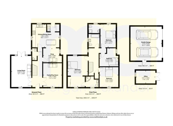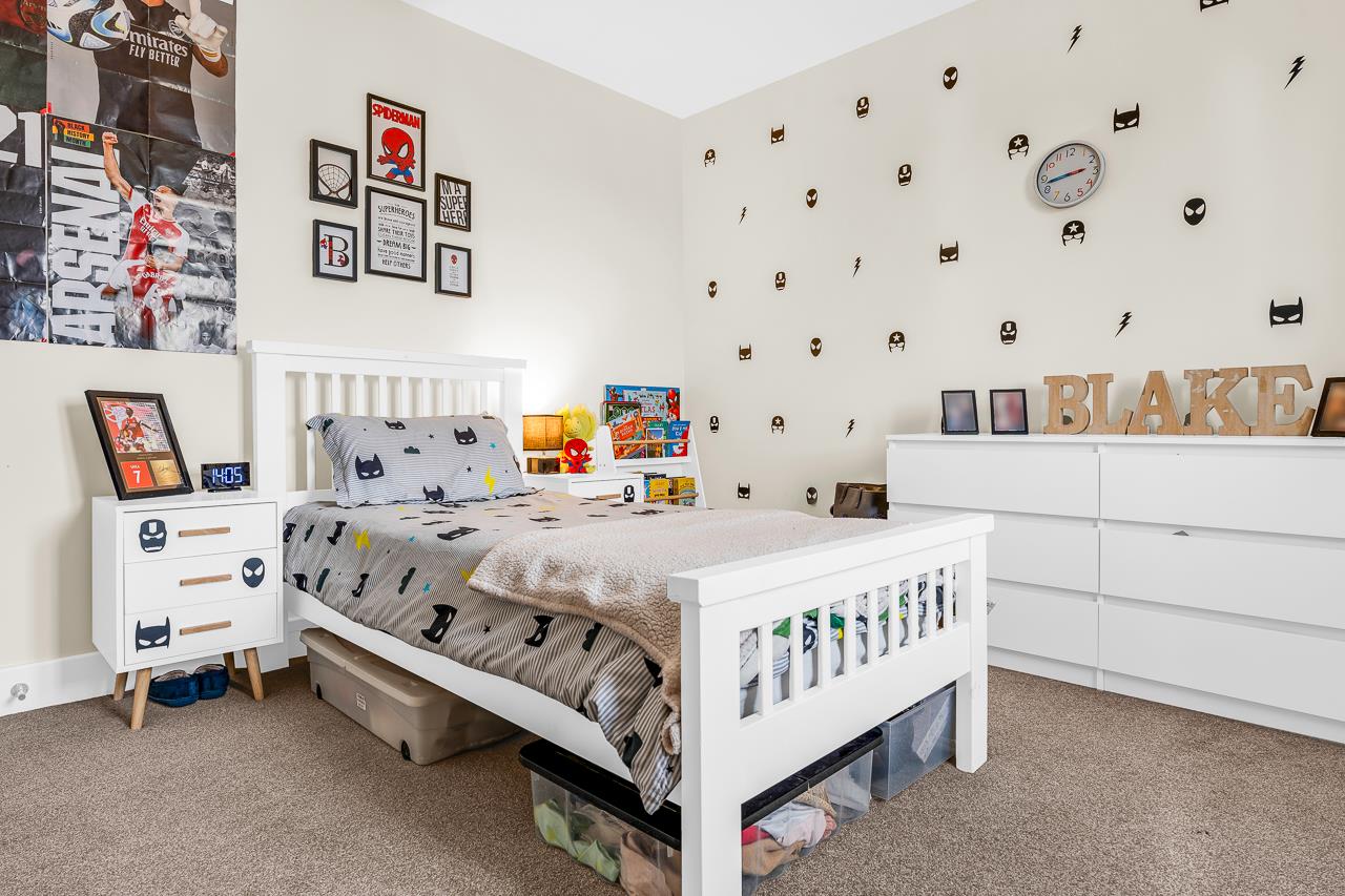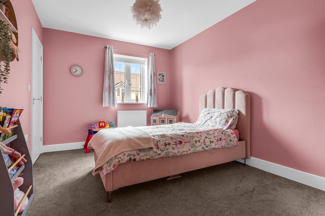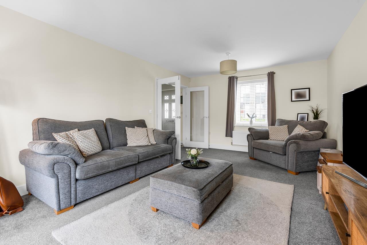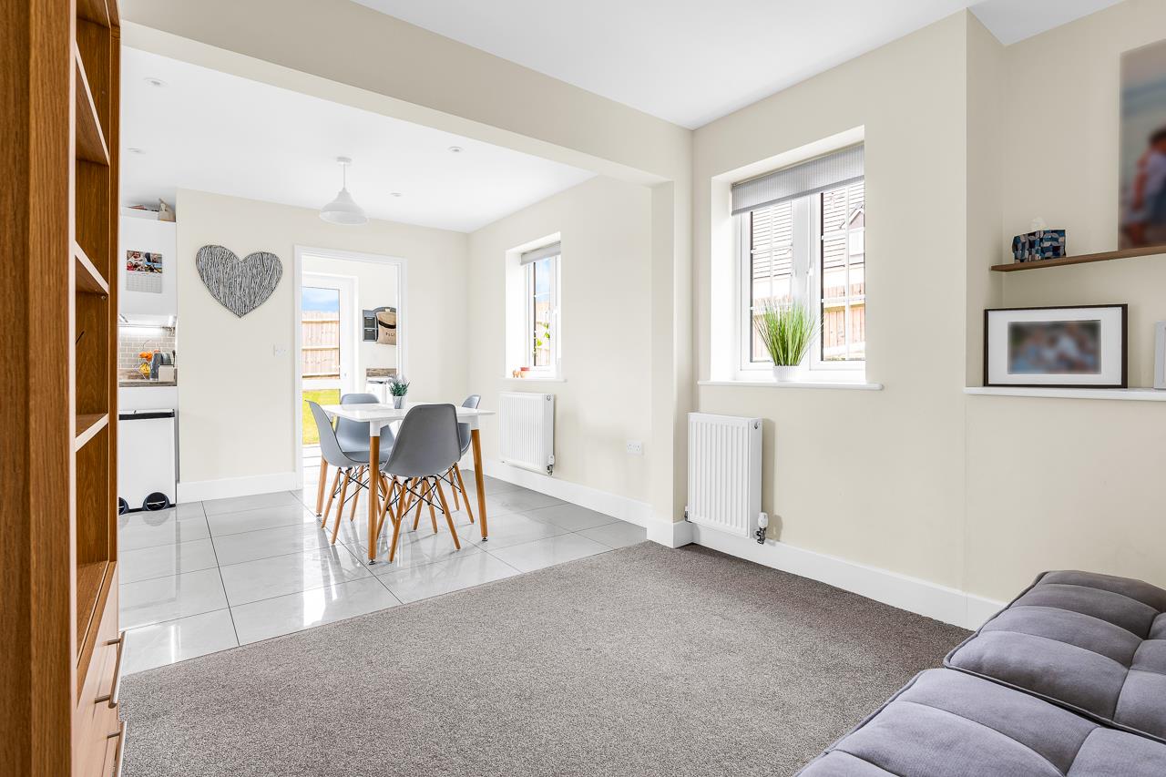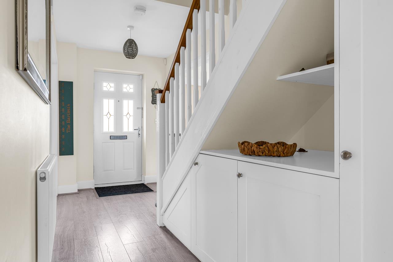 The ground floor accommodation comprises a welcoming entrance hall with fitted understairs storage and cloakroom/WC. To the front of the home is a dual-aspect living room with French doors opening onto the rear garden, creating an ideal space for entertaining. There is also a versatile family/playroom with views to the front, perfect for a home office or children’s play space.