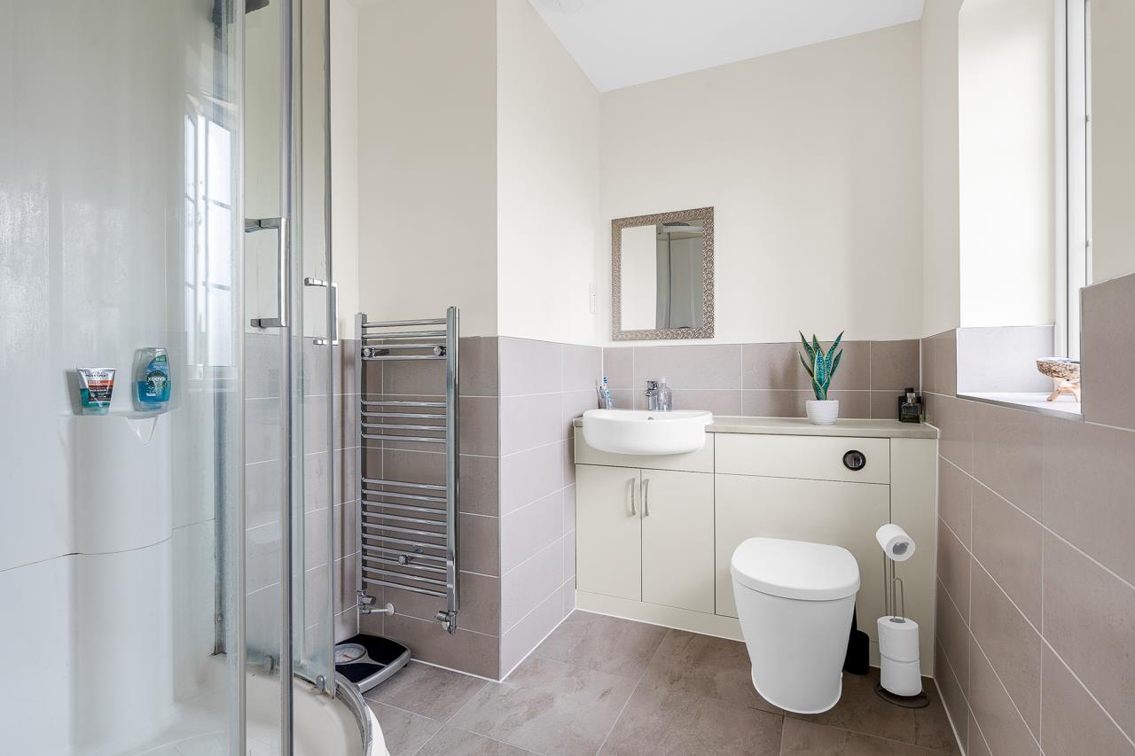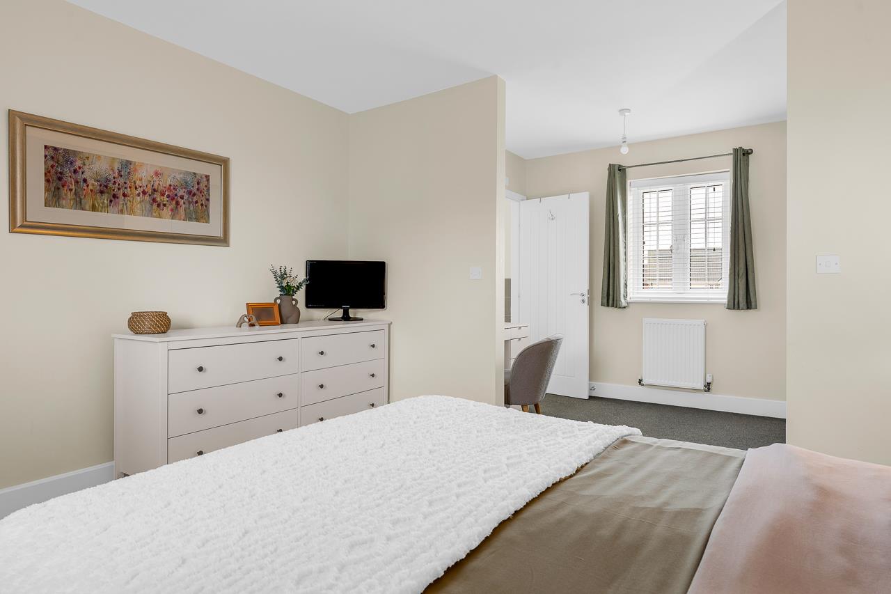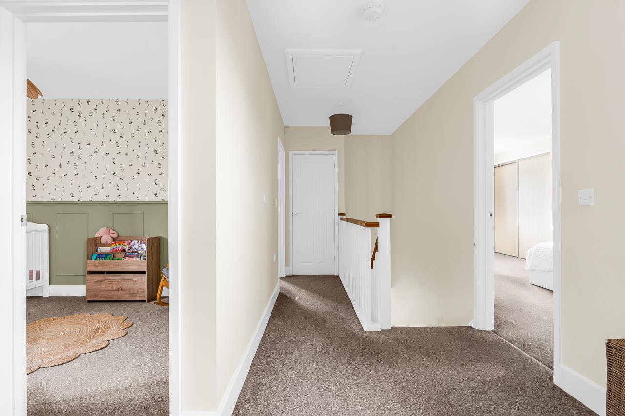 Upstairs, the generous landing leads to a dual-aspect master bedroom featuring a dressing area and contemporary en-suite shower room. A guest bedroom also benefits from its own en-suite, while two further well-proportioned bedrooms are served by a modern family bathroom.