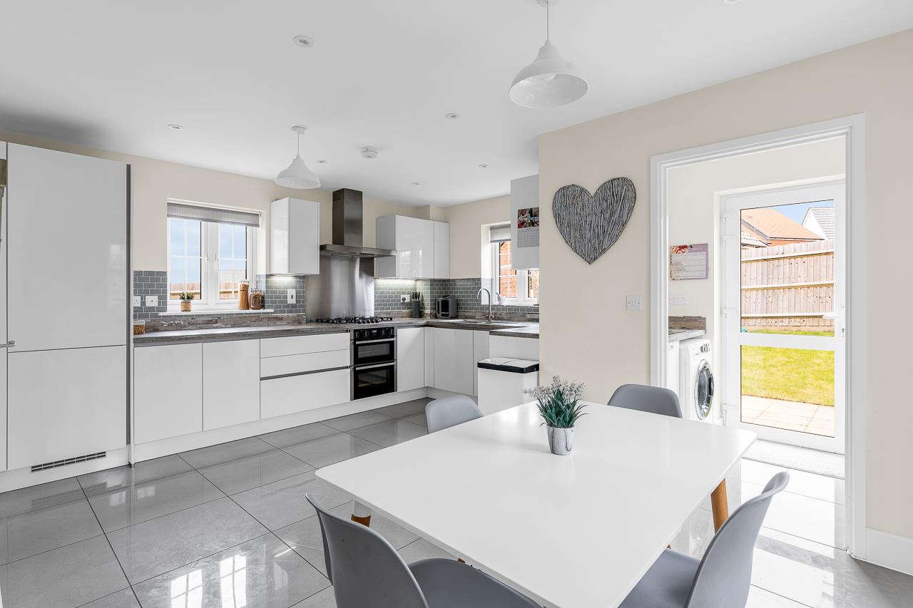 The heart of the home is the expansive, open-plan kitchen/dining room, beautifully finished with integrated appliances, ample cabinetry, work surfaces and an adjoining snug area — all perfectly arranged to enjoy views over the landscaped rear garden. There is also a separate utility area with additional storage and a door providing direct access to the garden.