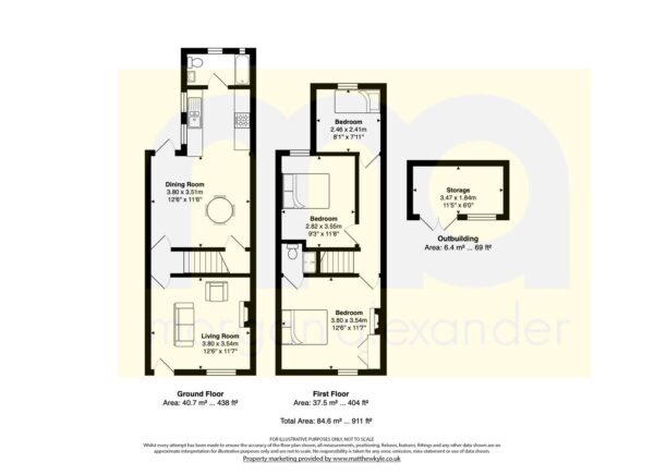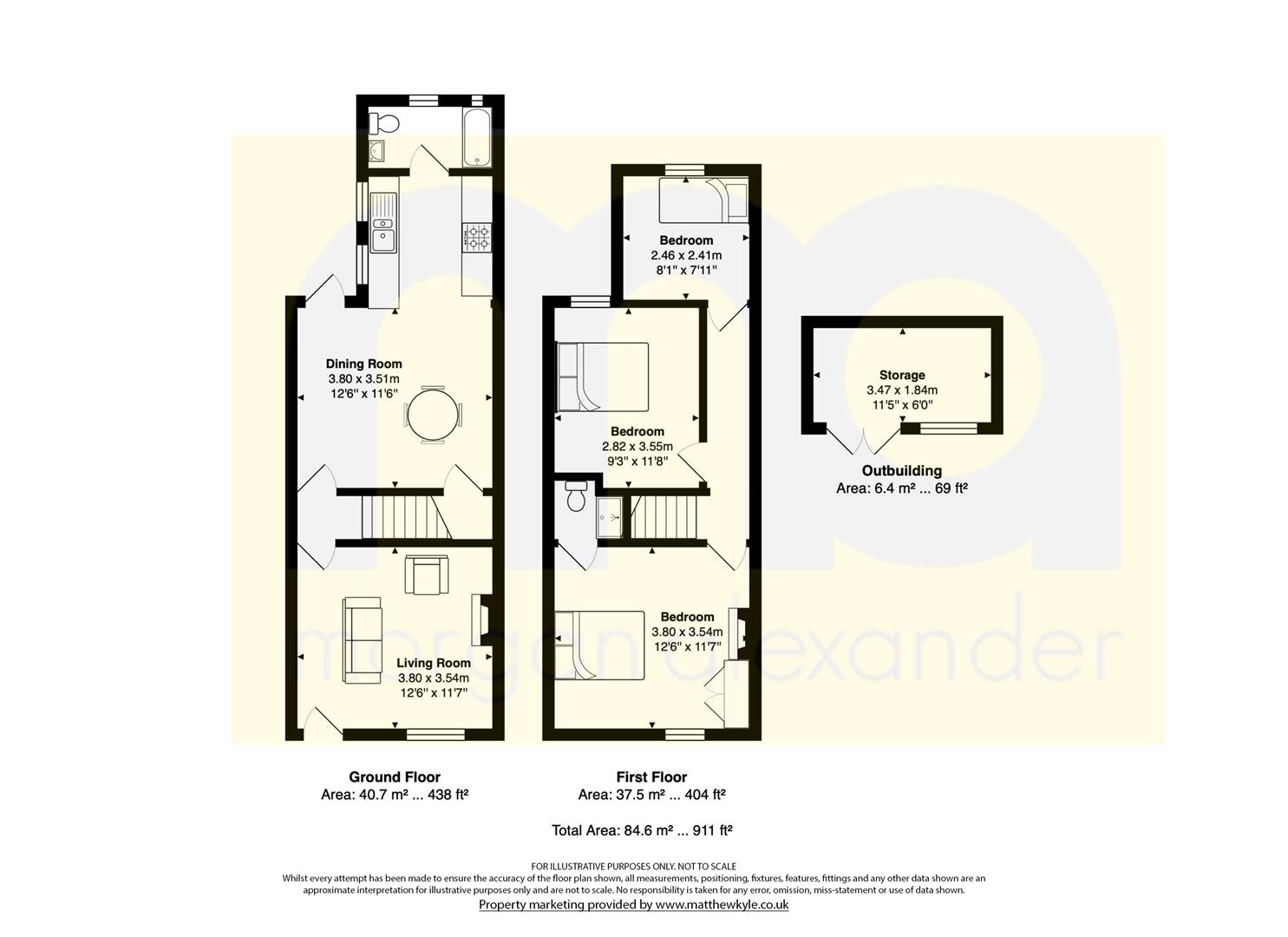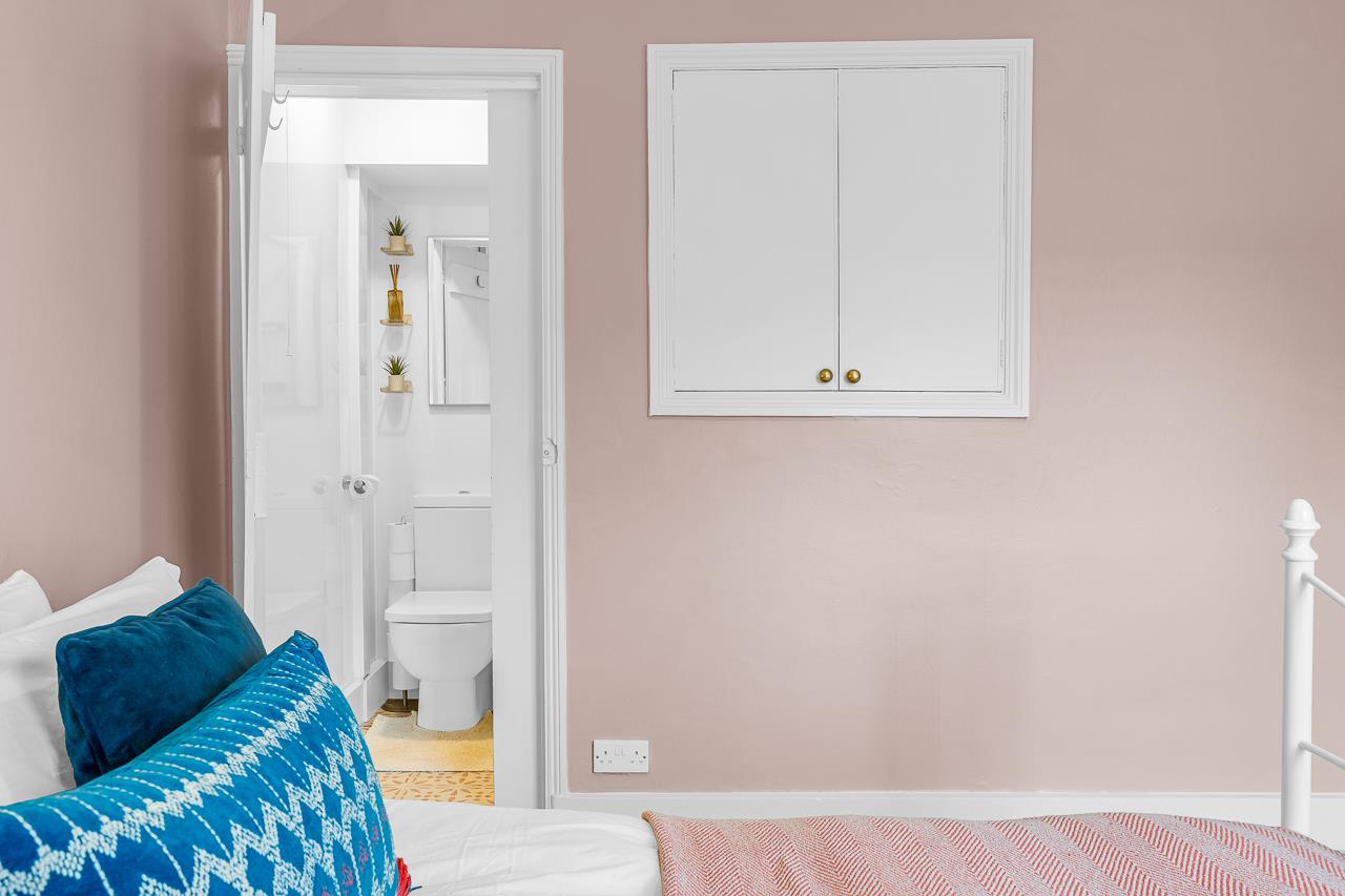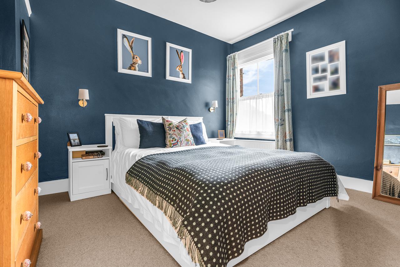 Upstairs, the principal bedroom occupies the front of the property and features a striking cast iron fireplace, fitted wardrobes set neatly into the chimney recess, and the benefit of an en-suite shower room. Two further bedrooms complete the first floor, offering flexibility for family living, guests or home working.