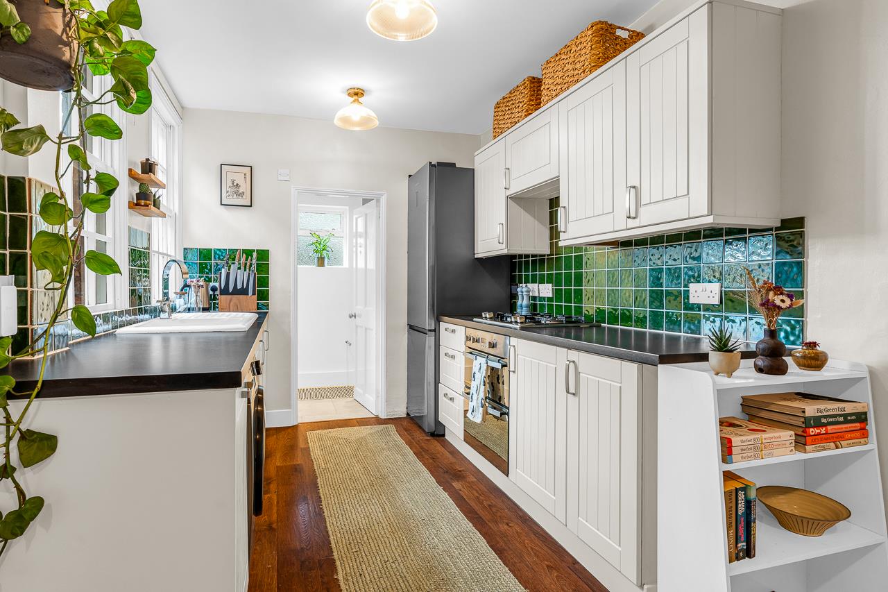 The kitchen is fitted with a range of wall and base units with complementary work surfaces, space for appliances, side aspect windows and access to a recently refitted ground floor bathroom.