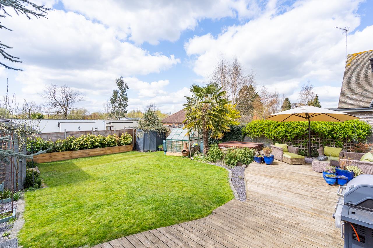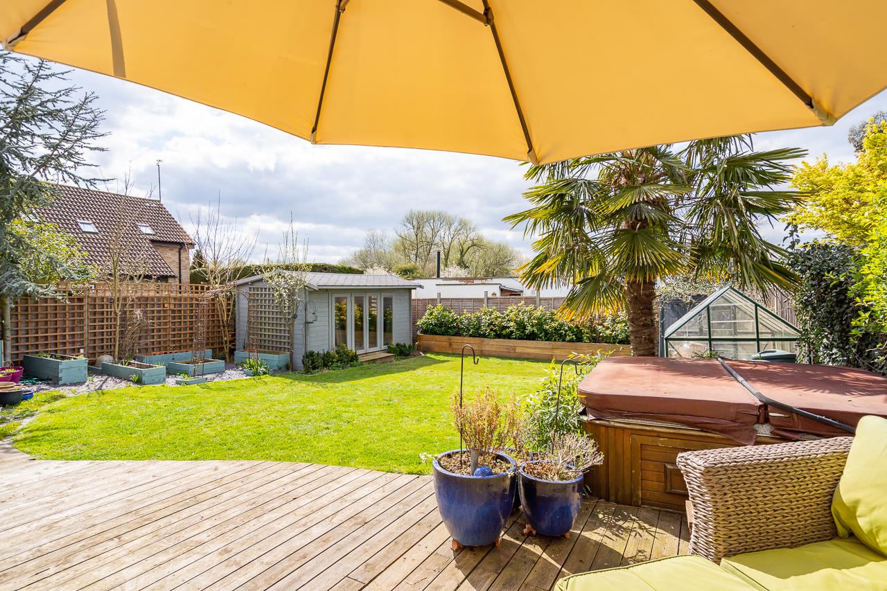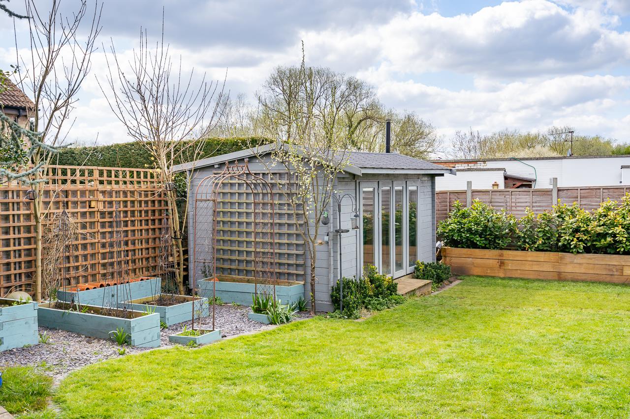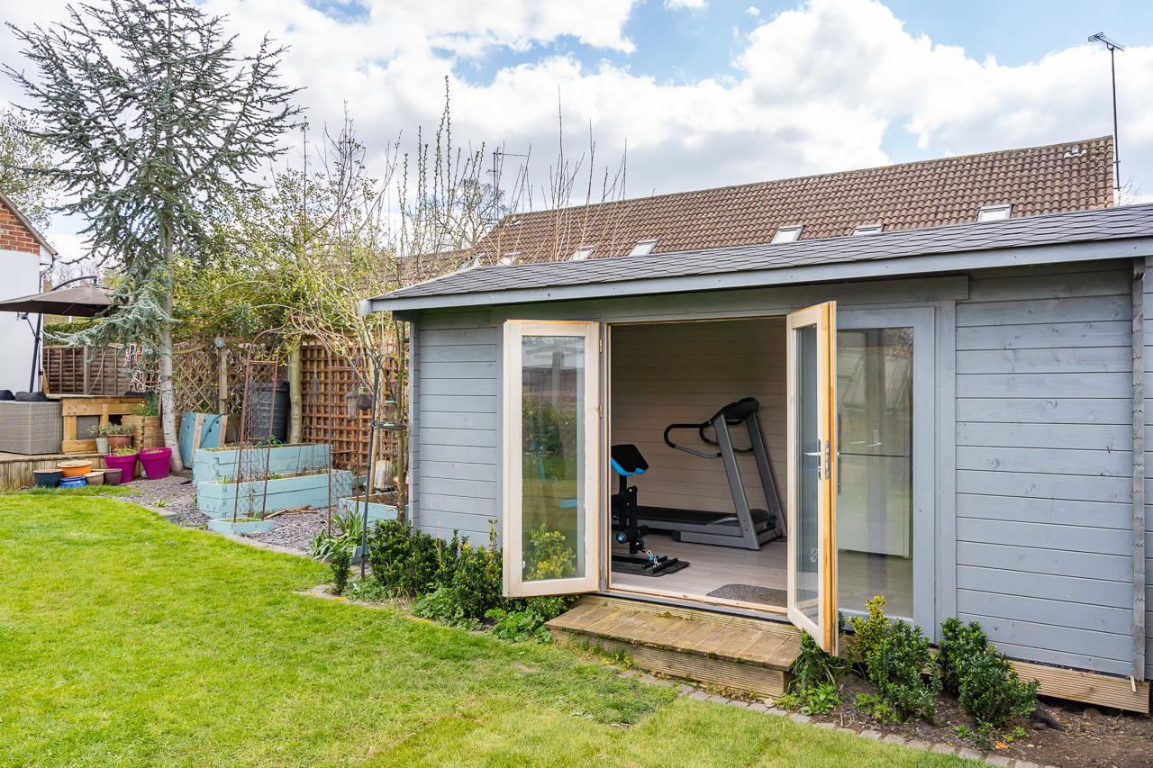 The rear garden enjoys a desirable south-facing aspect, offering a high degree of privacy and a mature, established feel. Of particular note is the modern garden building, currently configured as a home office/gym, providing excellent additional space away from the main house.