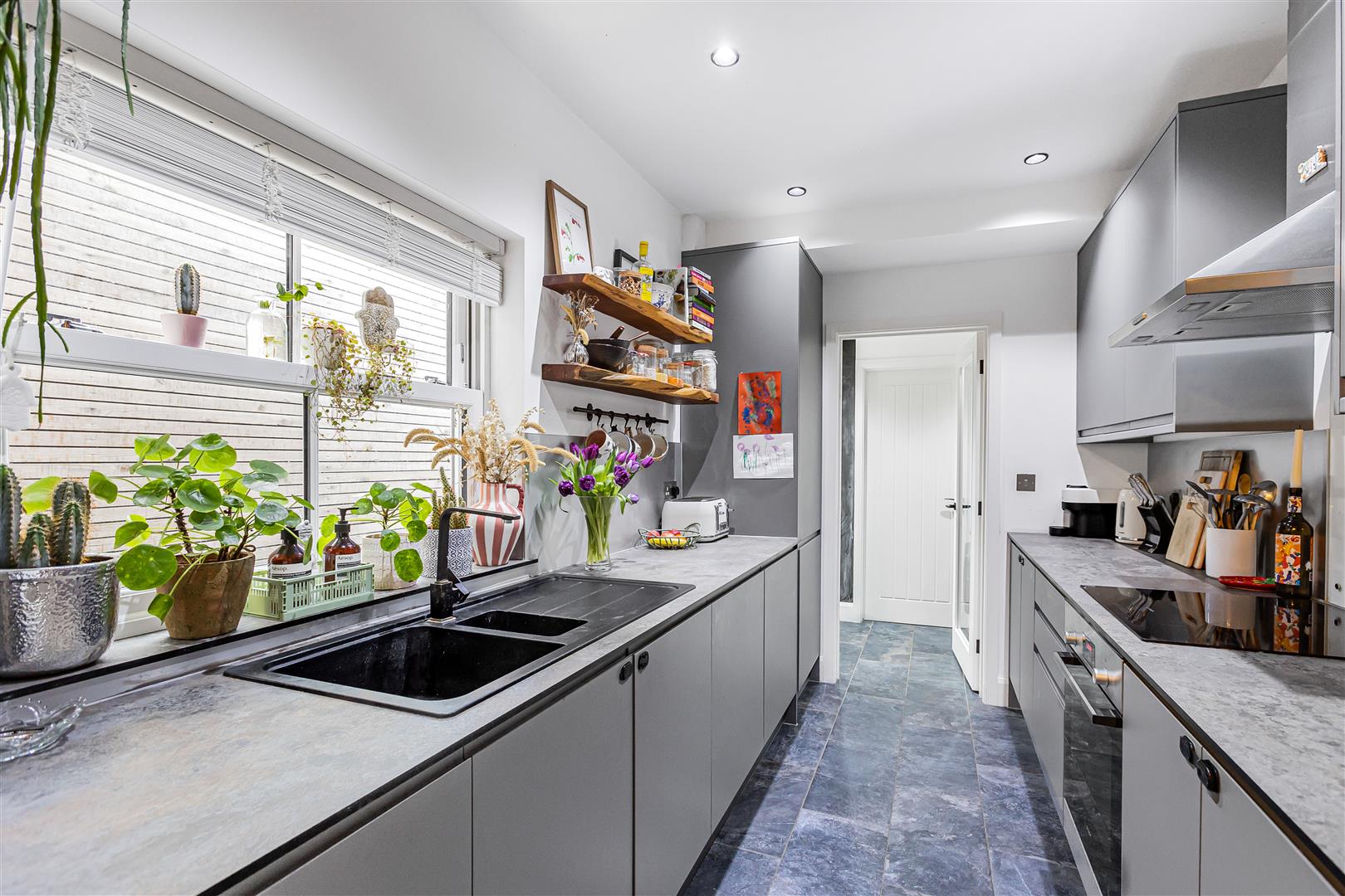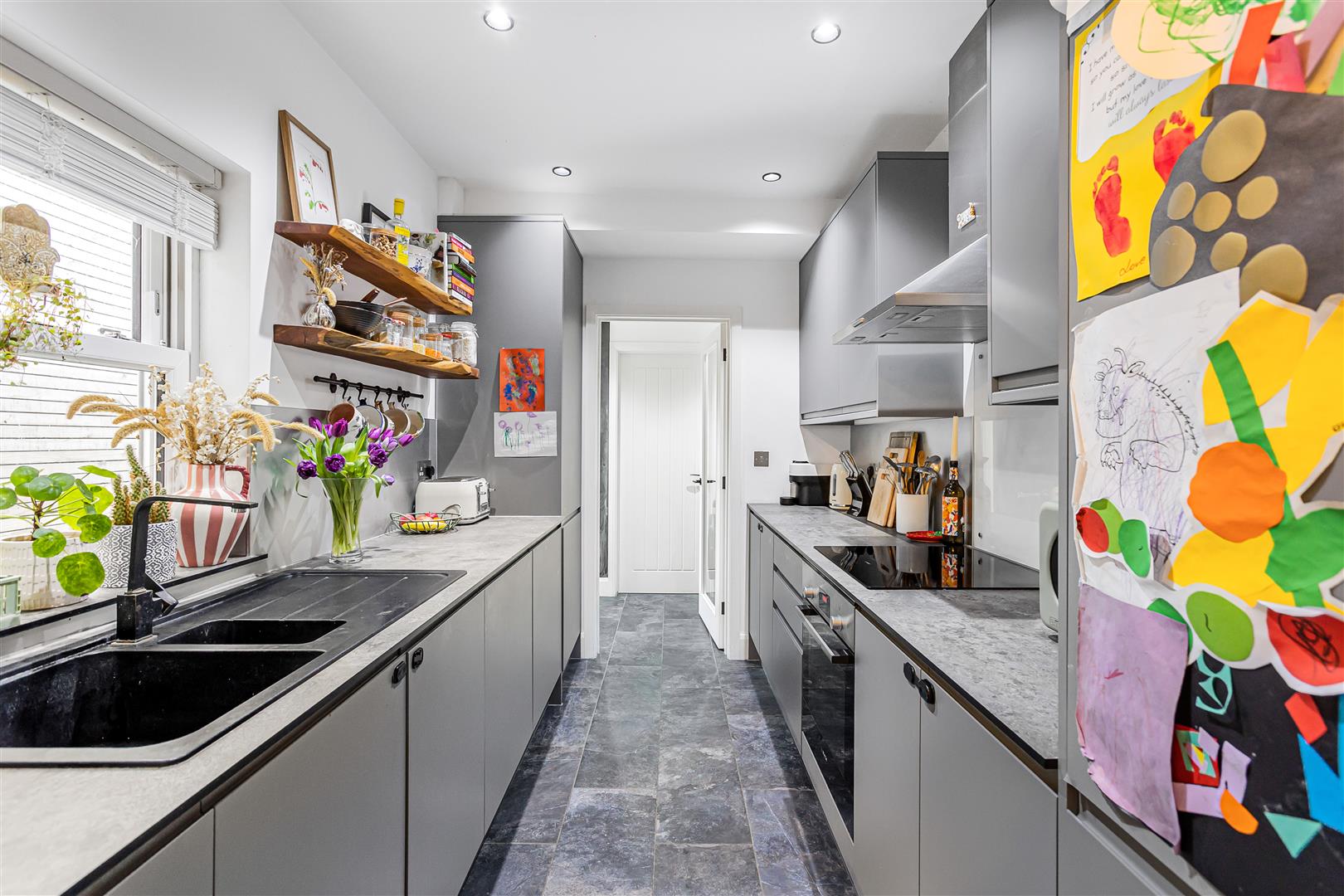 To the rear of the property is a stylishly refitted kitchen, thoughtfully designed with sleek gloss units, ample work surfaces, and a range of integrated appliances including an induction hob, oven, dishwasher, and fridge freezer. The kitchen benefits from underfloor heating and flows seamlessly into a practical utility room, providing side access, additional storage, and plumbing for appliances. A beautifully finished luxury shower room completes the ground floor, featuring a walk-in shower, modern fittings, full tiling, and underfloor heating.