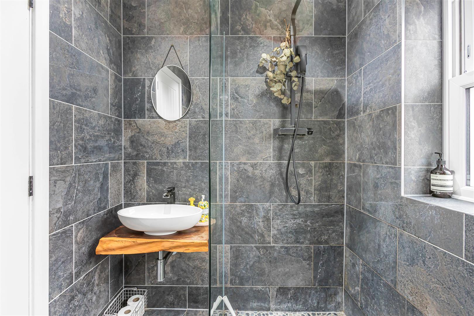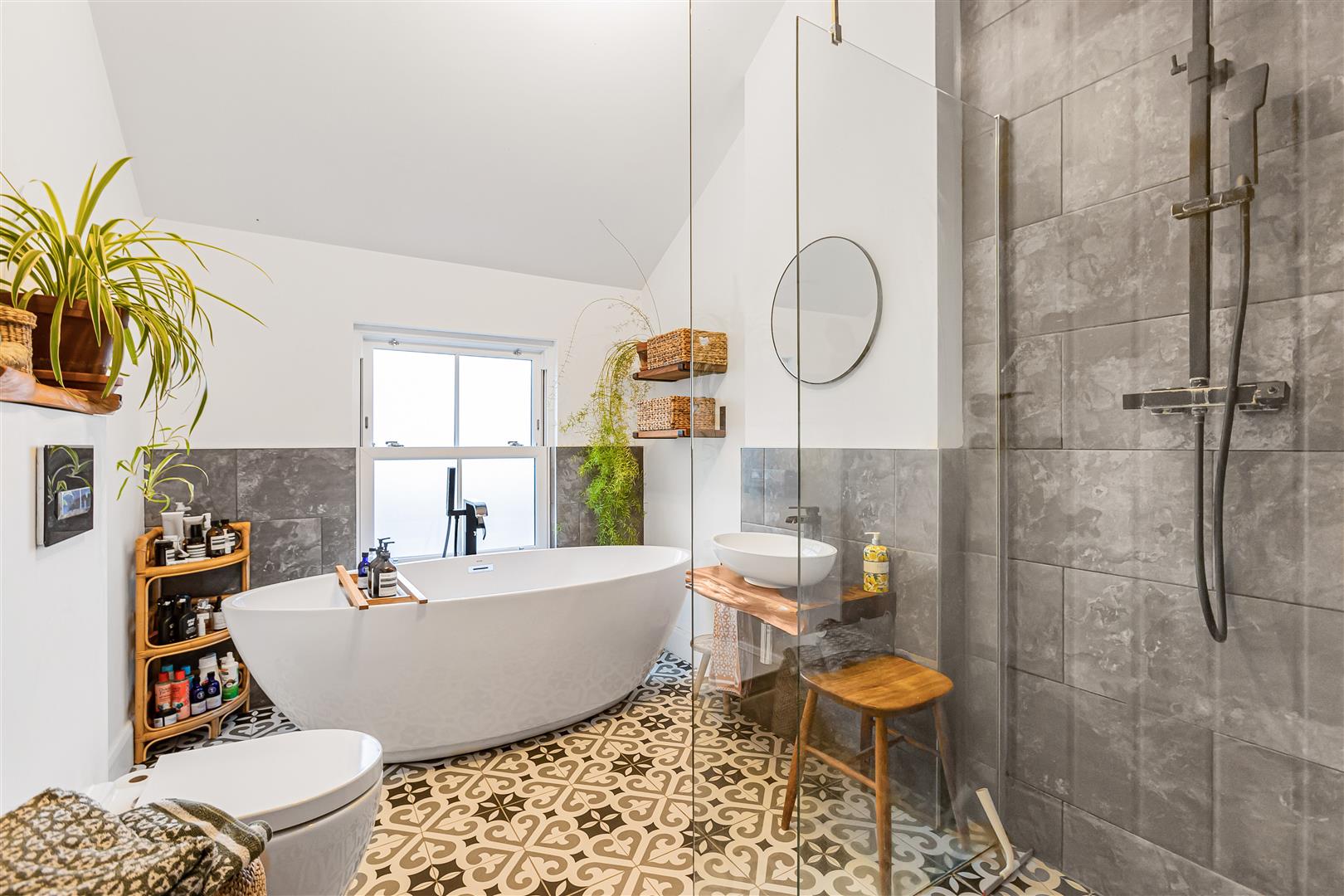 The first floor offers two well-proportioned double bedrooms, both retaining character features and benefiting from sash-style windows. The principal bedroom enjoys the added luxury of a high-quality en-suite bathroom, finished with a freestanding bath, walk-in shower, contemporary sanitaryware, and underfloor heating.