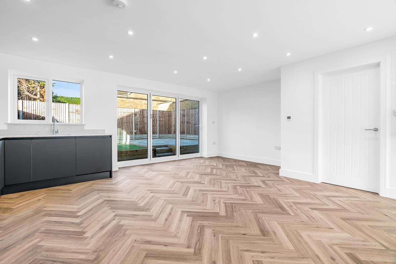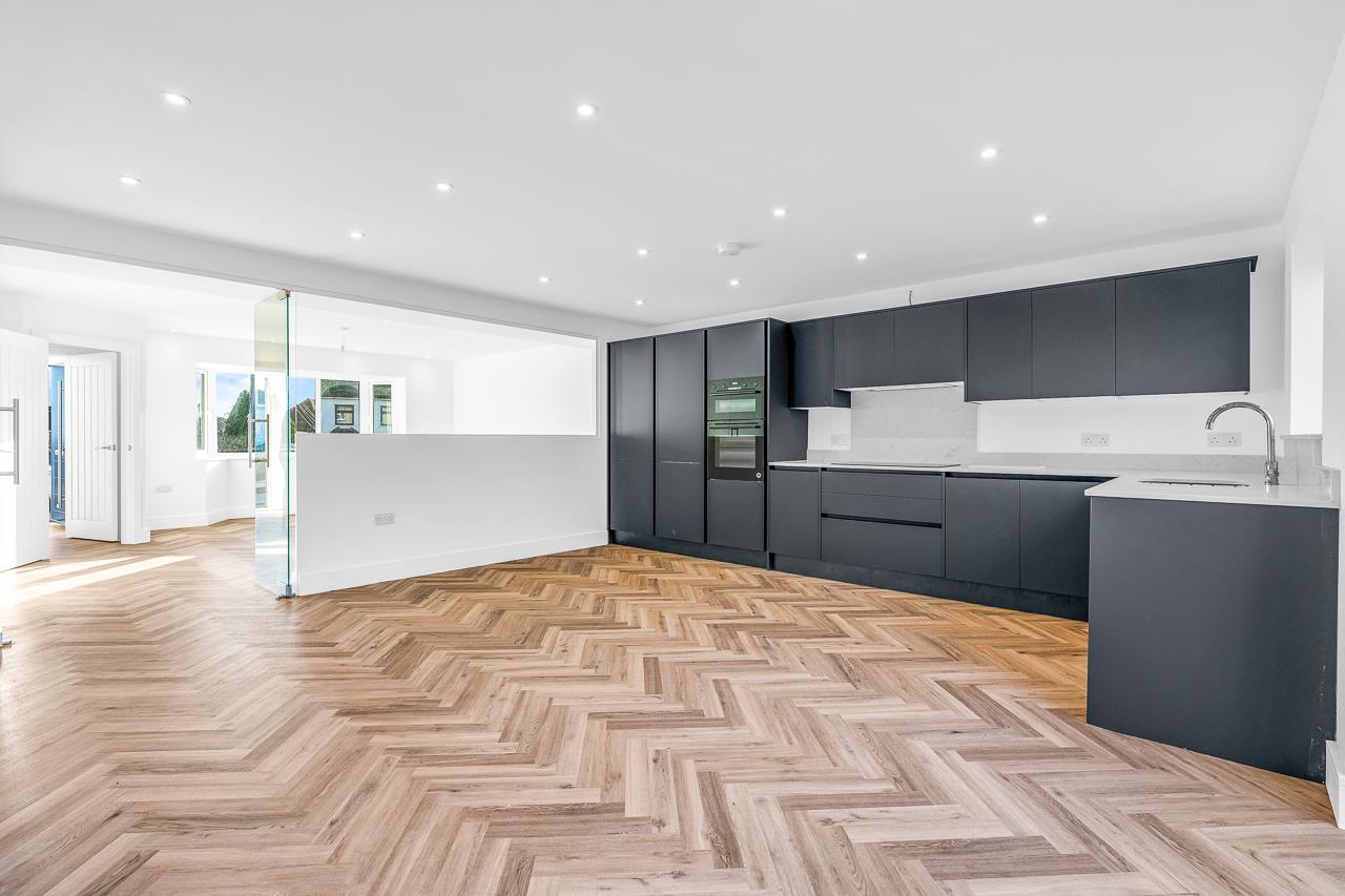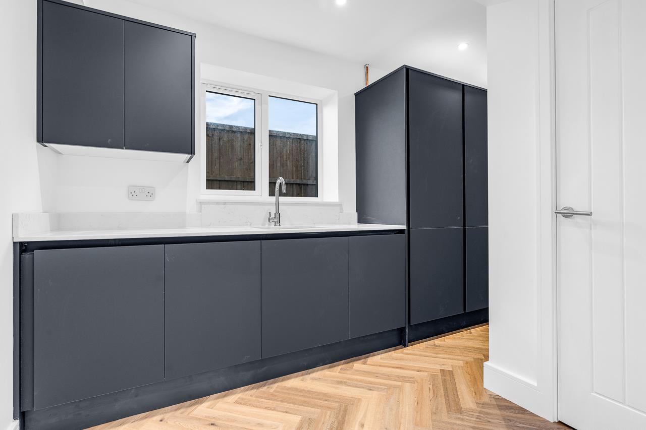Set back from the road with a paved driveway providing off-street parking, this impressive home offers stylish, modern interiors finished to a consistently high standard. Underfloor heating to key ground floor areas adds everyday comfort and a premium feel.At the heart of the house is the bespoke kitchen/dining room – a superbly designed, highly functional space with integrated appliances, underfloor heating and wide bi-folding doors opening directly onto the garden. Ideal for family life and entertaining, it is supported by a separate utility room that keeps practicalities neatly hidden. To the front, the living room is elegant and welcoming, finished with contemporary flooring and further underfloor heating, while a sleek ground floor cloakroom completes the layout.
