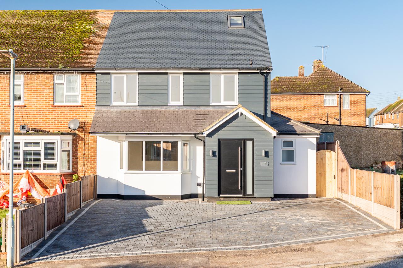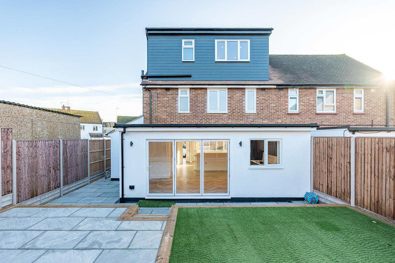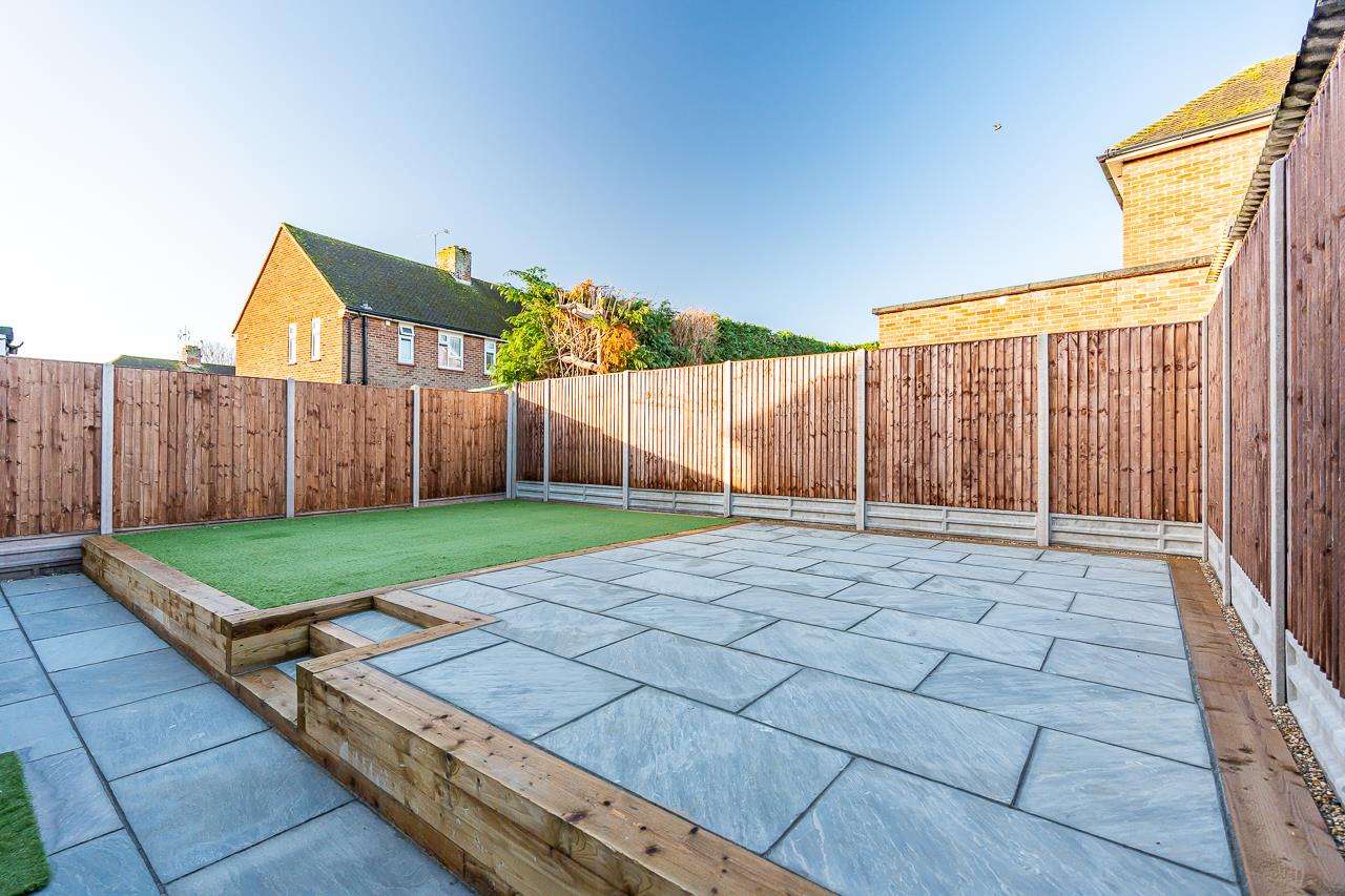 Outside, the landscaped rear garden has been designed for easy, modern living. An artificial lawn provides a safe, low-maintenance play area, while paved terrace spaces off the kitchen are perfect for outdoor dining and summer evenings. A side gate offers convenient access to the front.