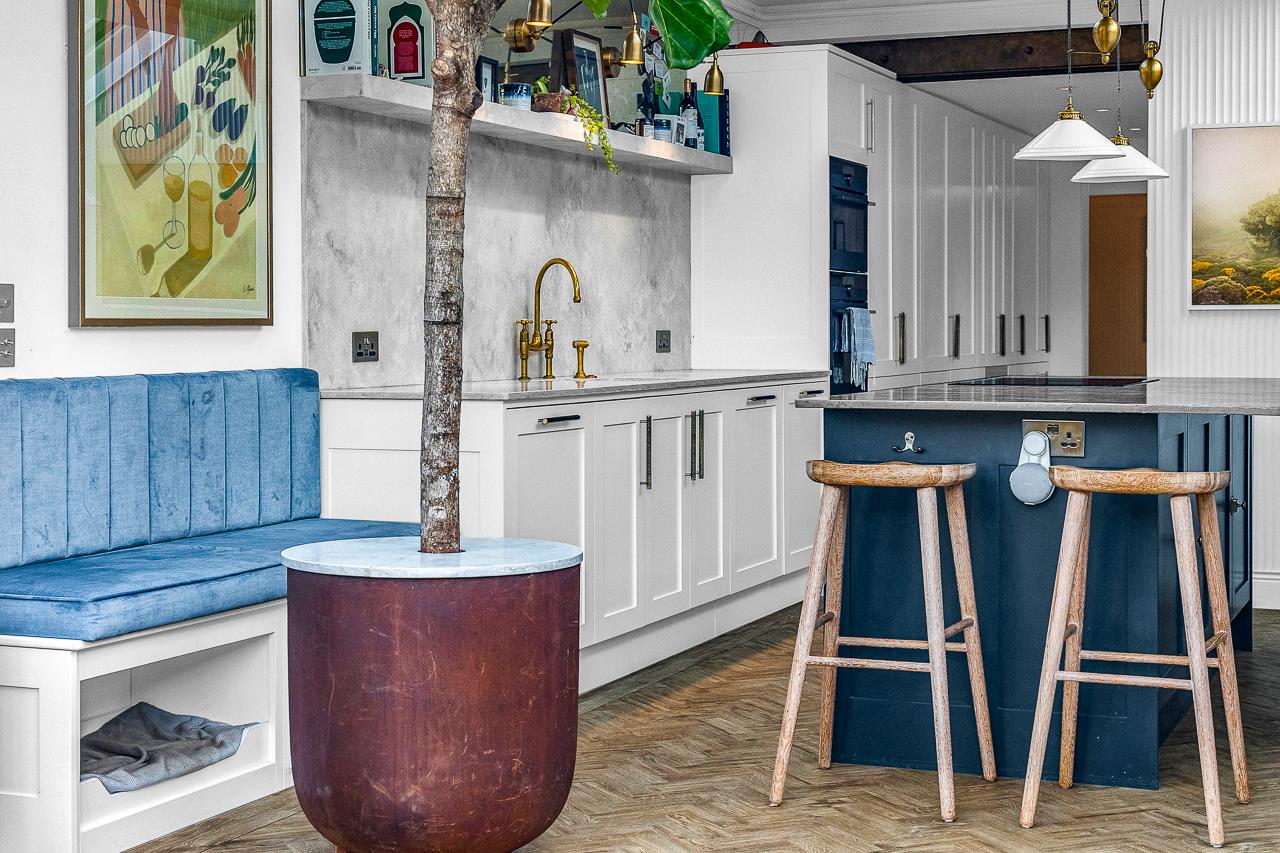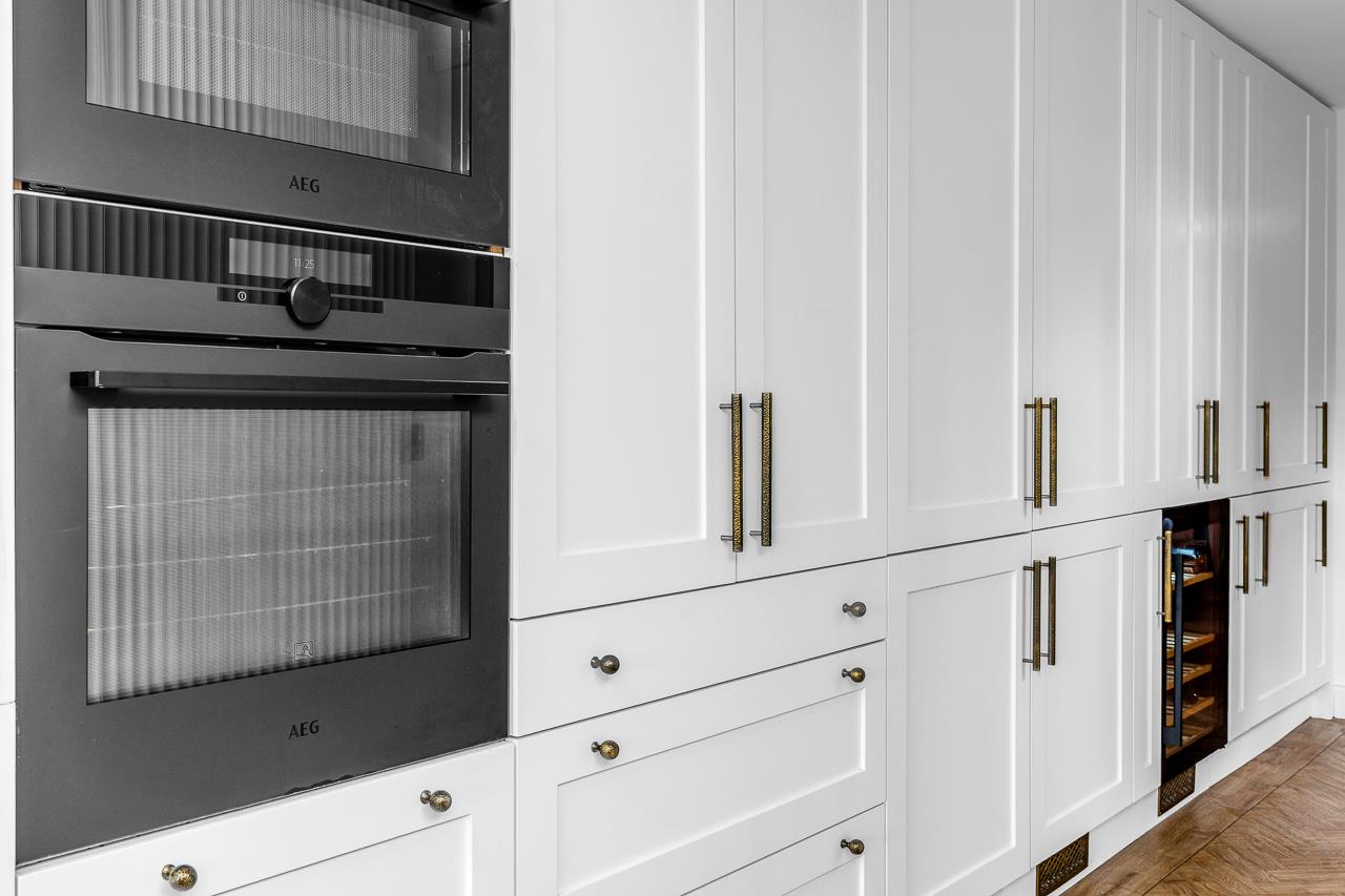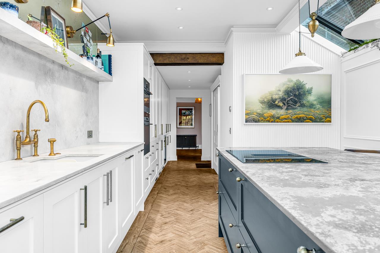 The hand-made oak kitchen, finished in Farrow & Ball colours, combines beauty and practicality with quartz worktops, integrated AEG appliances, twin ovens and dishwashers, wine fridge, pantry cupboard and bar area—ideal for both everyday living and entertaining.