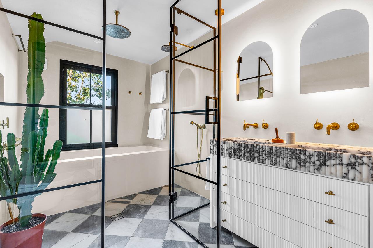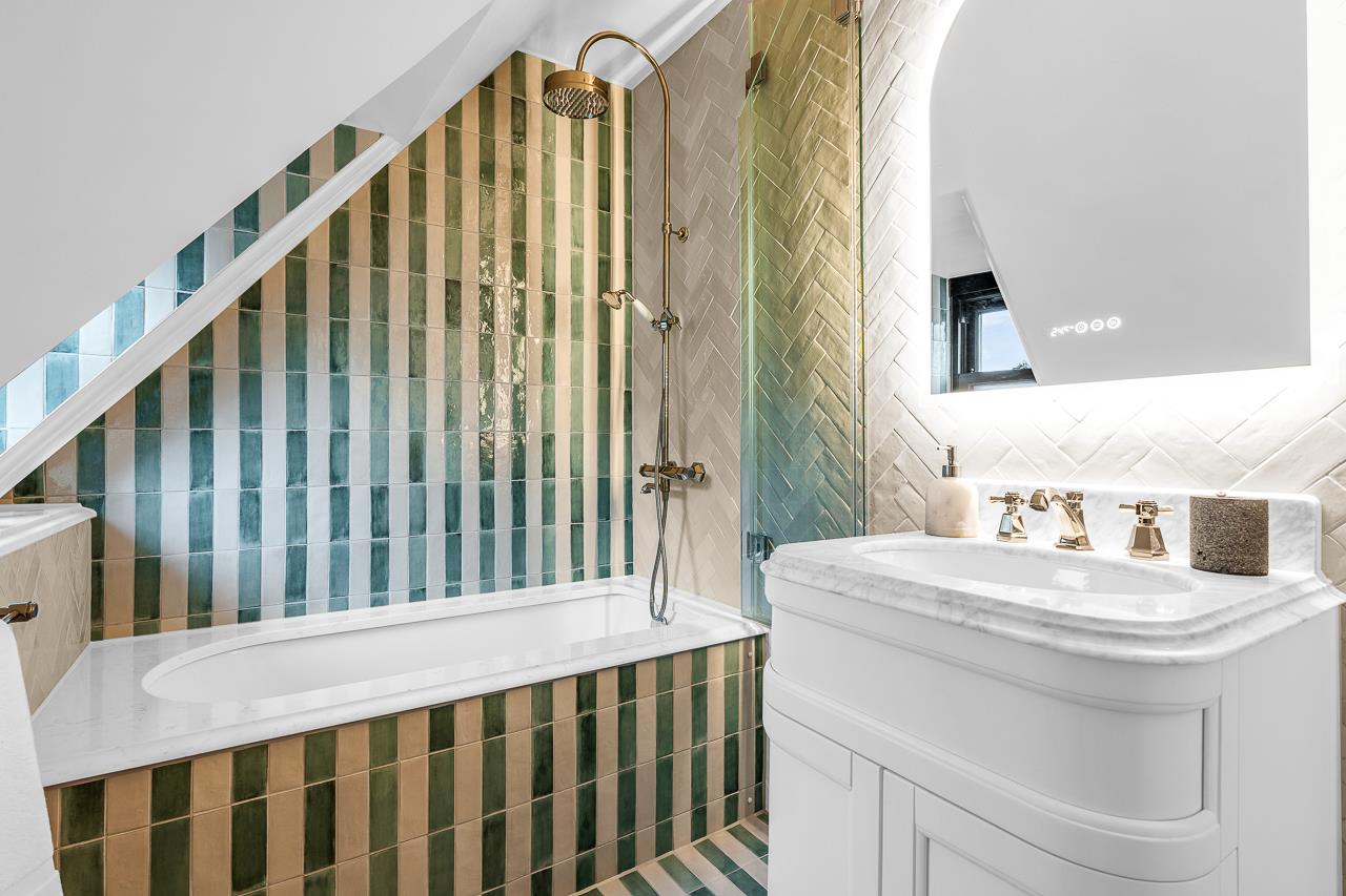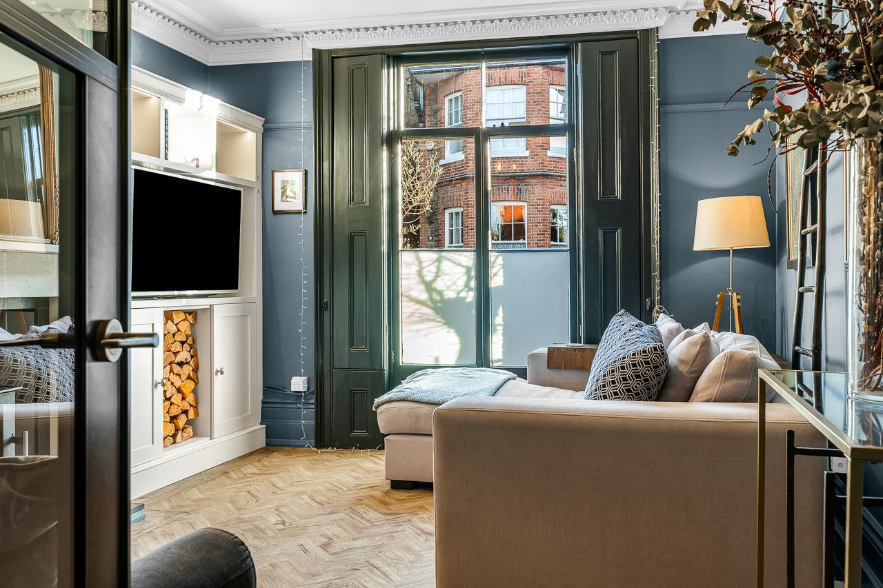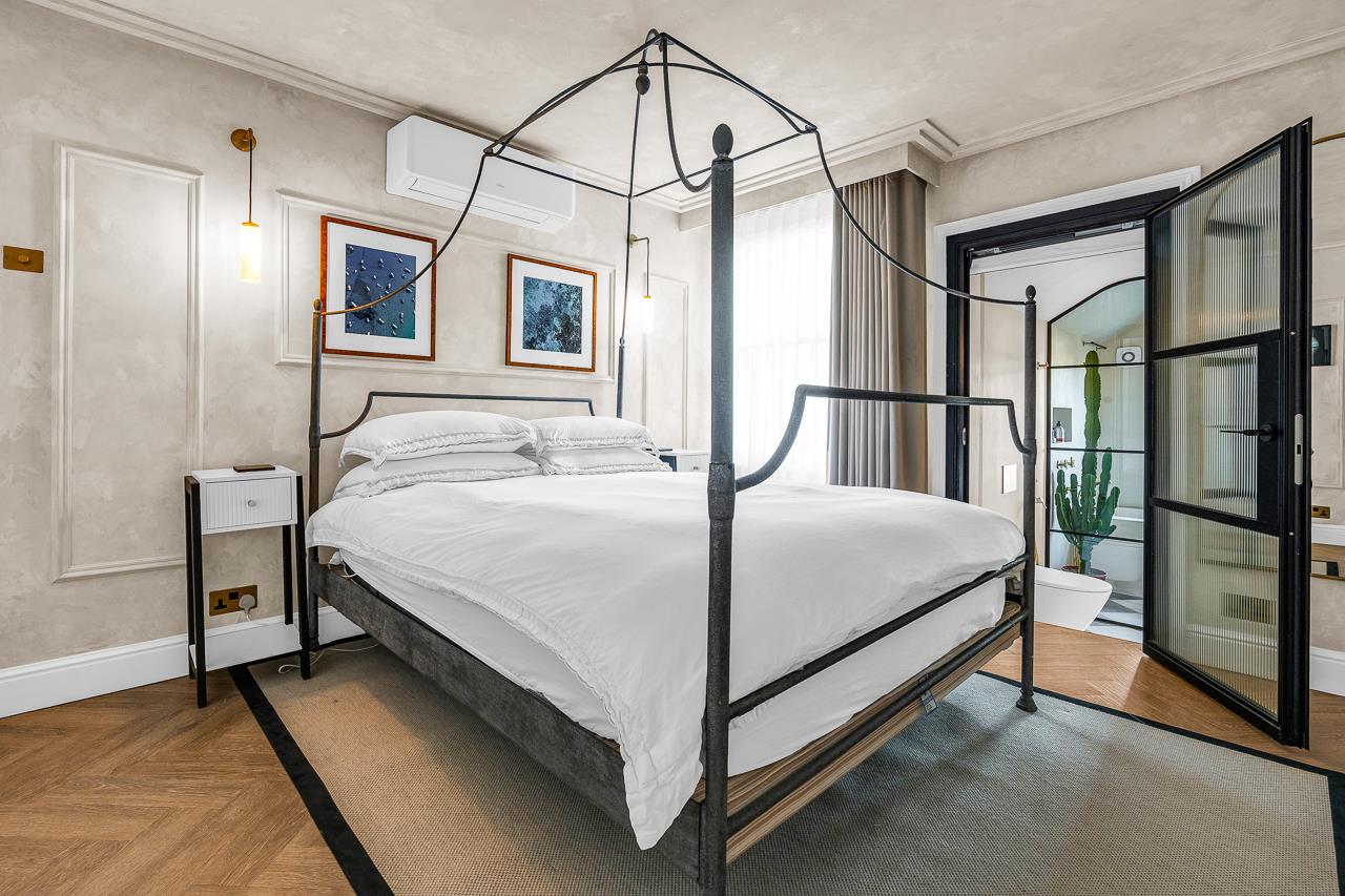 Across the upper floors are three generous bedrooms, all with air conditioning, bespoke fitted wardrobes and elegant finishes. Two luxury bathrooms have been recently refitted with premium materials, underfloor heating and newly fitted sash windows suitable for shower use.