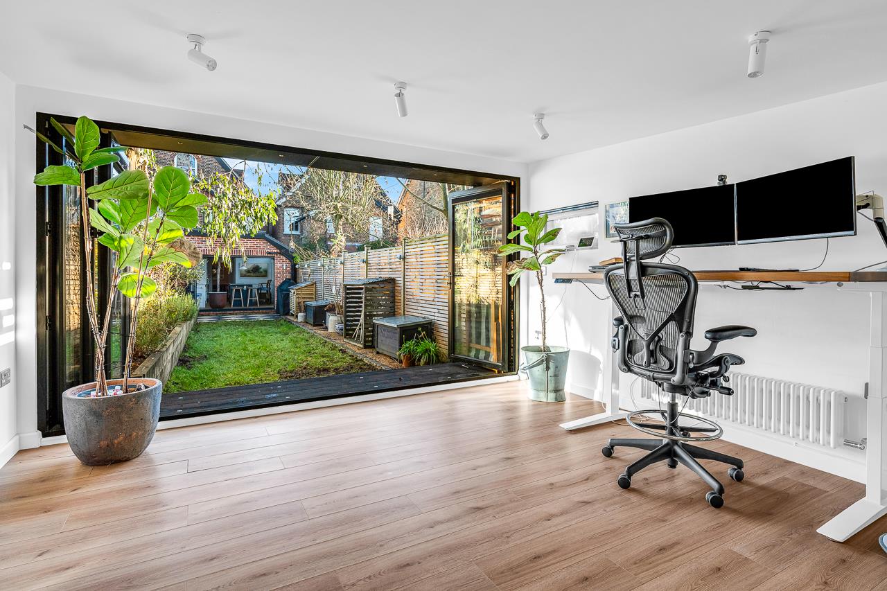 Outside, the landscaped rear garden balances patio seating and lawn, leading to a superb garden office/studio installed in July 2023. Fully insulated and finished to a high standard with bi-fold doors, heating, wired ethernet and wooden flooring, it is ideal for home working or creative use.