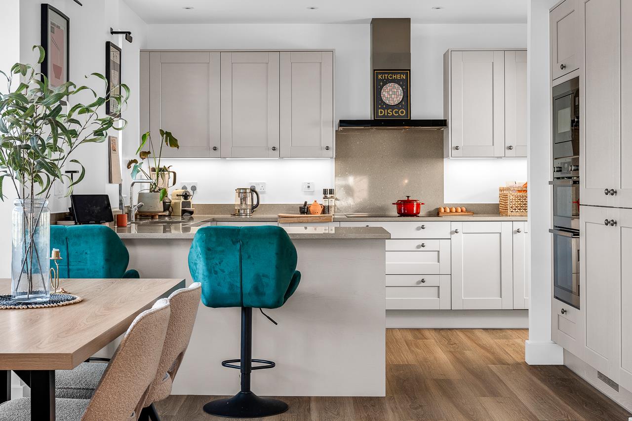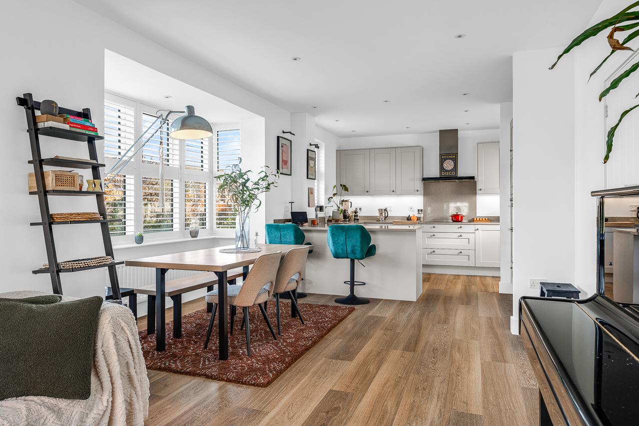 A welcoming entrance hall with understairs storage leads to a cloakroom/WC and staircase to the first floor. The heart of the home is a stunning open-plan kitchen/dining/family room, fitted with high-spec cabinetry, integrated appliances, and sleek stone-effect work surfaces. Twin bay windows fill the space with light, creating the perfect setting for everyday living and entertaining. A separate utility room offers added convenience and direct garden access.