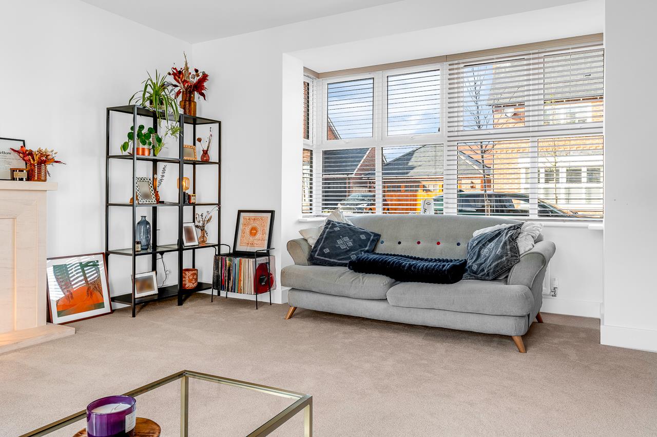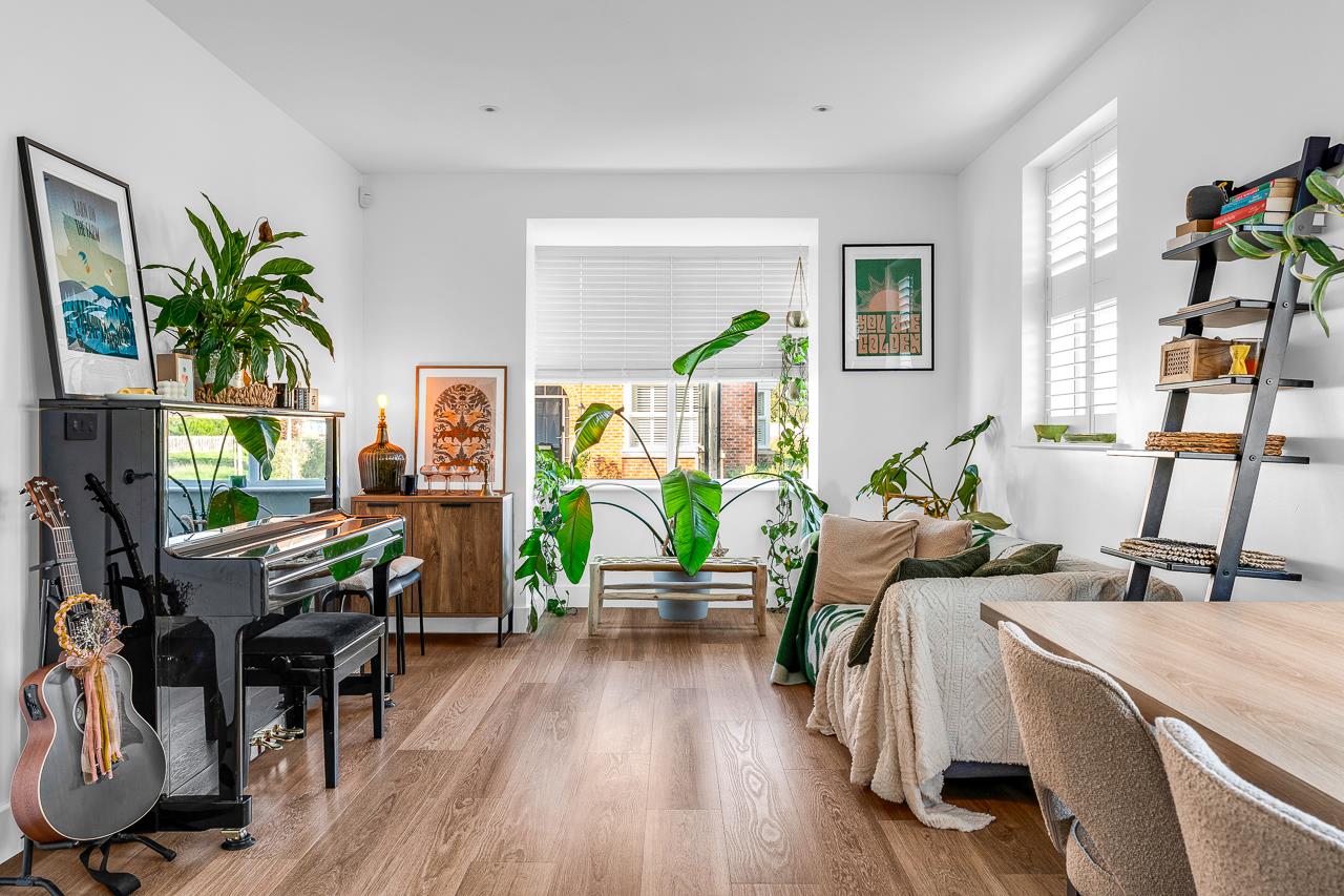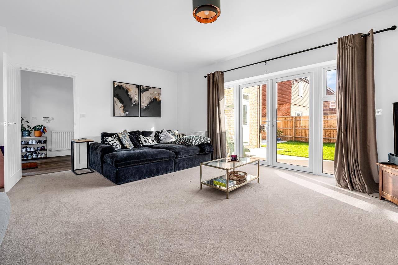 The spacious living room features a large bay window and French doors opening to the rear garden, blending indoor and outdoor living seamlessly.