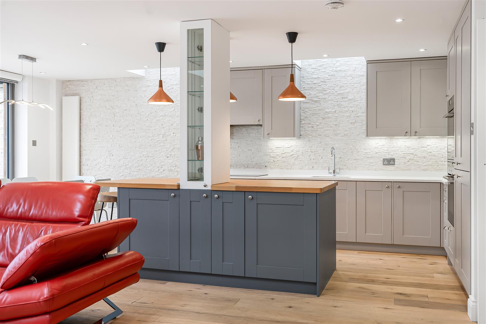The contemporary kitchen features a comprehensive range of cabinetry, integrated appliances and generous work surfaces. A central island provides additional preparation space and informal seating, enhancing the sociable layout.