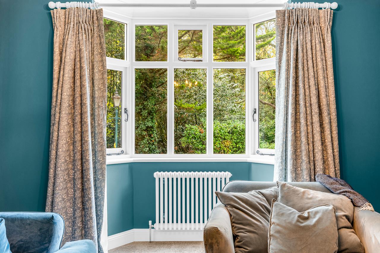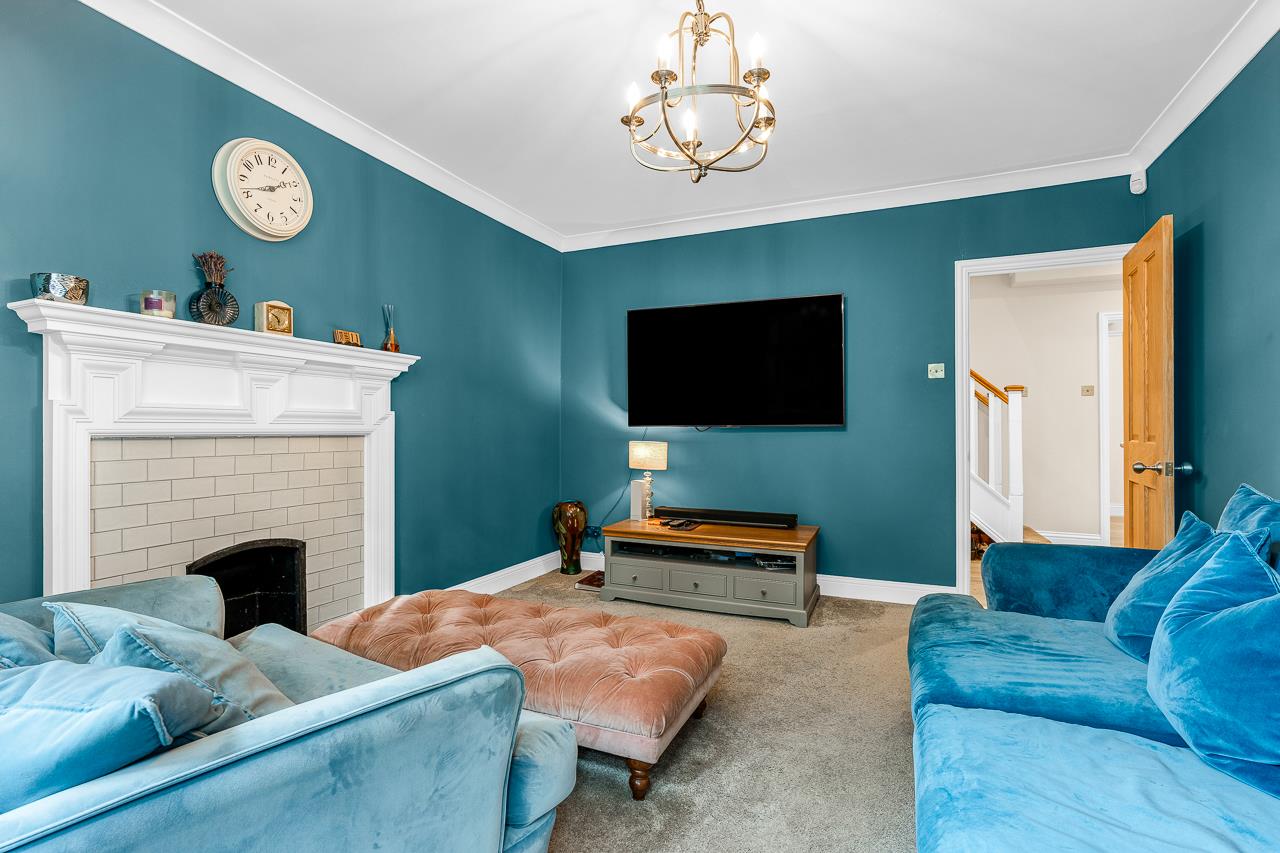 A welcoming entrance hall with engineered oak flooring and a graceful staircase sets the tone for the home. To the front, a charming living room with bay window and fireplace provides a cosy retreat, while a versatile study/playroom opposite also enjoys a feature fireplace.