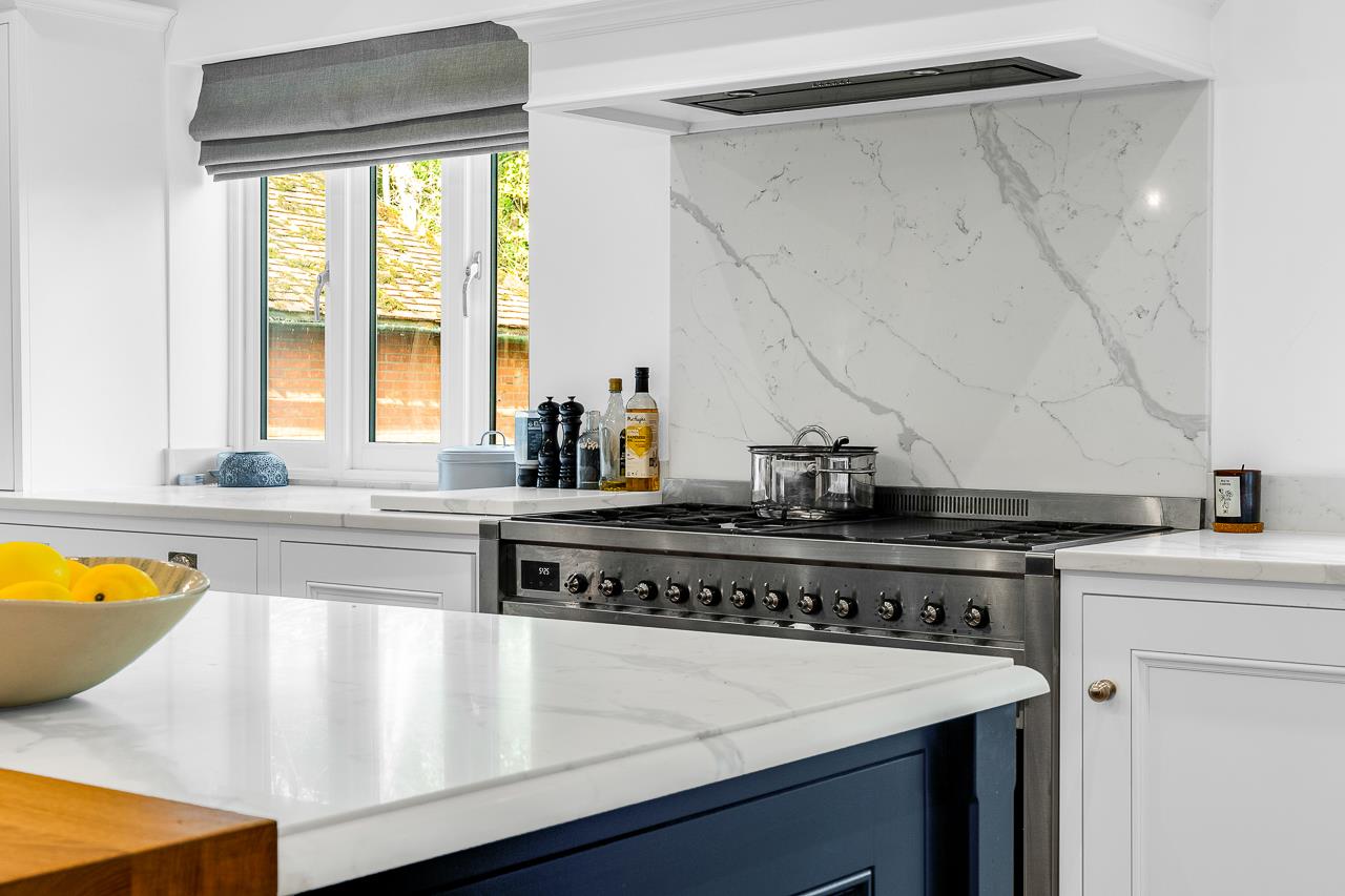 At the rear, the double-aspect sitting room opens through French doors to the garden, filling the space with light. The oak flooring continues into the stunning open-plan kitchen/dining room — the true heart of the home — featuring a wood-burning stove, bespoke cabinetry with granite-style worktops, and a large island with breakfast bar. French doors open to the terrace, creating a seamless indoor-outdoor flow. A utility room with garden access and a luxuriously appointed cloak/shower room complete the ground floor.
