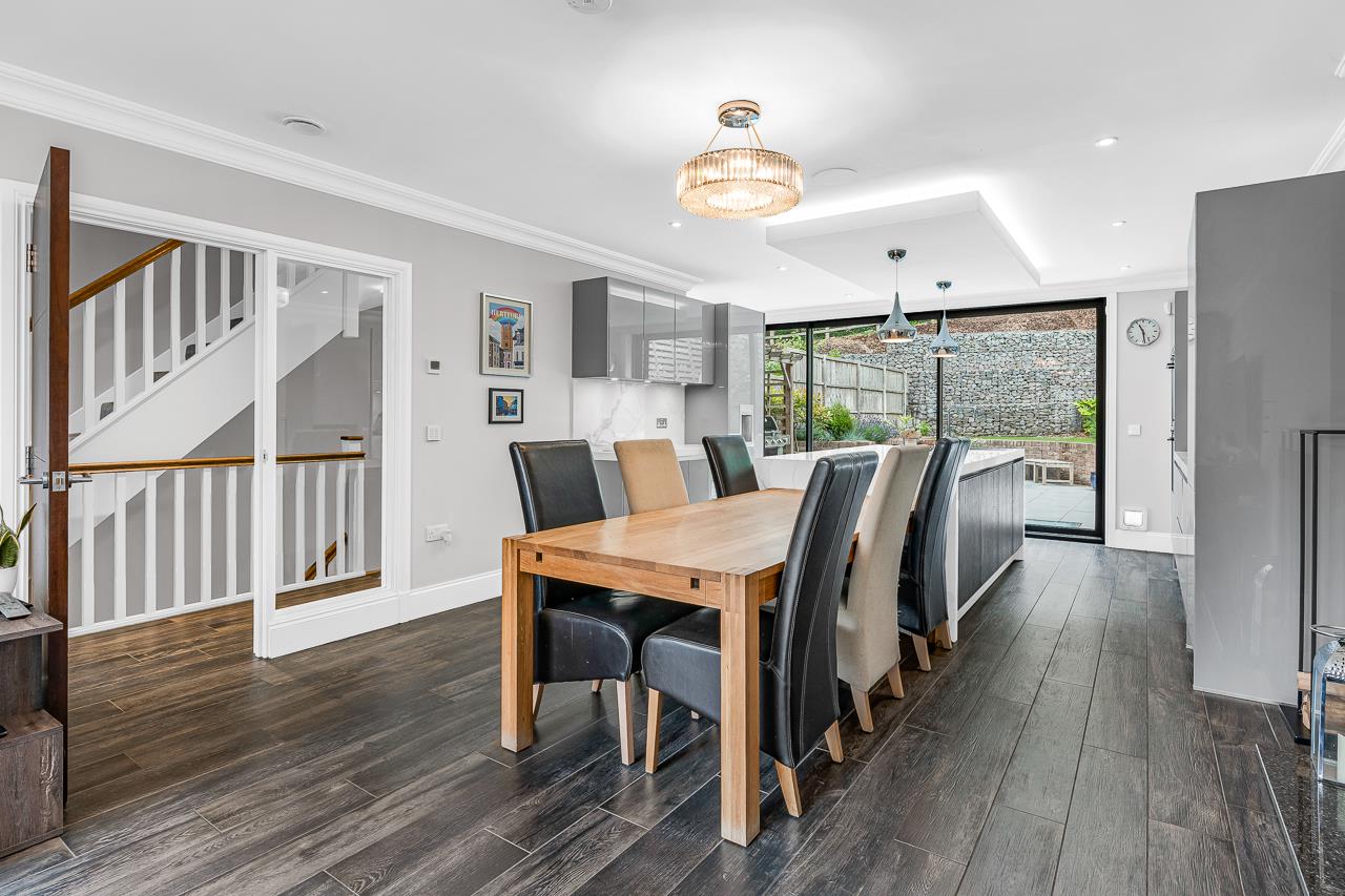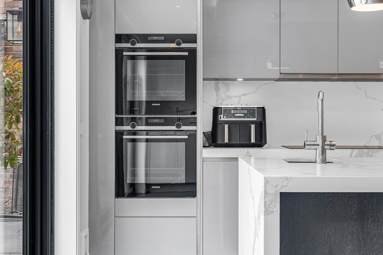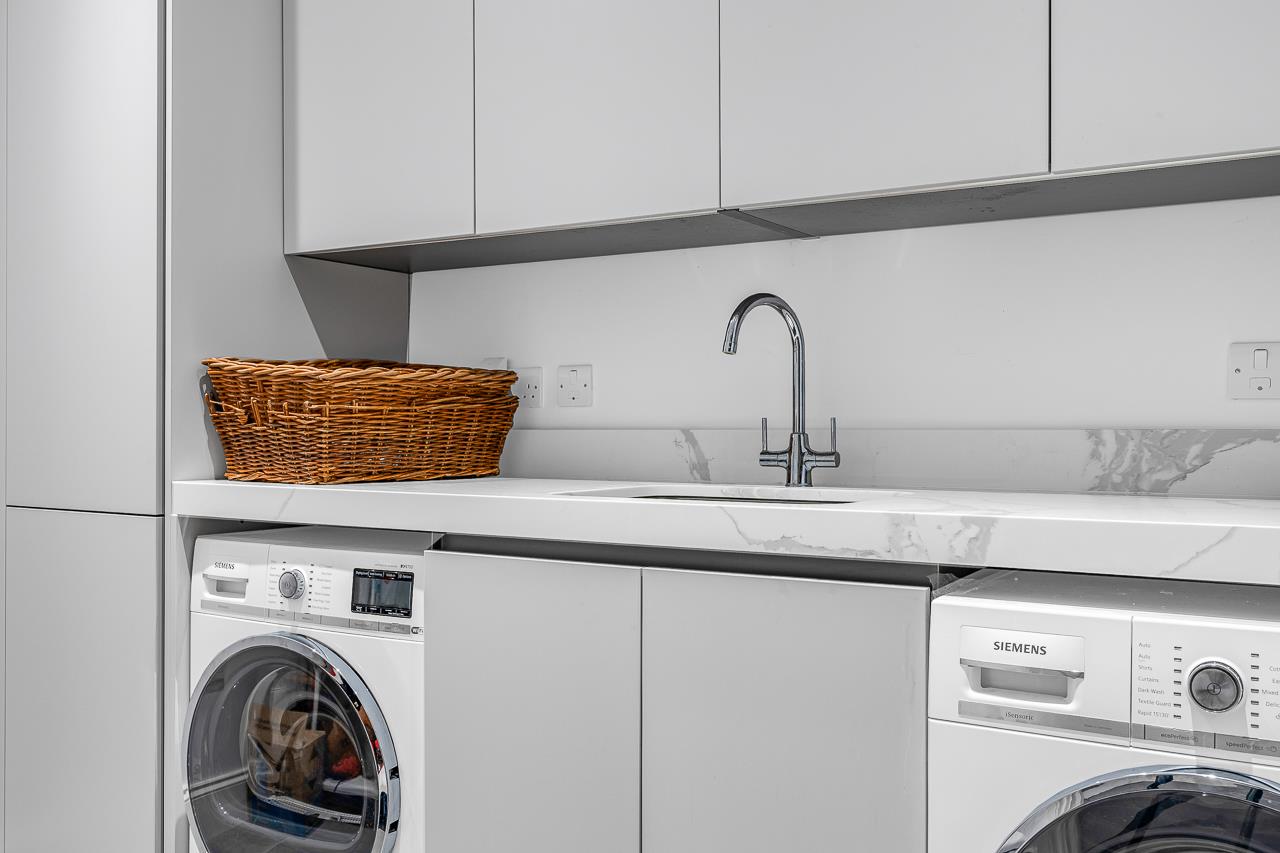 The whole of the ground floor is taken up with an extensive open plan kitchen/dining/living and utility space and a cloakroom in the hallway. The contemporary kitchen has fully integrated Siemens appliances and the sliding doors leading onto the landscaped, secluded garden make it ideal for entertaining.