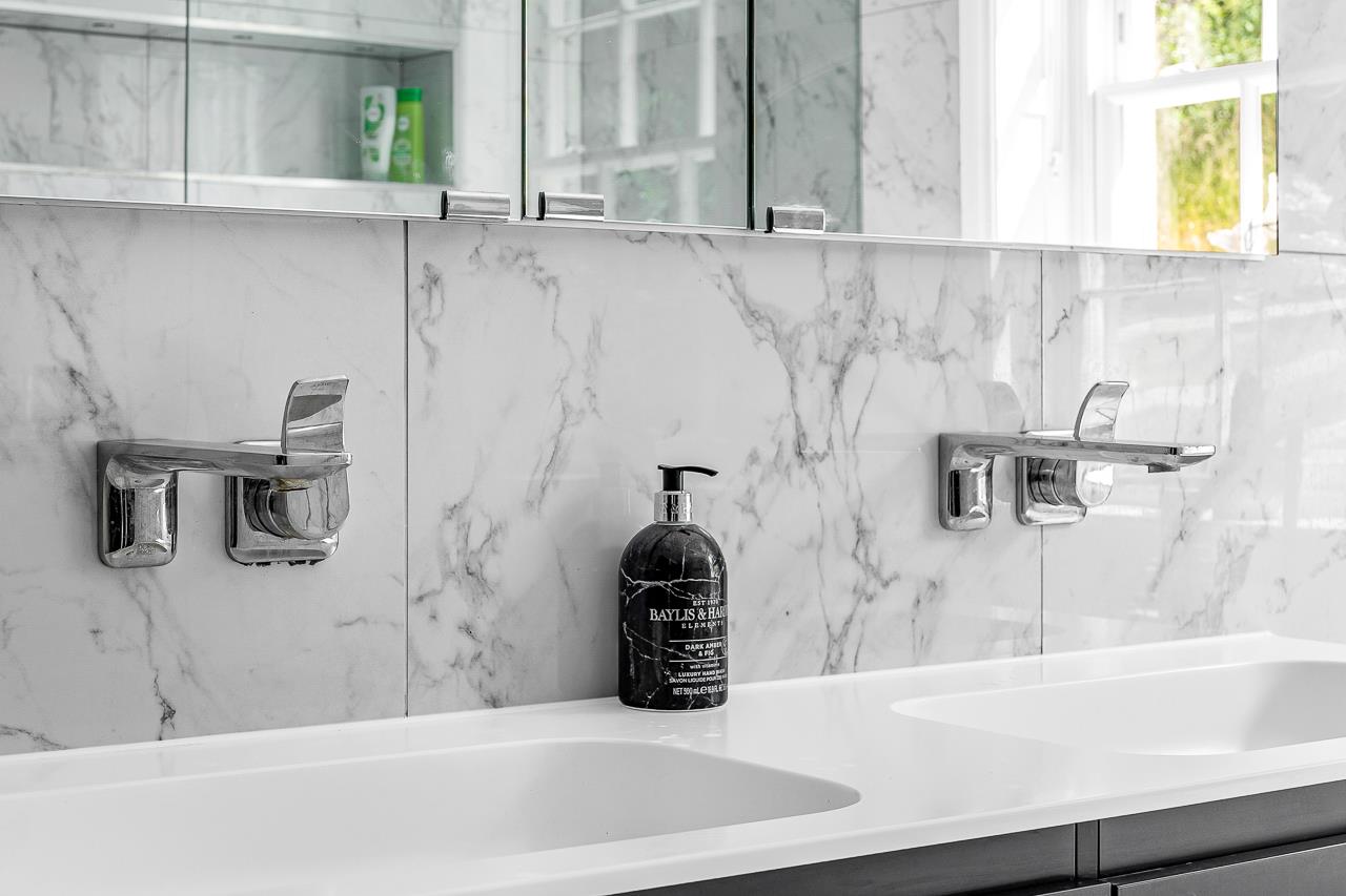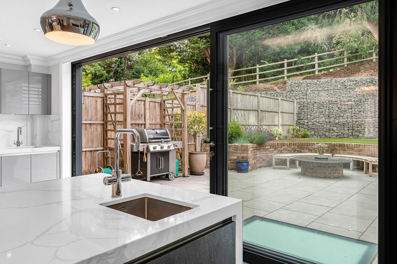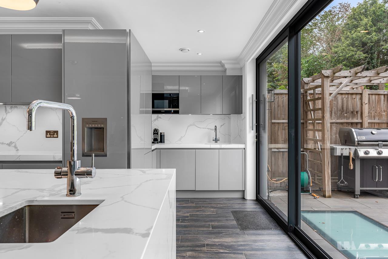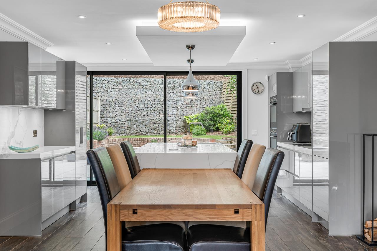 The whole of the ground floor is taken up with an extensive open plan kitchen/dining/living and utility space and a cloakroom in the hallway. The contemporary kitchen has fully integrated Siemens appliances and the sliding doors leading onto the landscaped, secluded garden make it ideal for entertaining.