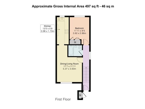 Internally, the accommodation totals approximately 497 square feet and is well laid out. There is a separate kitchen and a bright open plan living and dining area, providing comfortable space for both relaxing and entertaining. The double bedroom is generously sized, easily accommodating a king size bed, and features an integrated wardrobe for convenient storage.