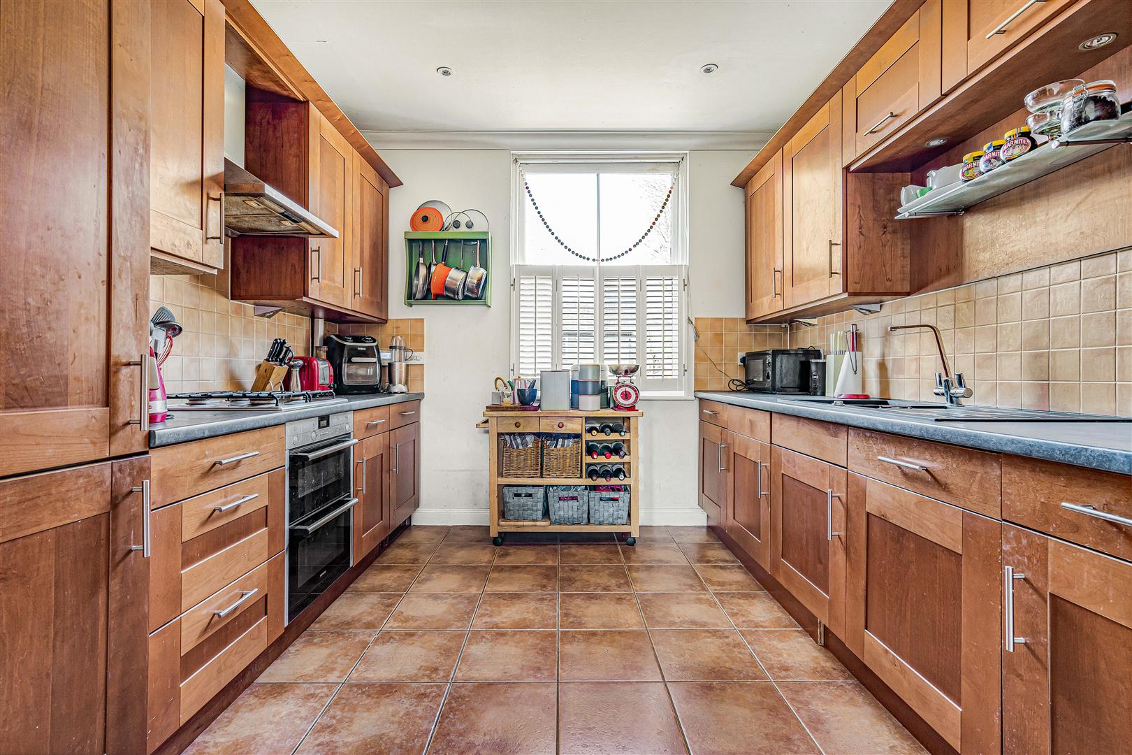 The kitchen sits at the front of the property and provides ample worktop and storage space, complete with gas hob, oven and extractor hood, as well as a window allowing for good natural light. It flows into a spacious dining area with room for a full family table, before opening into the comfortable living space at the rear. French doors lead onto a sun terrace, creating an ideal spot to relax while enjoying views across the greenery of Hartham Common.